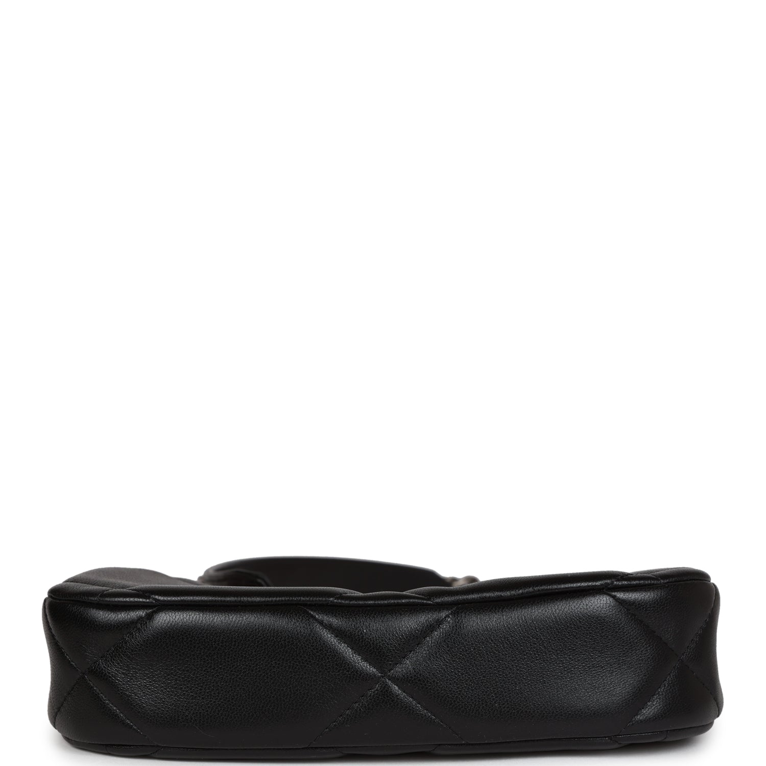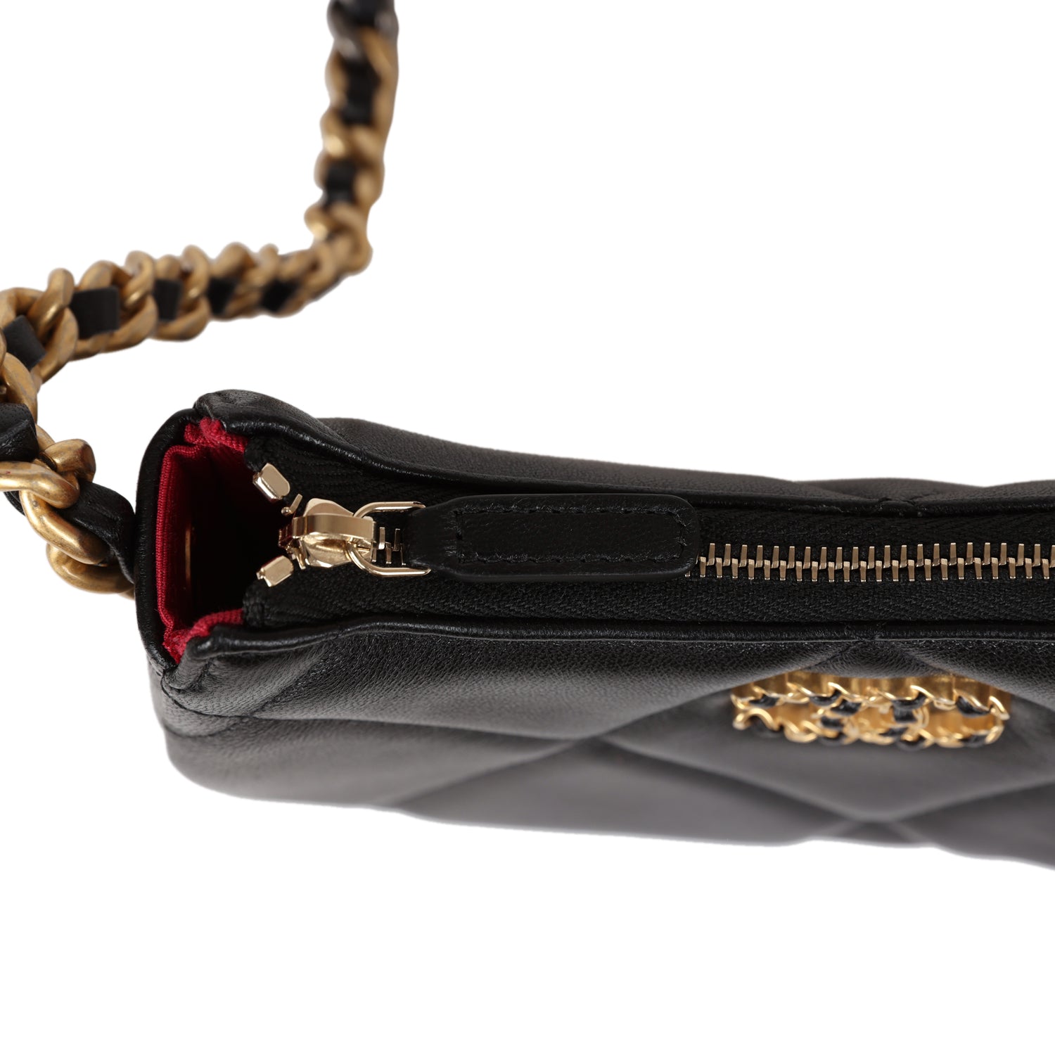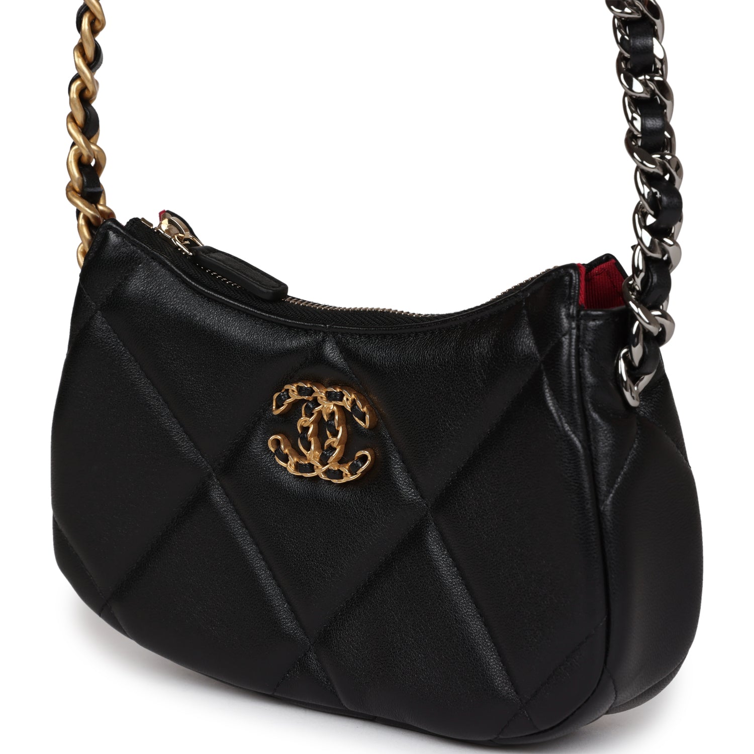 This 19 Hobo Chain is in black calfskin with mixed metal hardware and has tonal stitching. 19 style CC on front of bag. and an interwoven mixed metal chain woven with black leather.