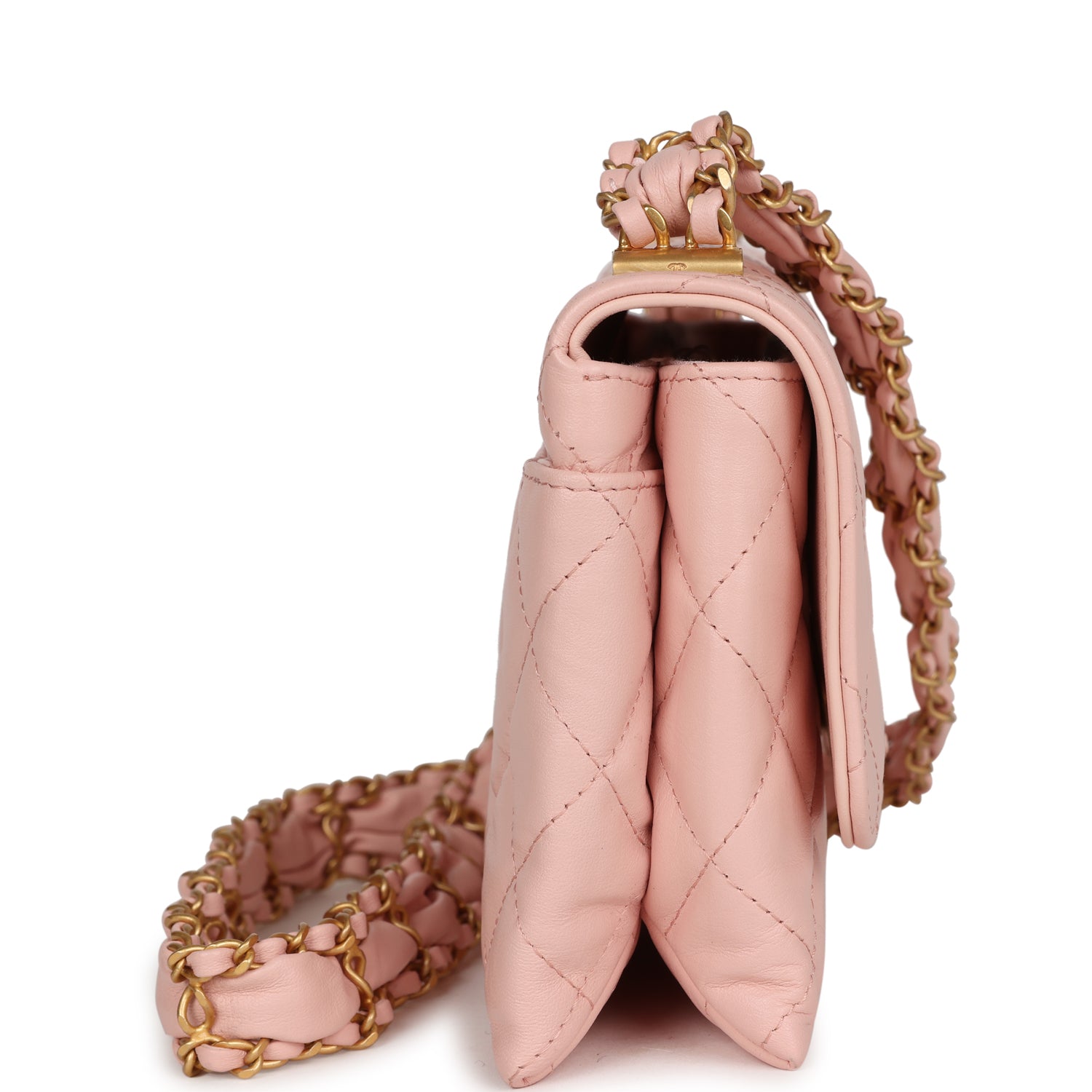 This Chanel 19 Mini Flap is in light pink aged calfskin with brushed gold hardware. tonal stitching. CC magnetic closure. interwoven brushed gold chainlink woven with thick aged calfskin.
