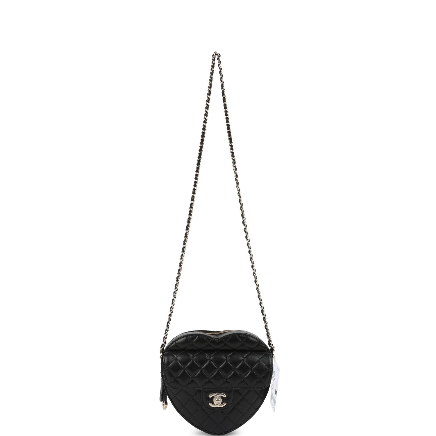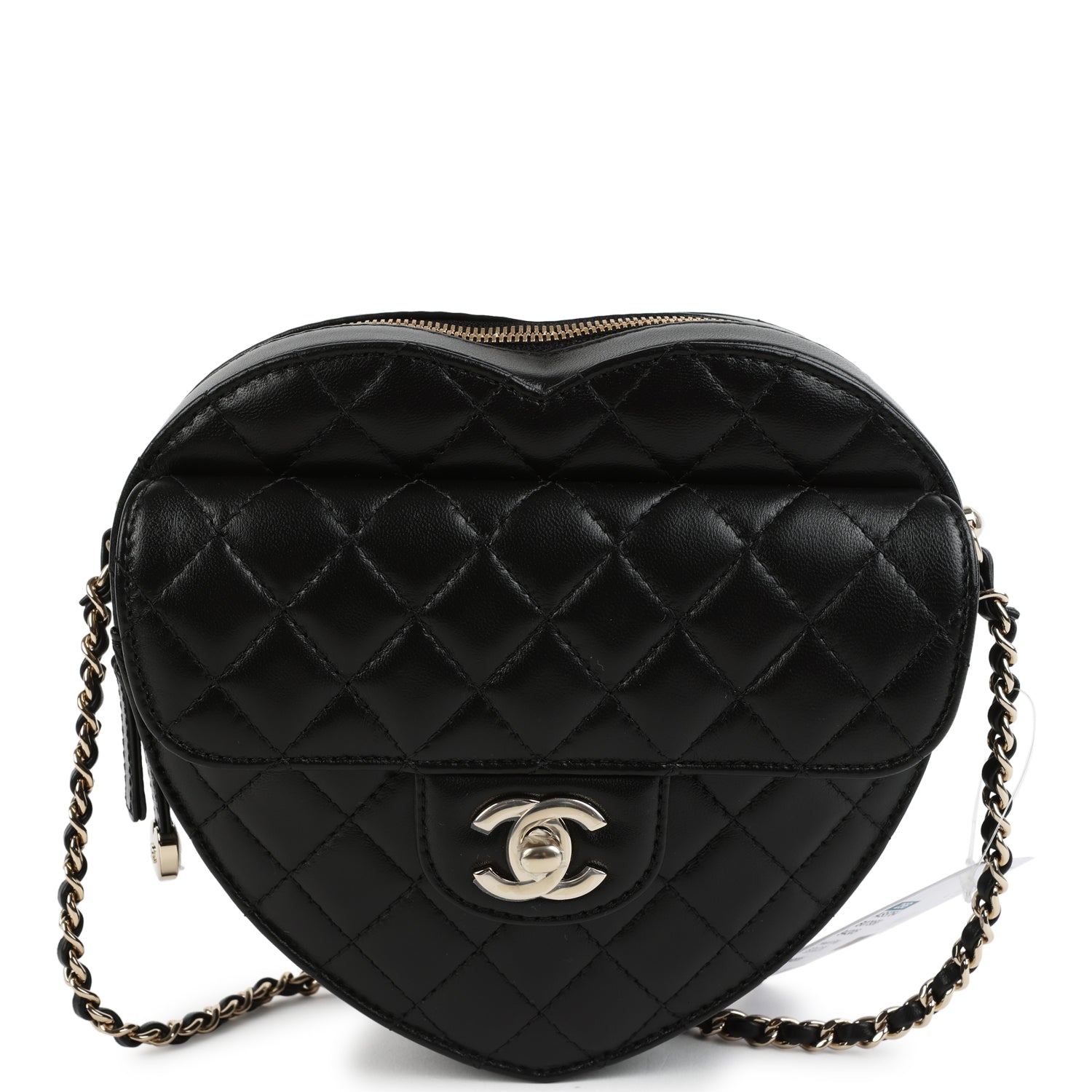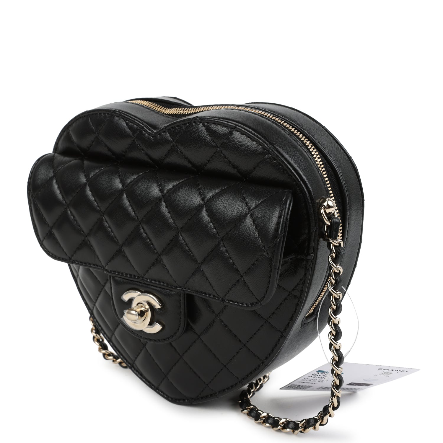 This Large CC In Love Heart Bag with Chain is in black lambskin leather with light gold tone hardware and features a front flap with signature CC turnlock closure. half moon back pocket. zip top closure and an interwoven light gold tone chainlink and black leather shoulder strap.