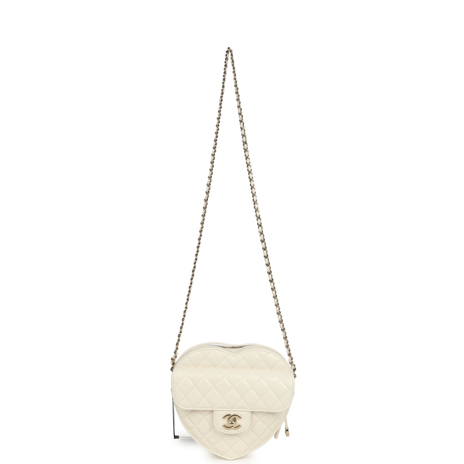This Large CC In Love Heart Bag is in white lambskin leather with light gold tone hardware and features a front flap with signature CC turnlock closure. half moon back pocket. zip top closure and an interwoven light gold tone chainlink and White leather shoulder strap.