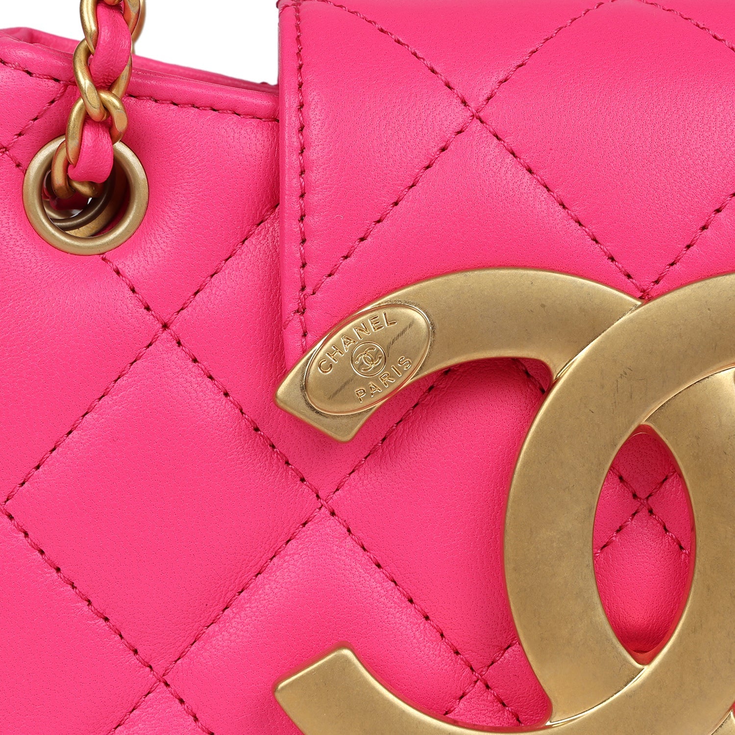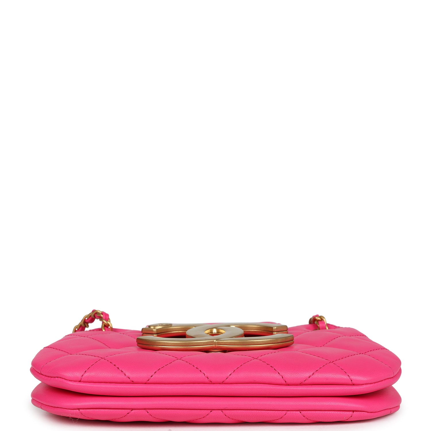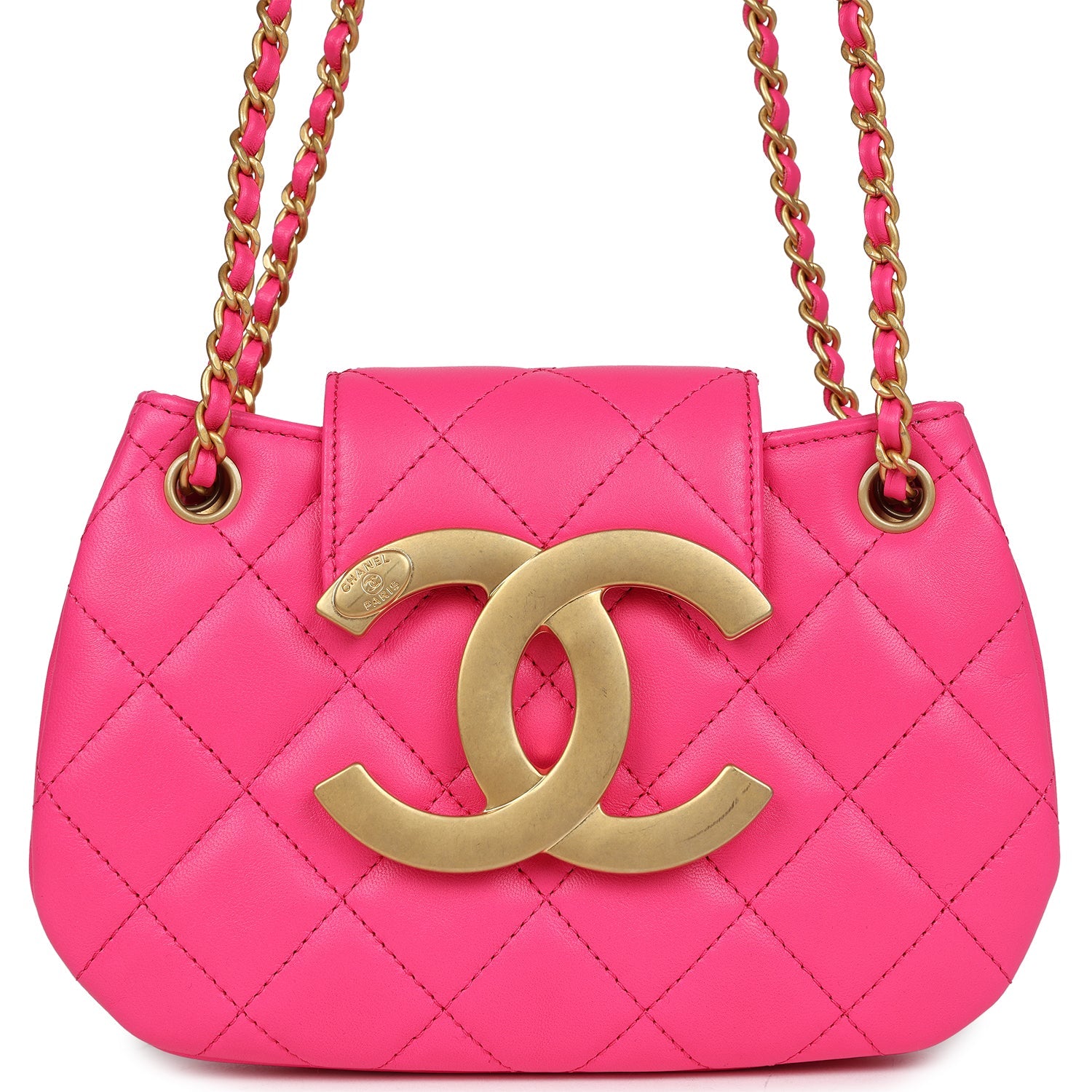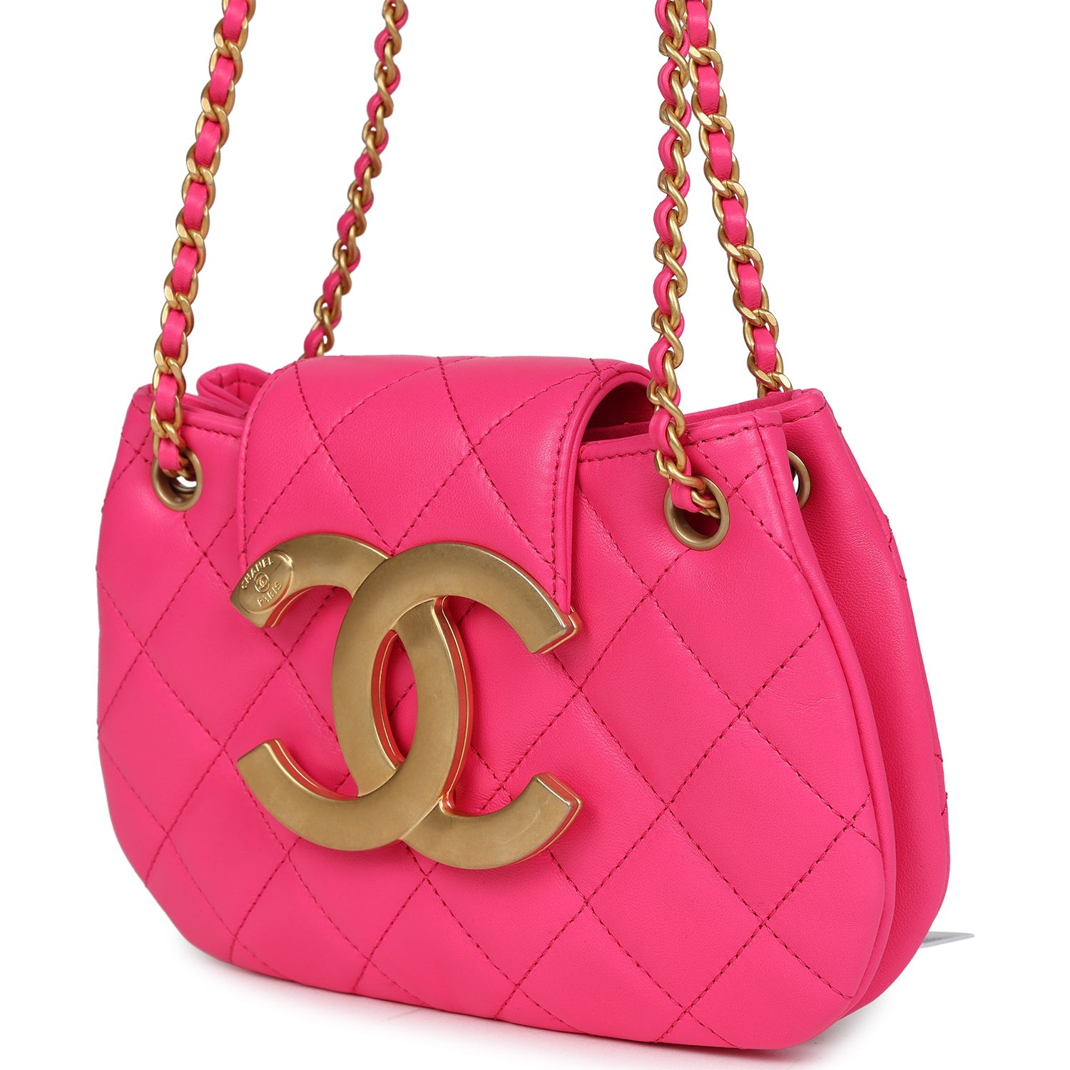 This CC Mini Shoulder Bag in fuchsia lambskin leather with antique gold hardware. features tonal stitching. round shape structure. large antique gold CC tab snap closurethat folds over front top of bag.