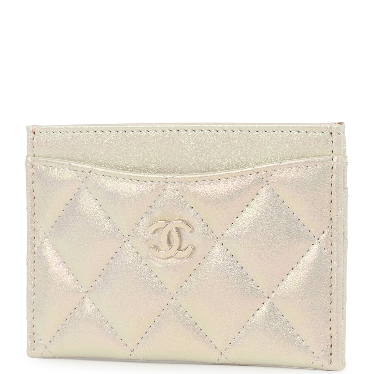 This Chanel Classic Cardholder is in iridescent ivory Lambskin leather with light gold tone hardware featuring. signature "CC" logo on the front with signature half-moon pocket on front.