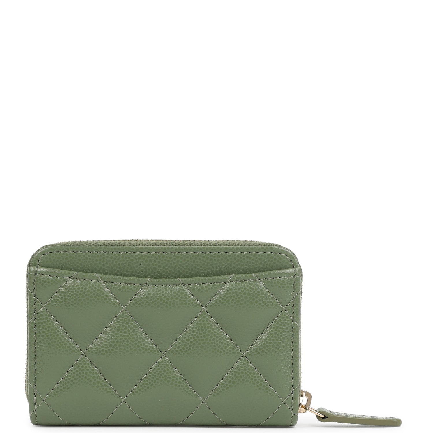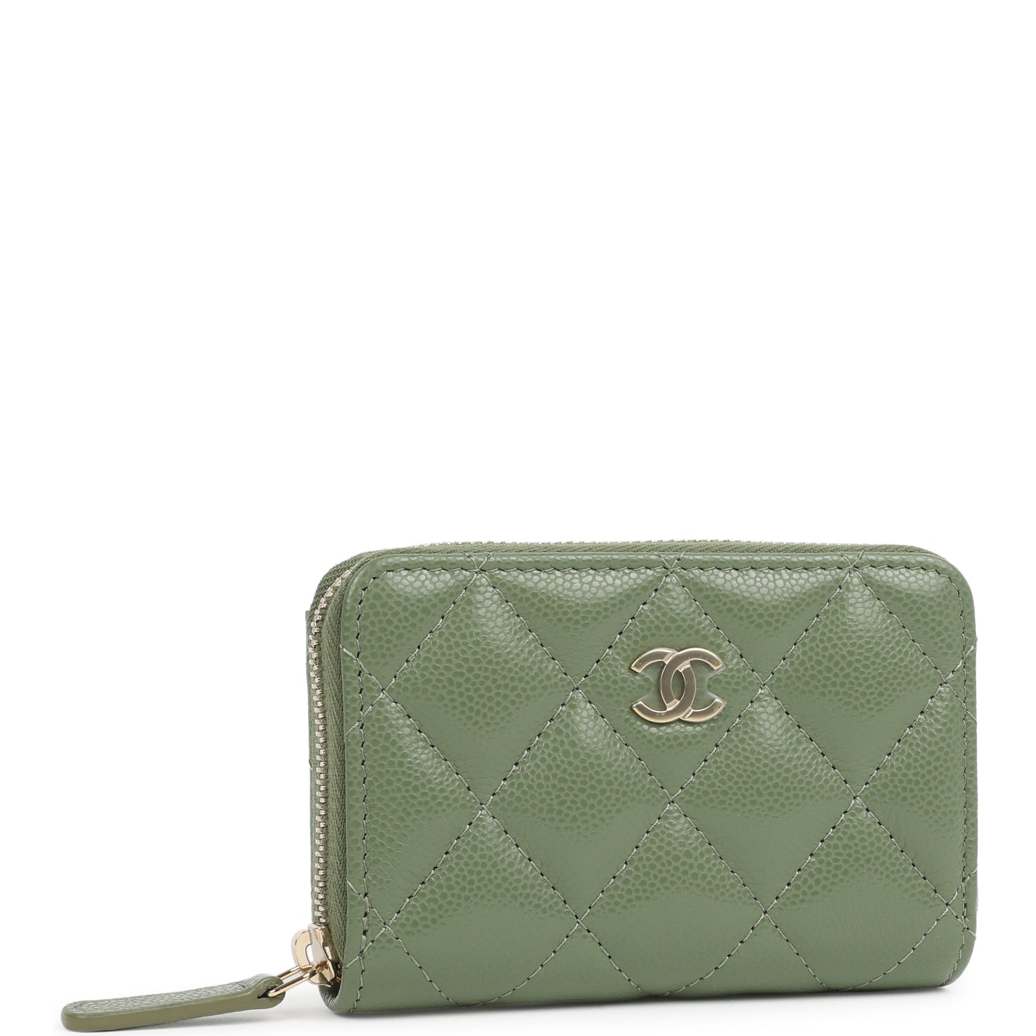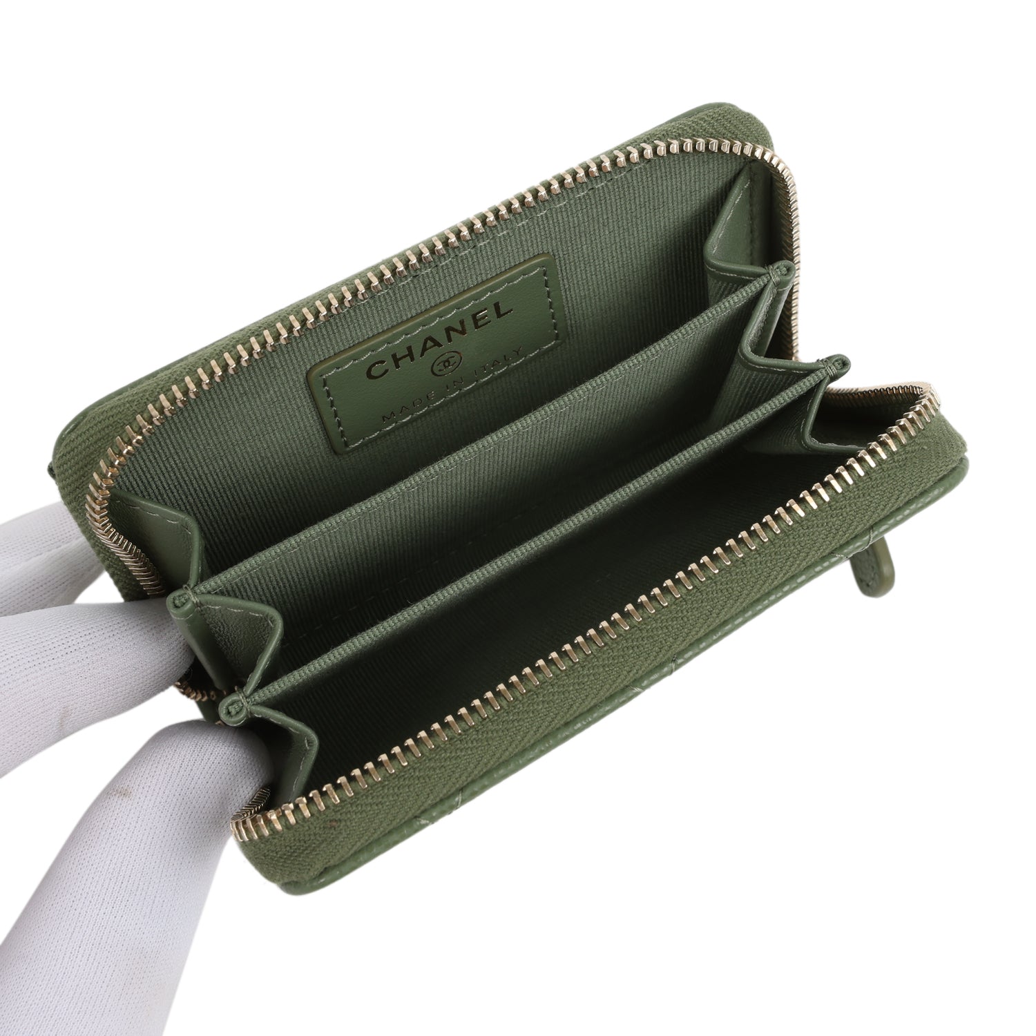 This Chanel Classic Zipped Coin Purse is in khaki shiny grained calfskin leather with light gold tone hardware. featuring tonal stitching. signature diamond quilt. signature CC logo. a zip around closure. and a back exterior card holder pocket.
