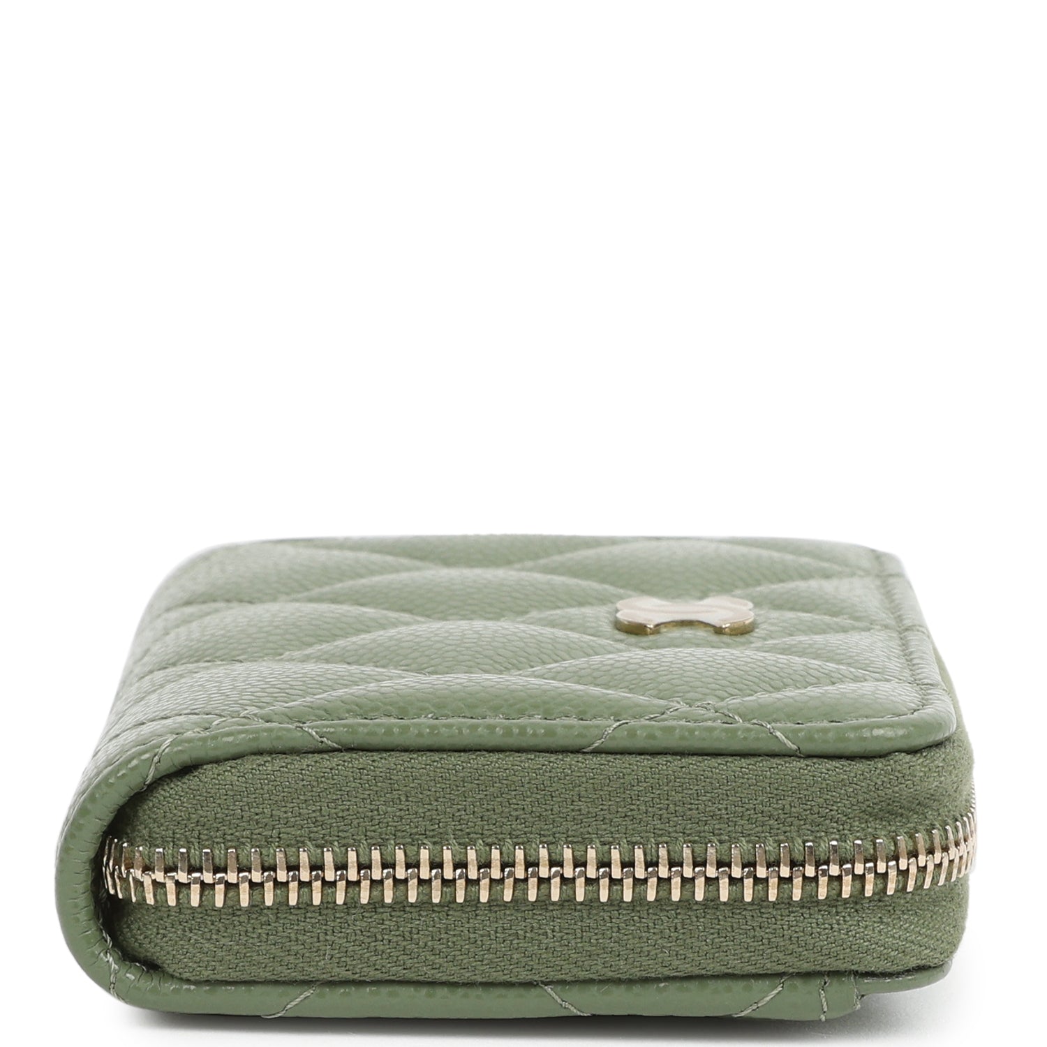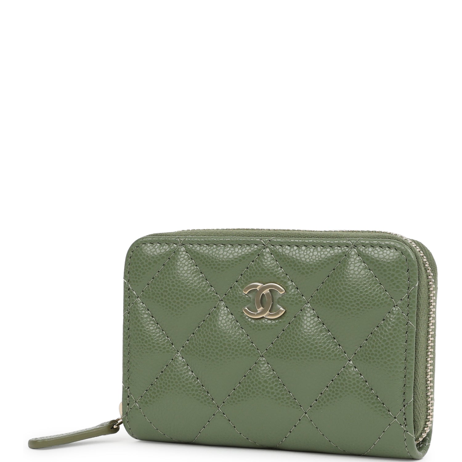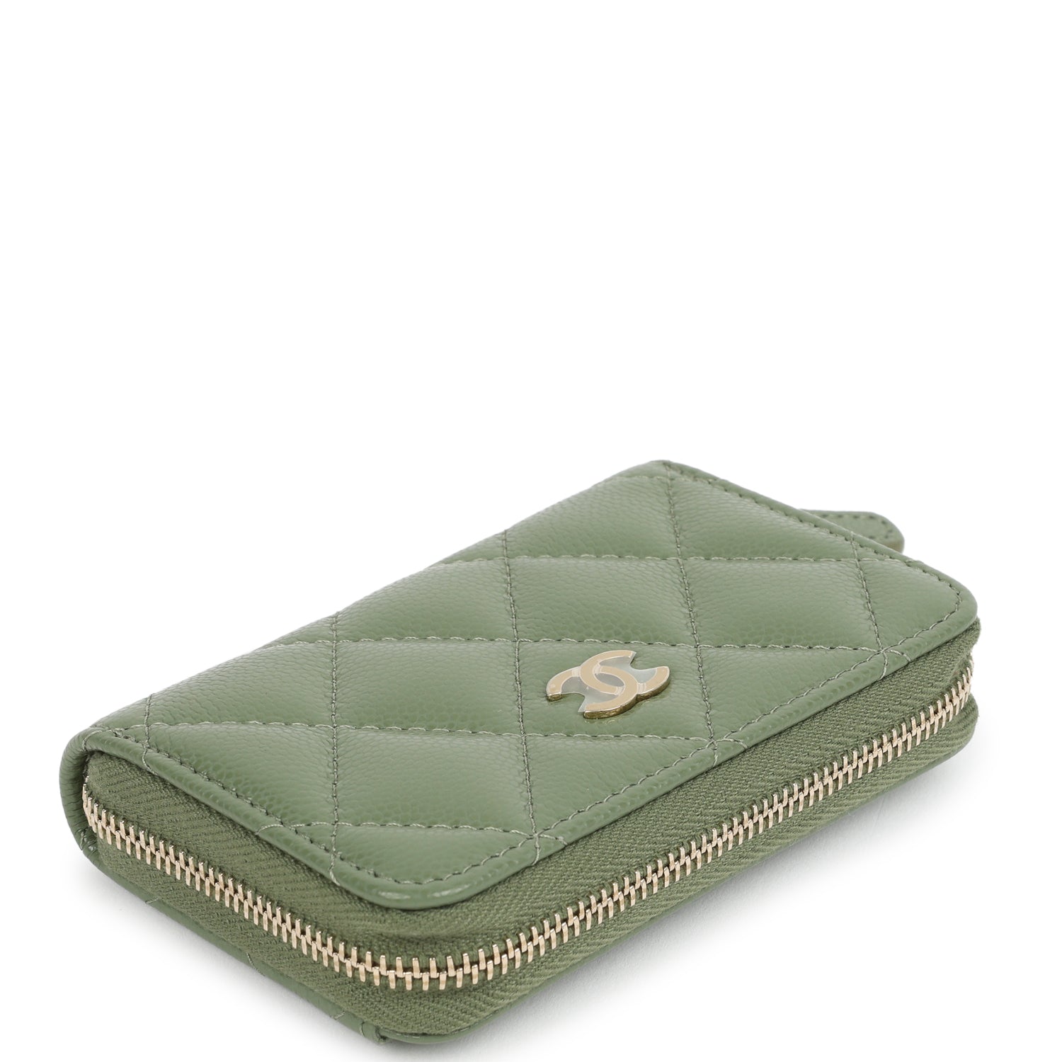 This Chanel Classic Zipped Coin Purse is in khaki shiny grained calfskin leather with light gold tone hardware. featuring tonal stitching. signature diamond quilt. signature CC logo. a zip around closure. and a back exterior card holder pocket.