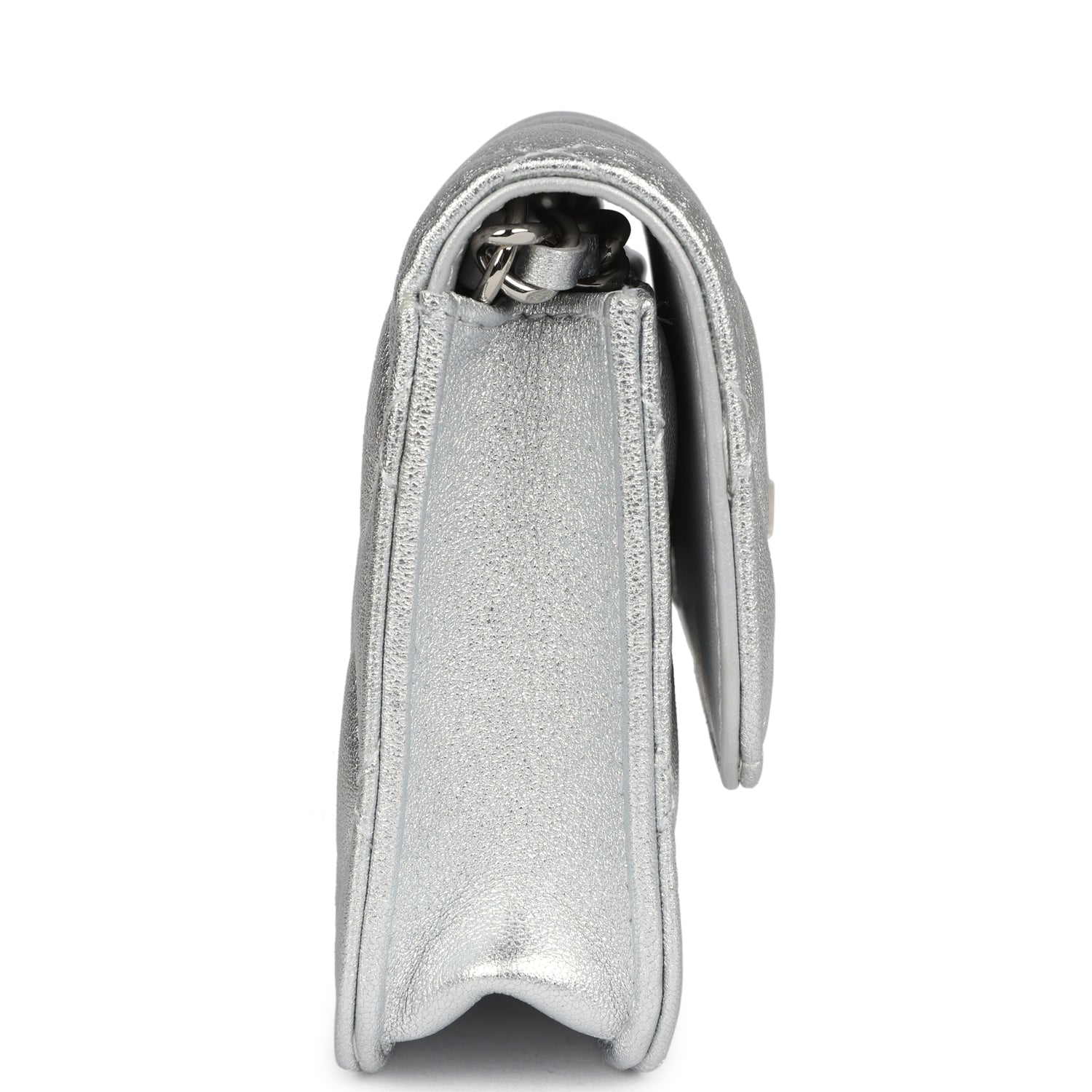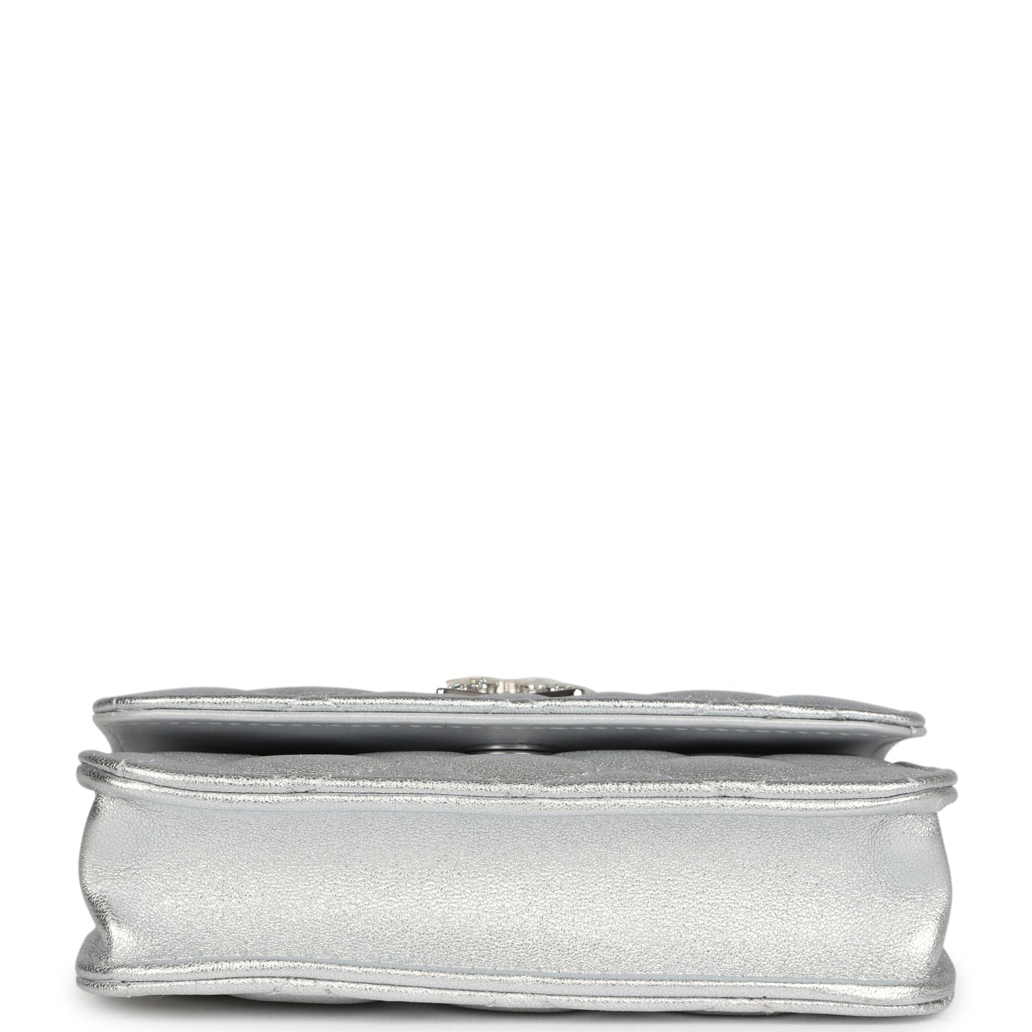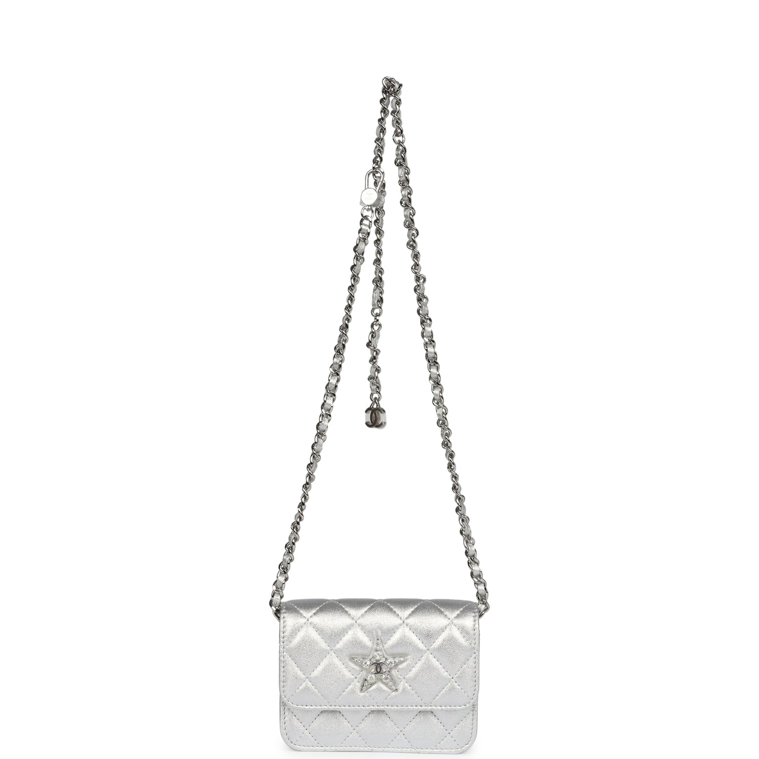 This Chanel Walk of Fame Clutch on Chain is in silver metallic quilted goatskin with silver hardware. with a signature CC front snap closure which features a crystal star motif on front flap and an interwoven silver plated chain link and silver leather strap that can be converted into a belt flap bag.