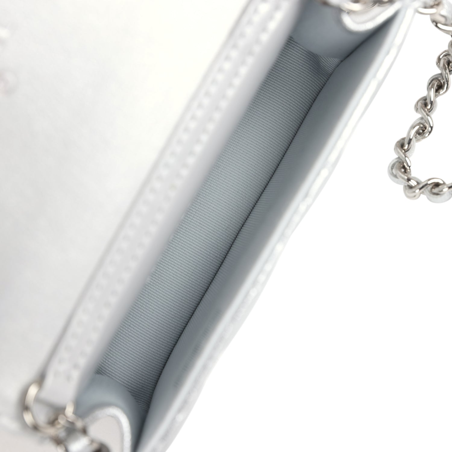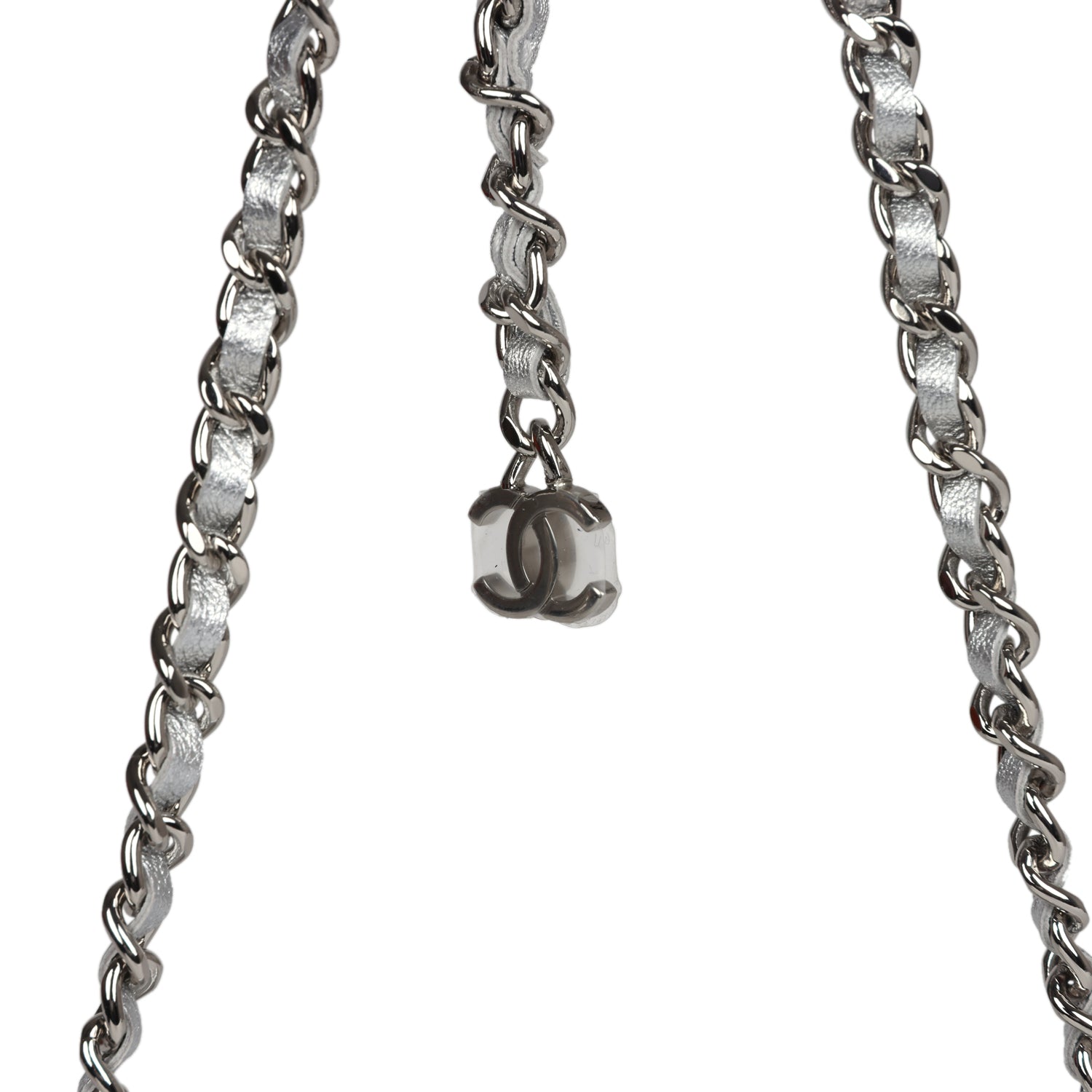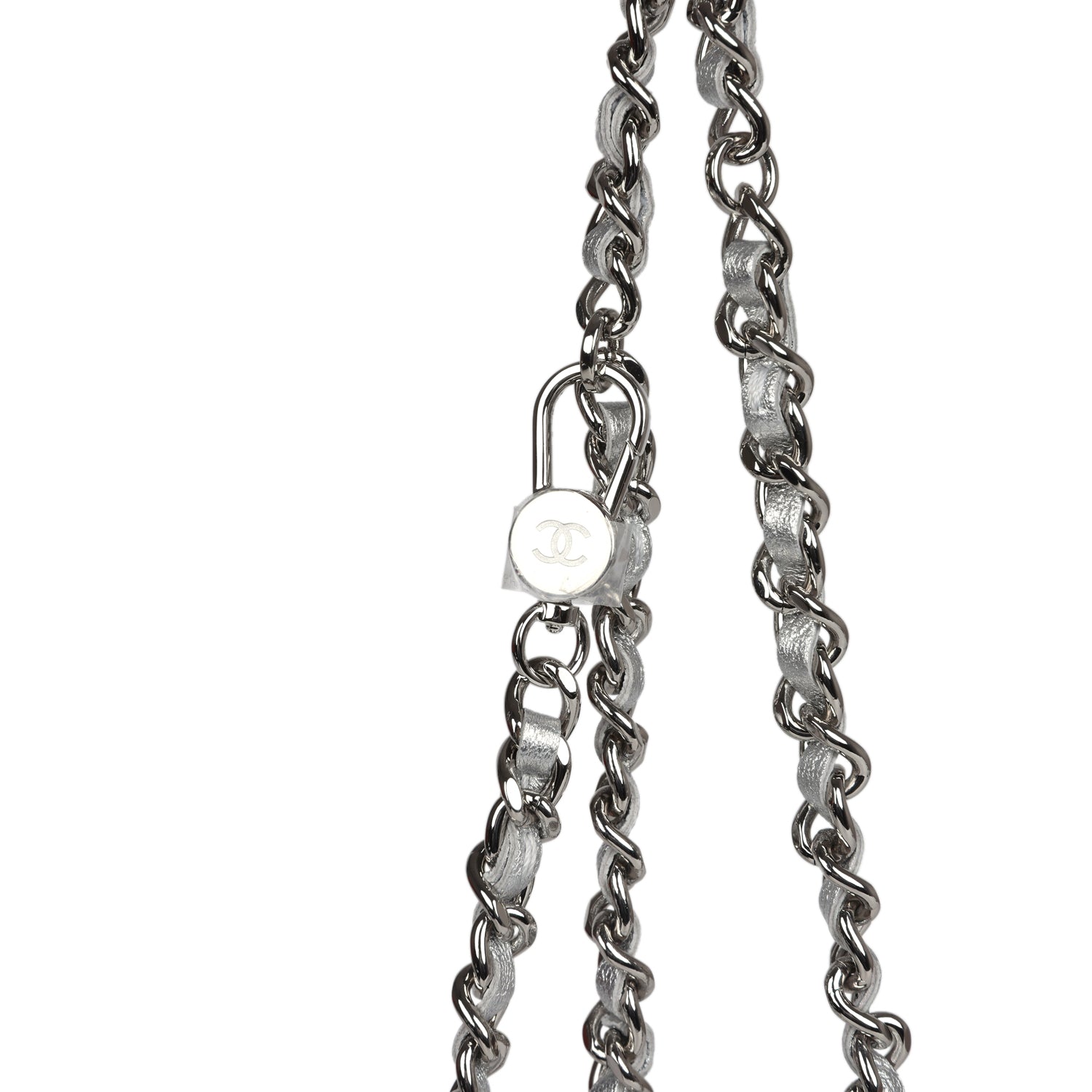 This Chanel Walk of Fame Clutch on Chain is in silver metallic quilted goatskin with silver hardware. with a signature CC front snap closure which features a crystal star motif on front flap and an interwoven silver plated chain link and silver leather strap that can be converted into a belt flap bag.