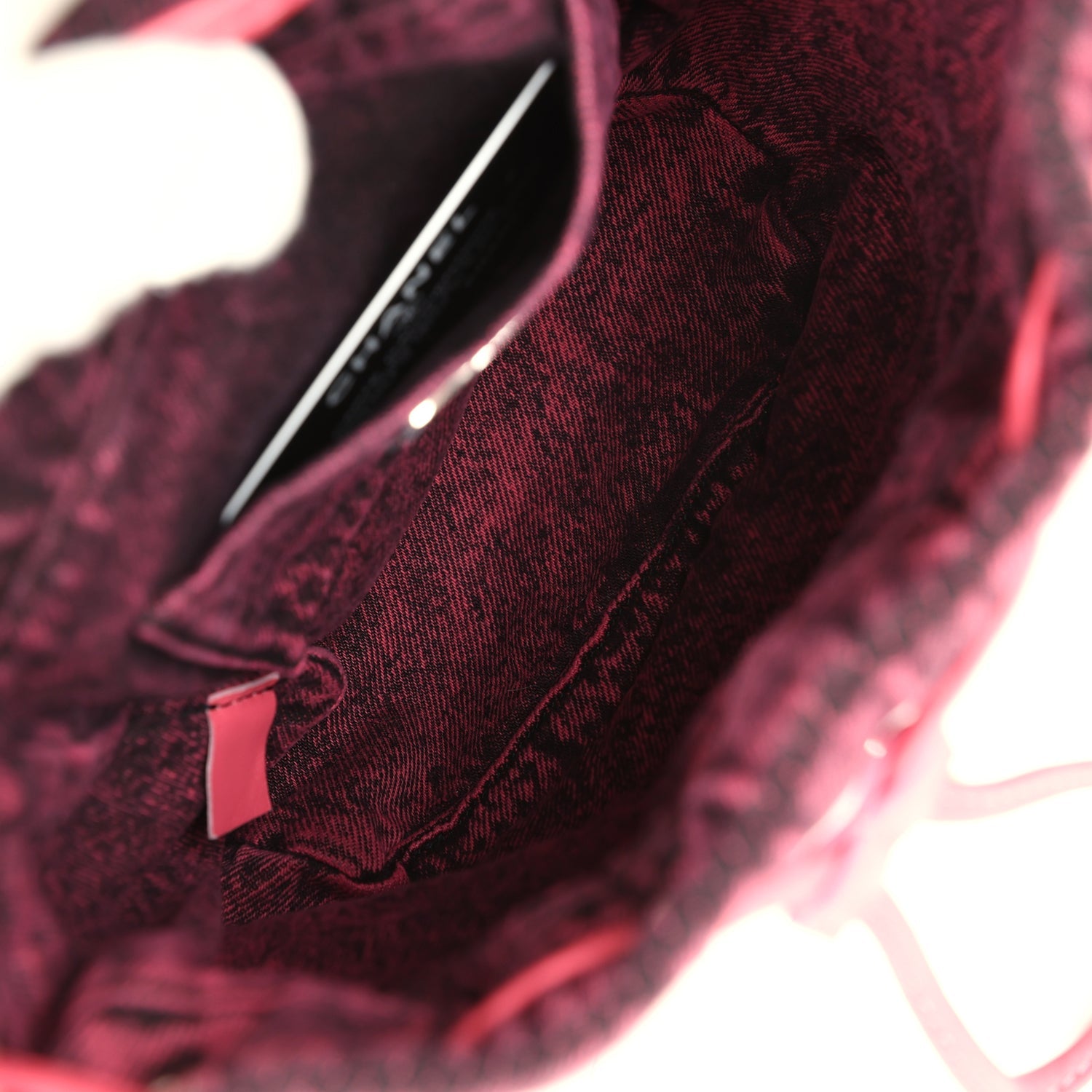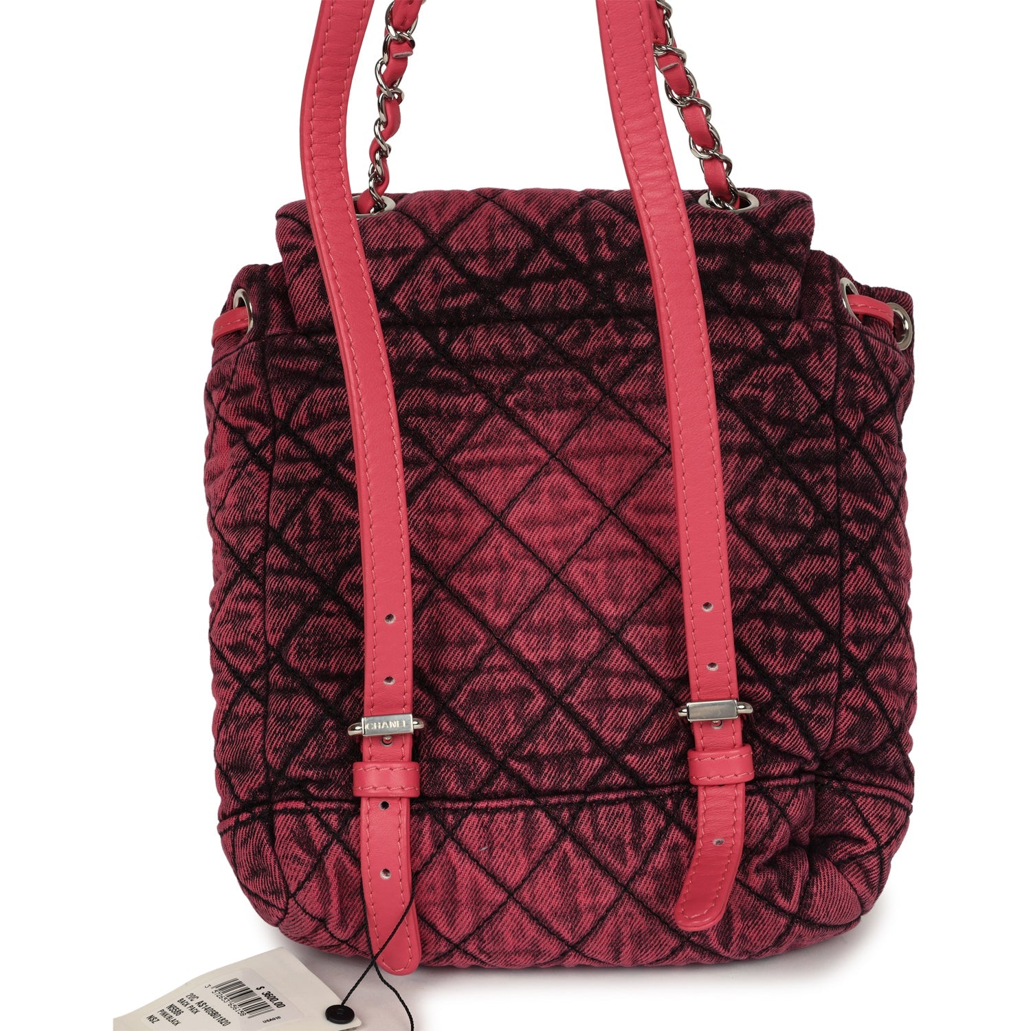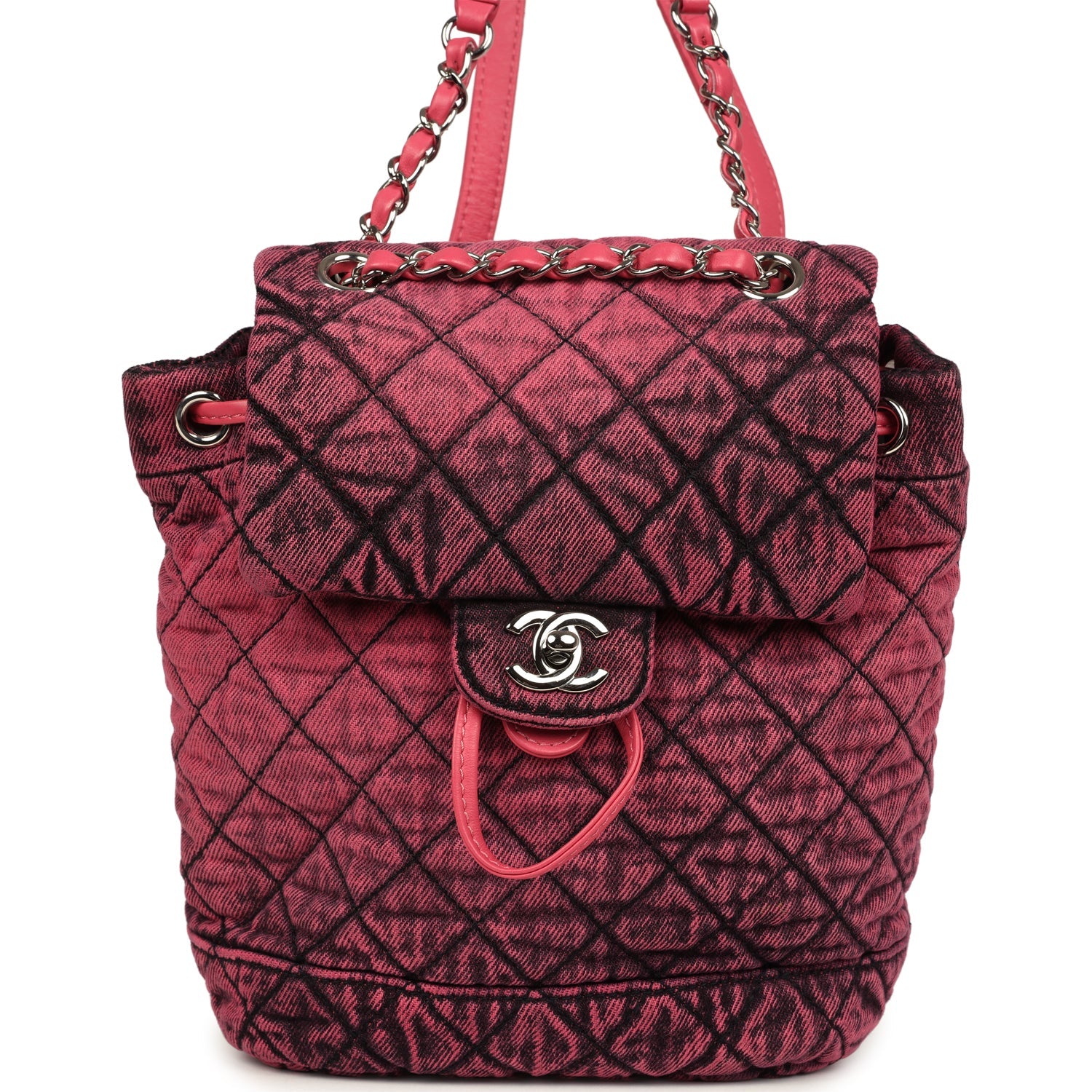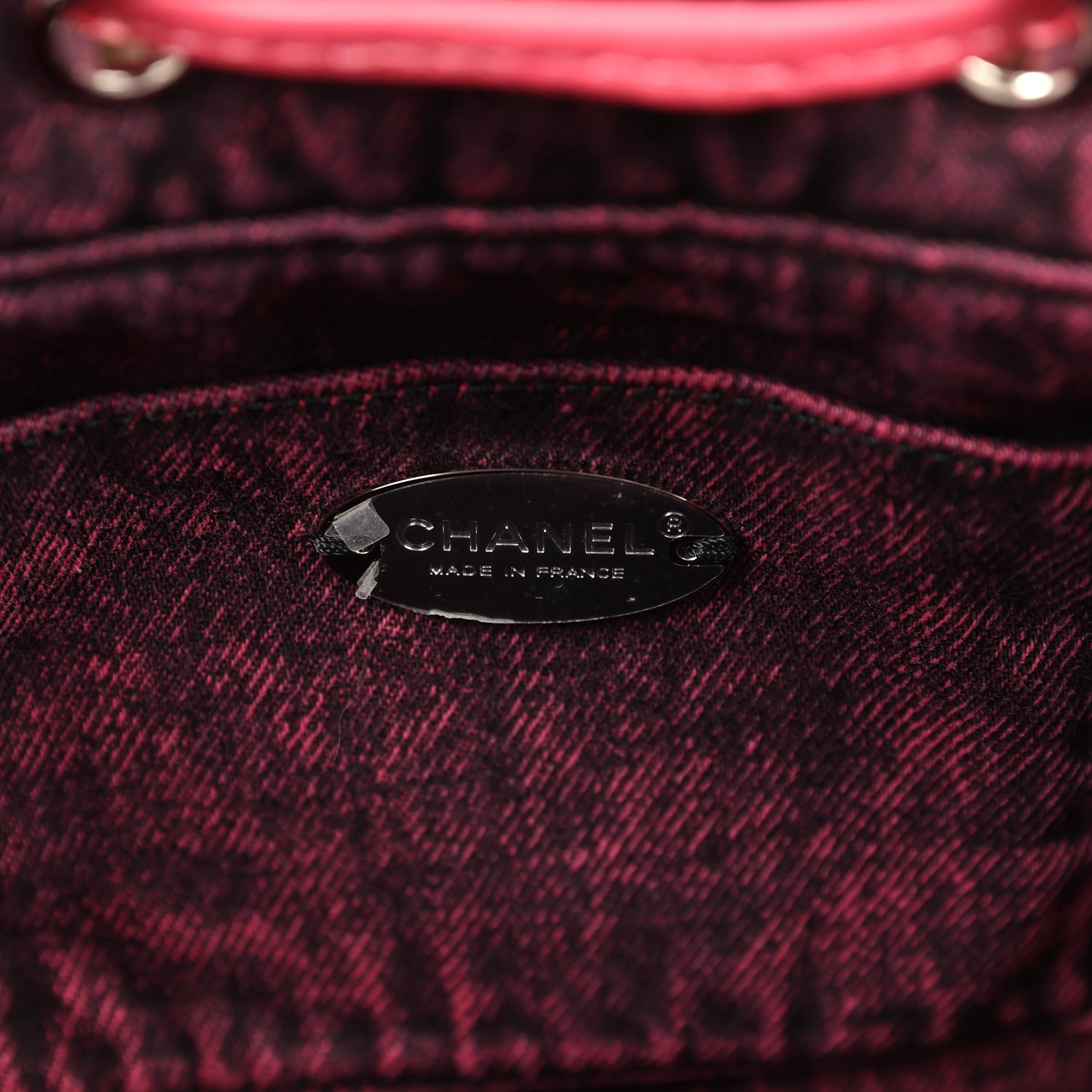 This Denimpression Urban Spirit backpack is of rose pink and black washed denim with silver tone hardware and has a front flap with signature CC logo. CC turnlock & drawstring closure. a single interwoven rose leather and silver tone chain link top handle and adjustable shoulder straps.