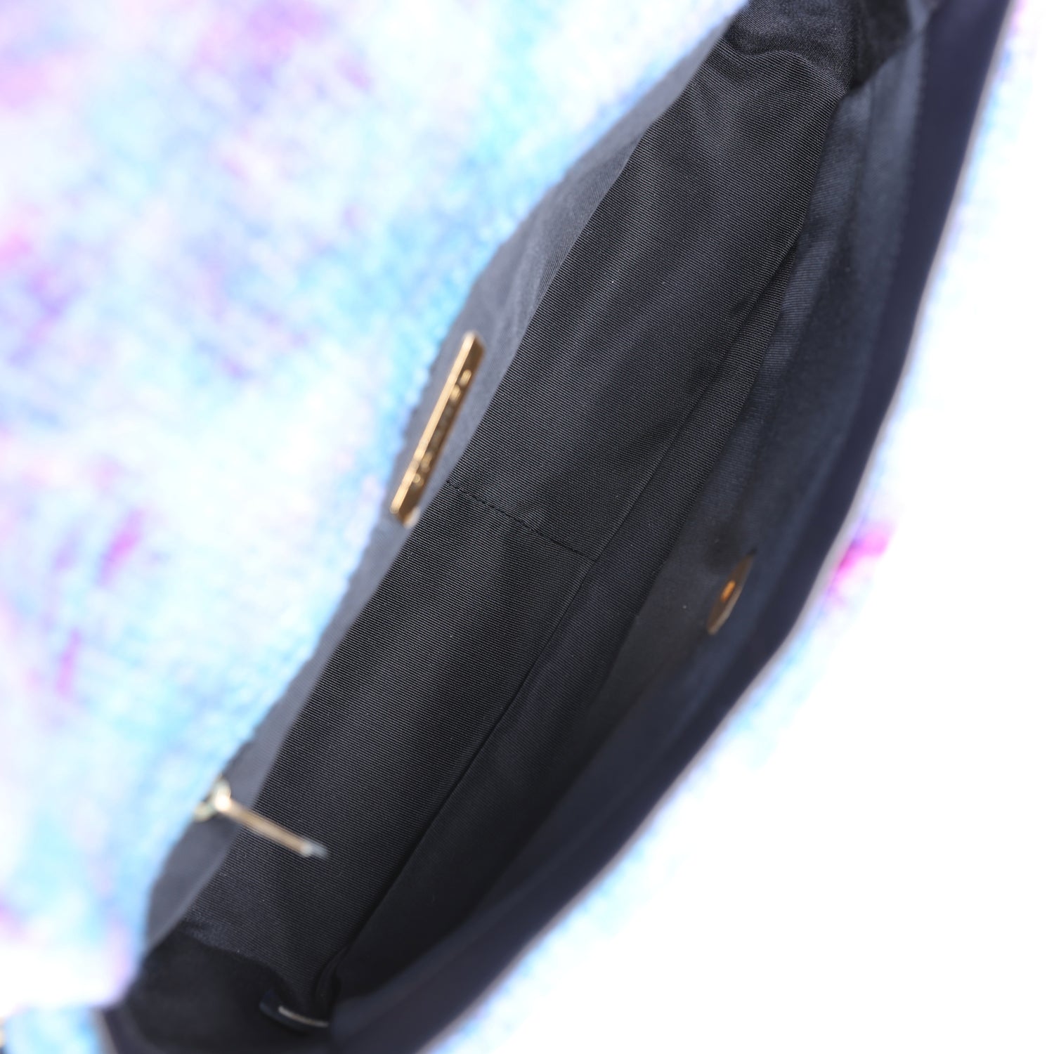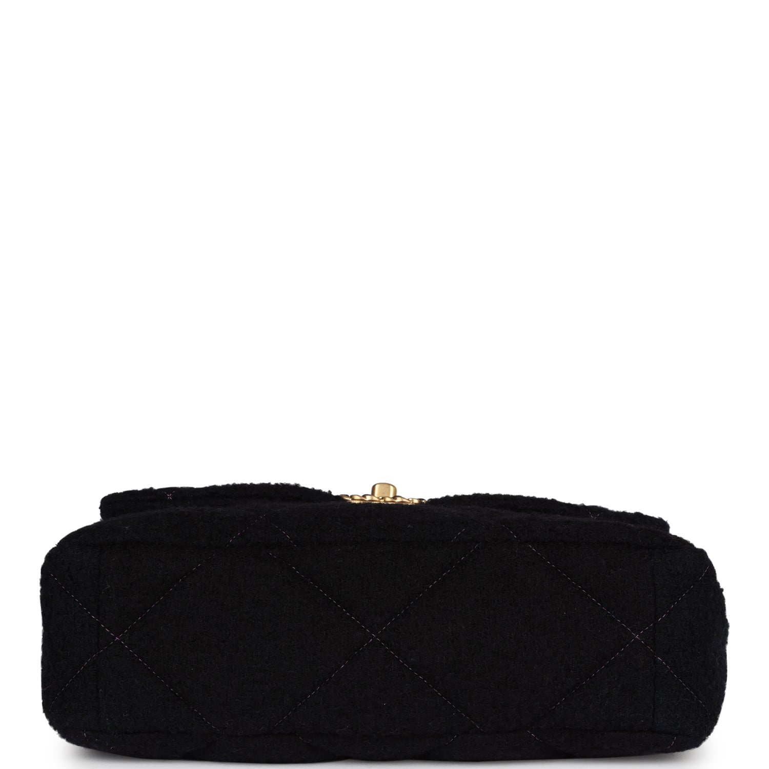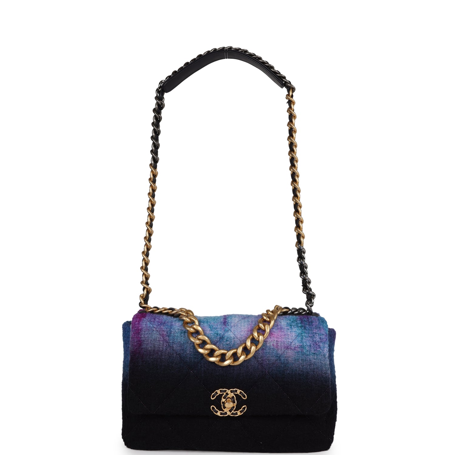 This Large 19 Flap bag is in Purple. Blue. and Black wool tweed with mixed metal hardware and has the signature diamond quilting. signature CC interlocking closure. exterior back pocket. chain top handle. and long mixed metal and black leather chain.