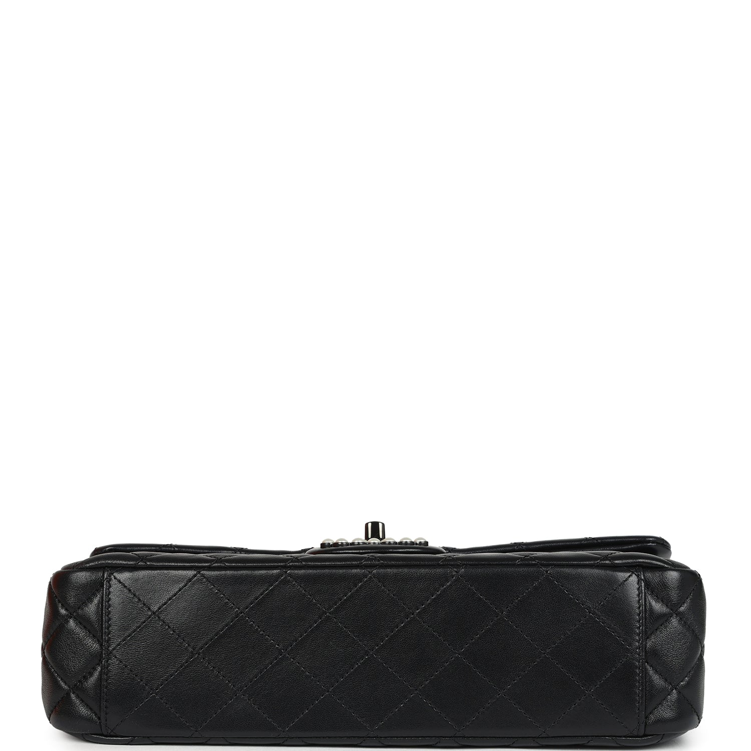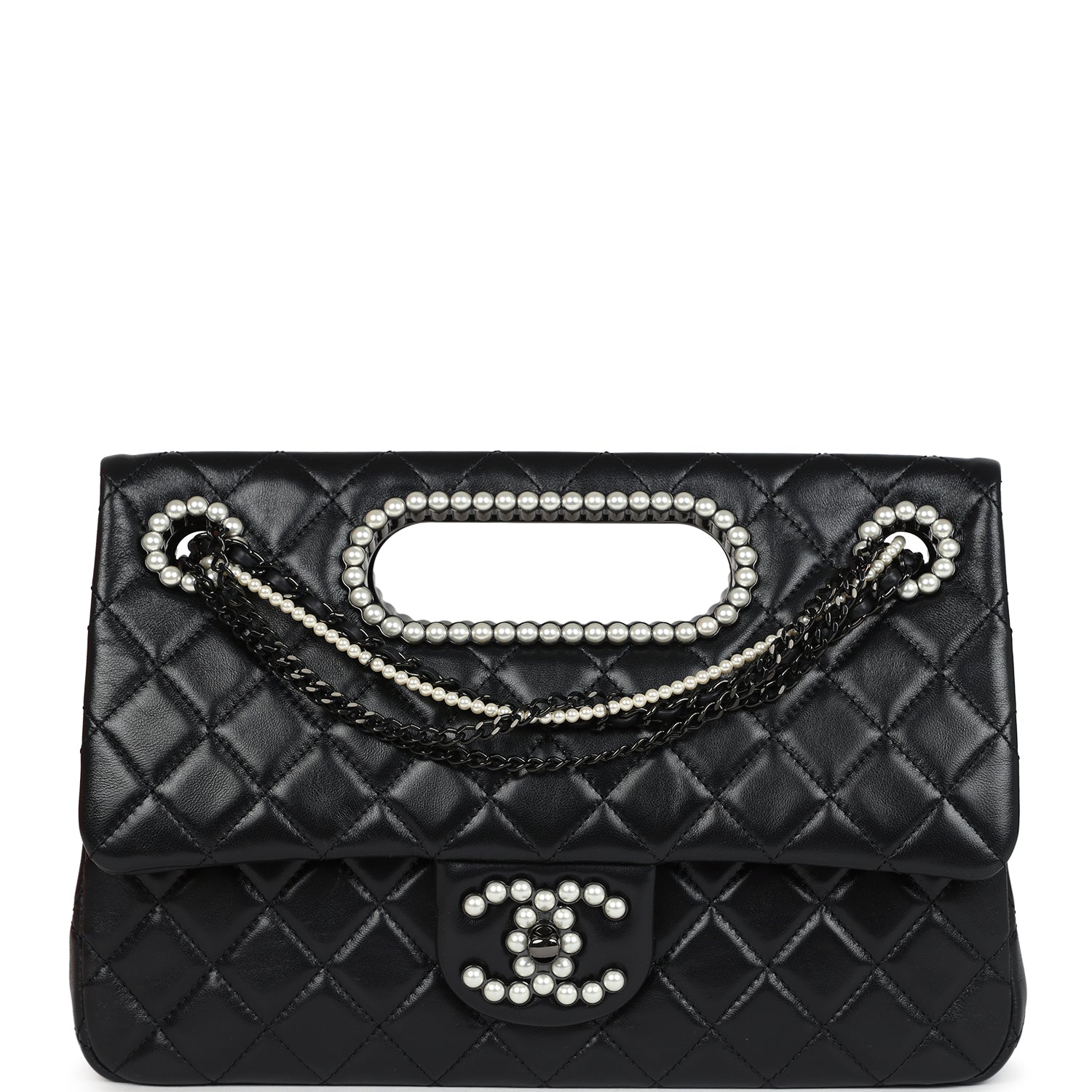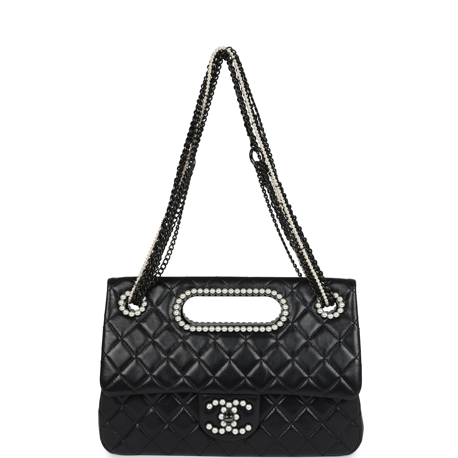 This Chanel Large Double Flap with cut out handle is of black shiny lambskin leather with black hardware embellished with faux pearls. The front flap features the signature CC turnlock closure which is embellished with faux pearls. The chain link shoulder strap is comprised of faux pearls. black tone chain links. and an interwoven black leather and black tone chainlinks. The top of the bag has a cut out top handle which is surrounded by faux pearls.