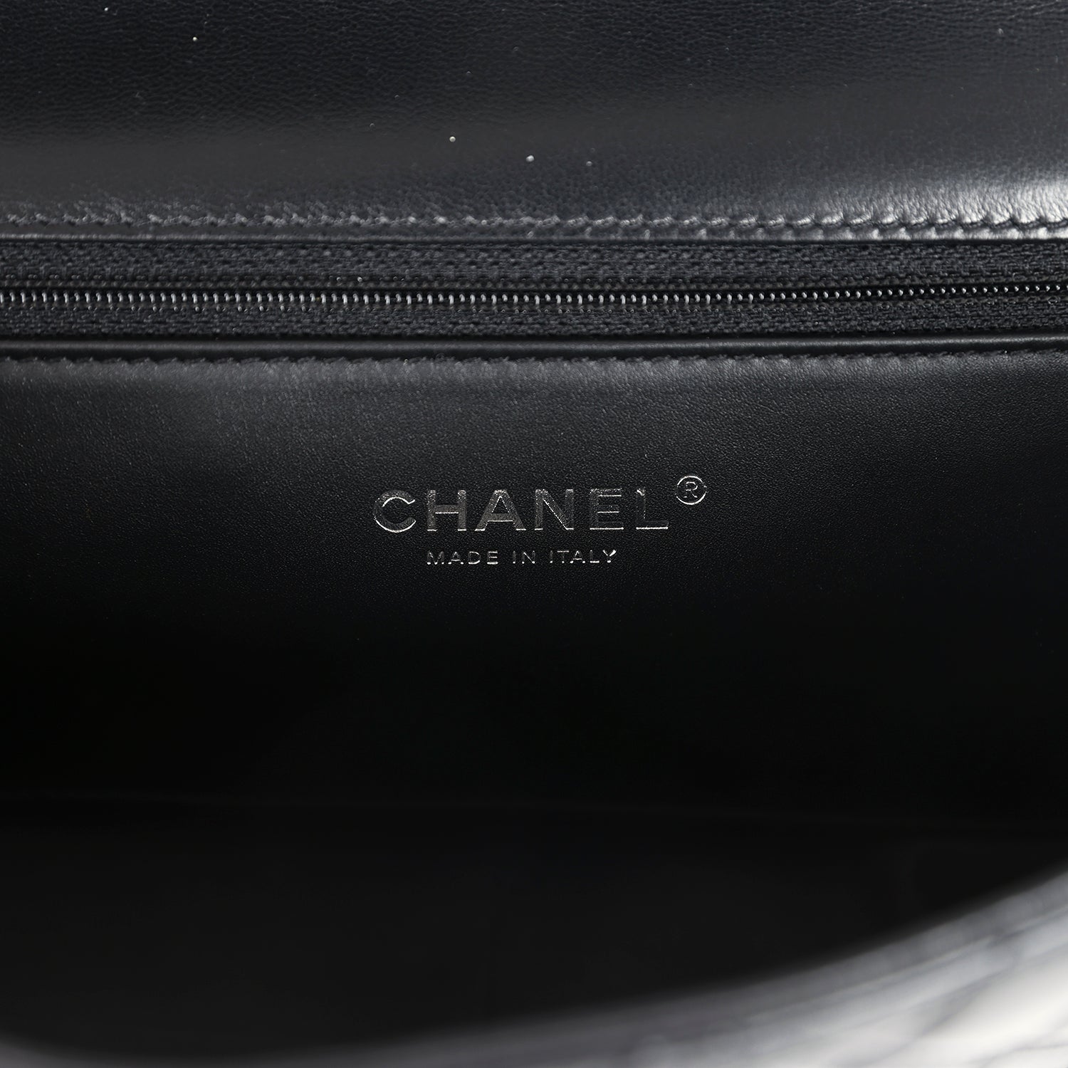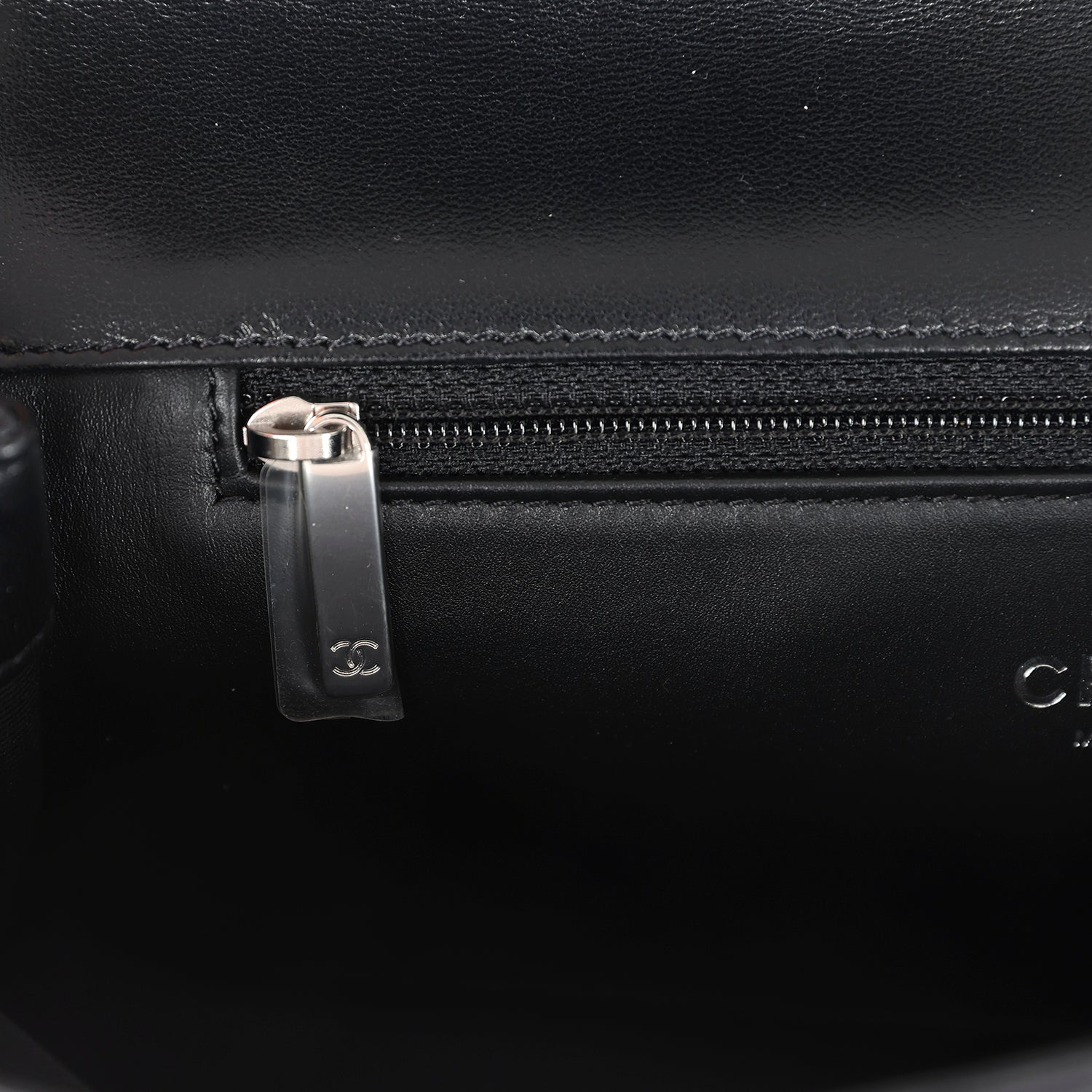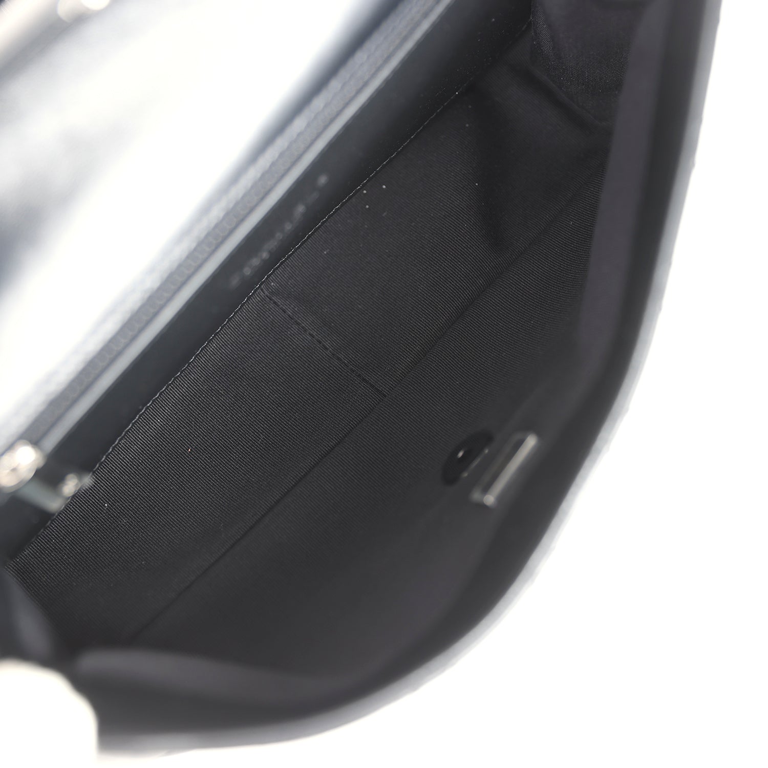 The interior is lined in black leather and grossgrain fabric with a hidden slit pocket in the back. and one interior zip pocket on the rear wall.