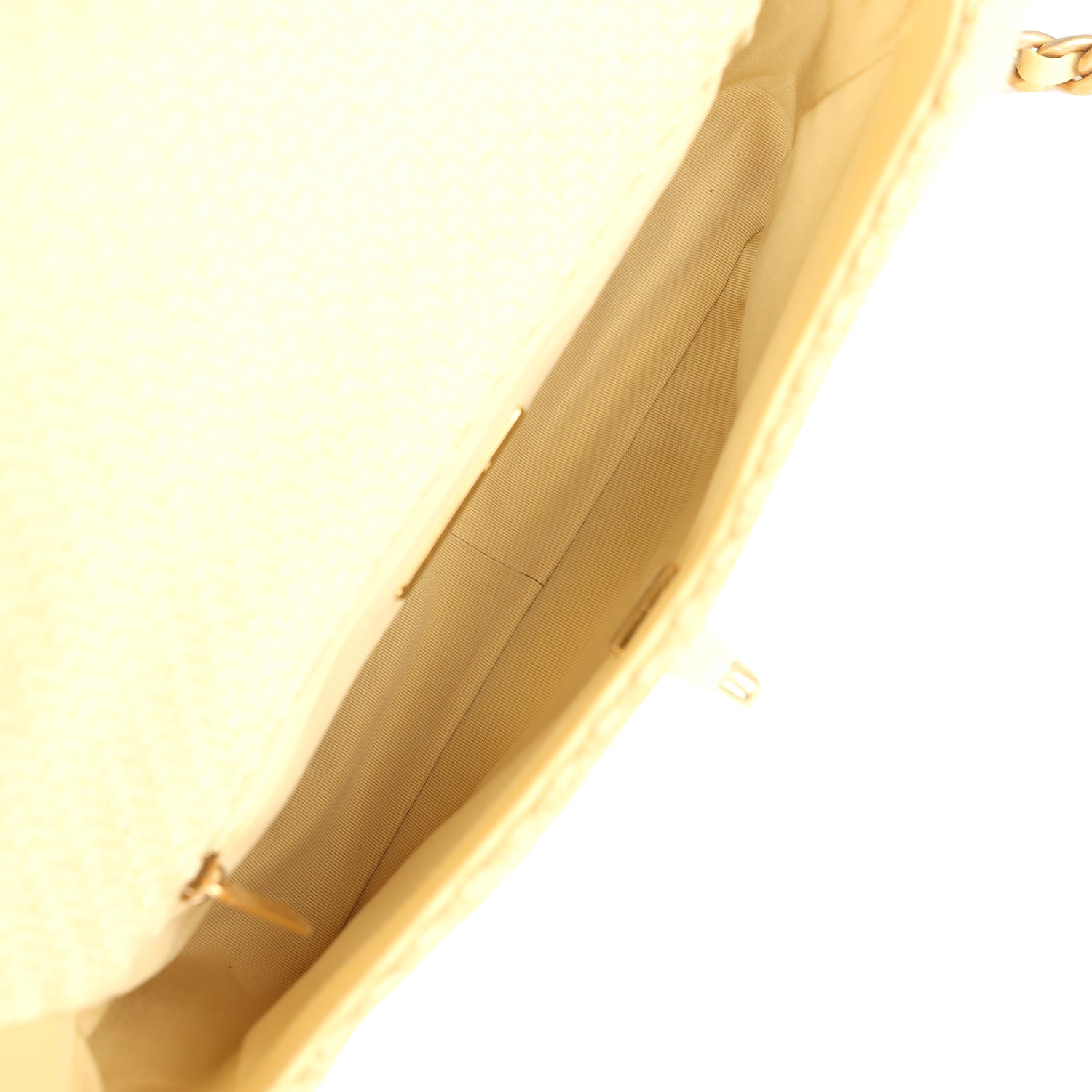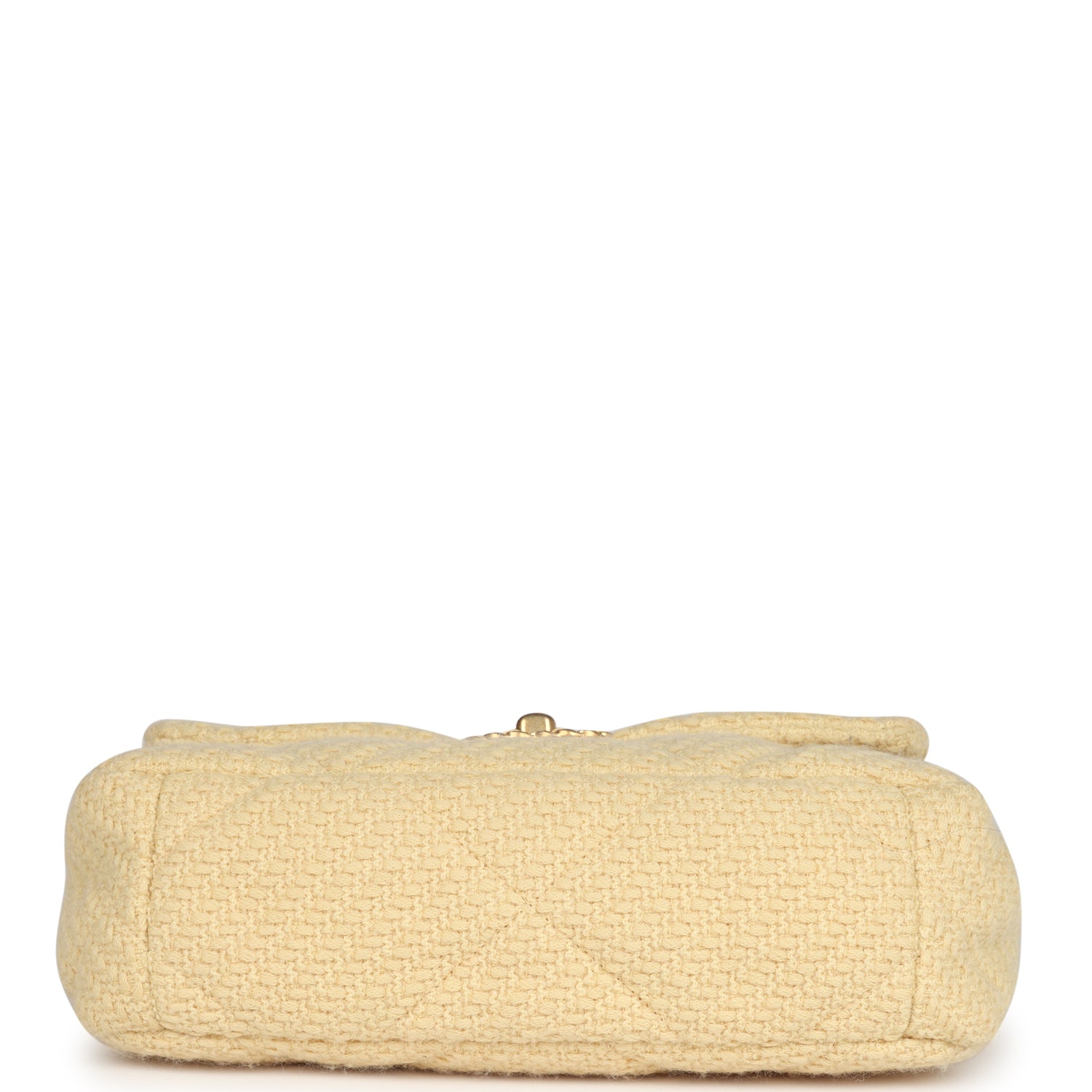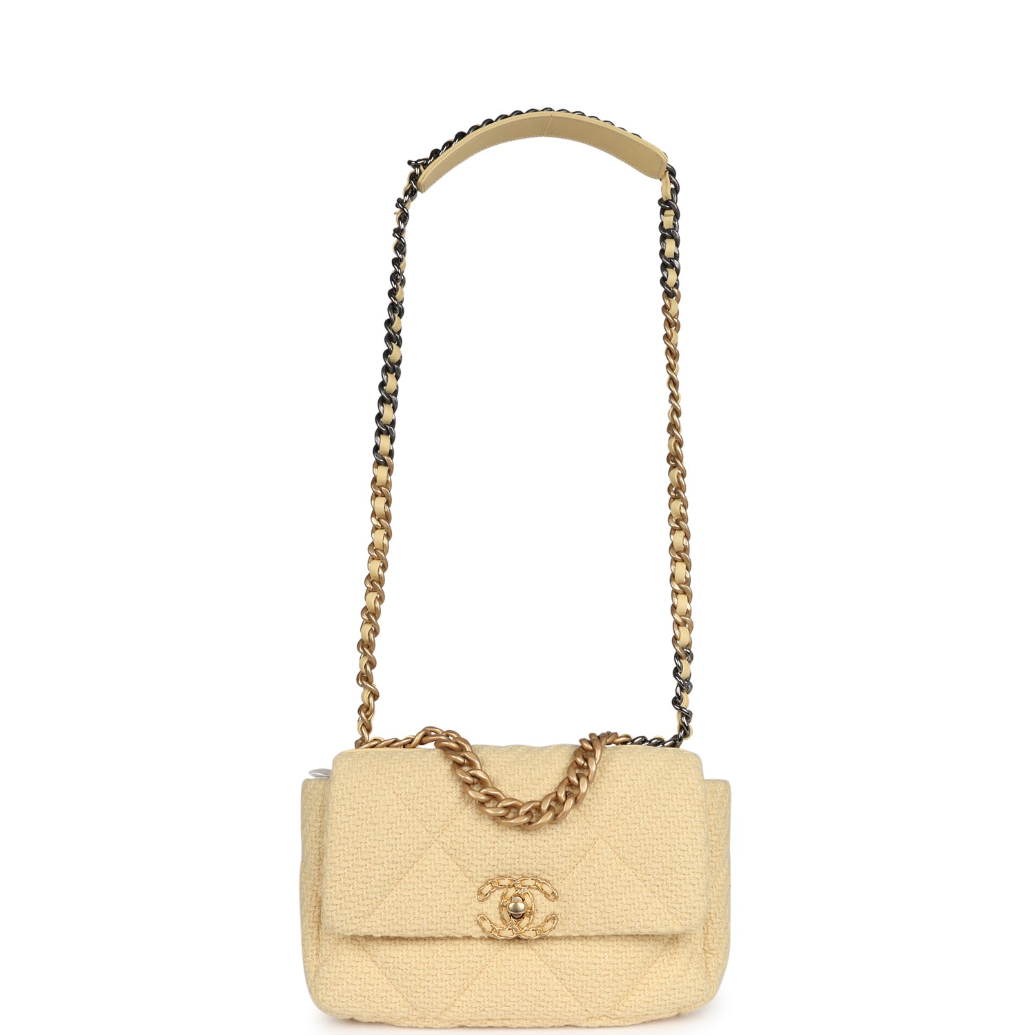 This Medium 19 Flap bag is of light yellow wool with mixed metal hardware and has the signature diamond quilting. signature 19 style CC interlocking closure. exterior back pocket. chain top handle. and long shoulder strap is made of brushed gold. ruthenium. and silver tone and Yellow leather chain.
