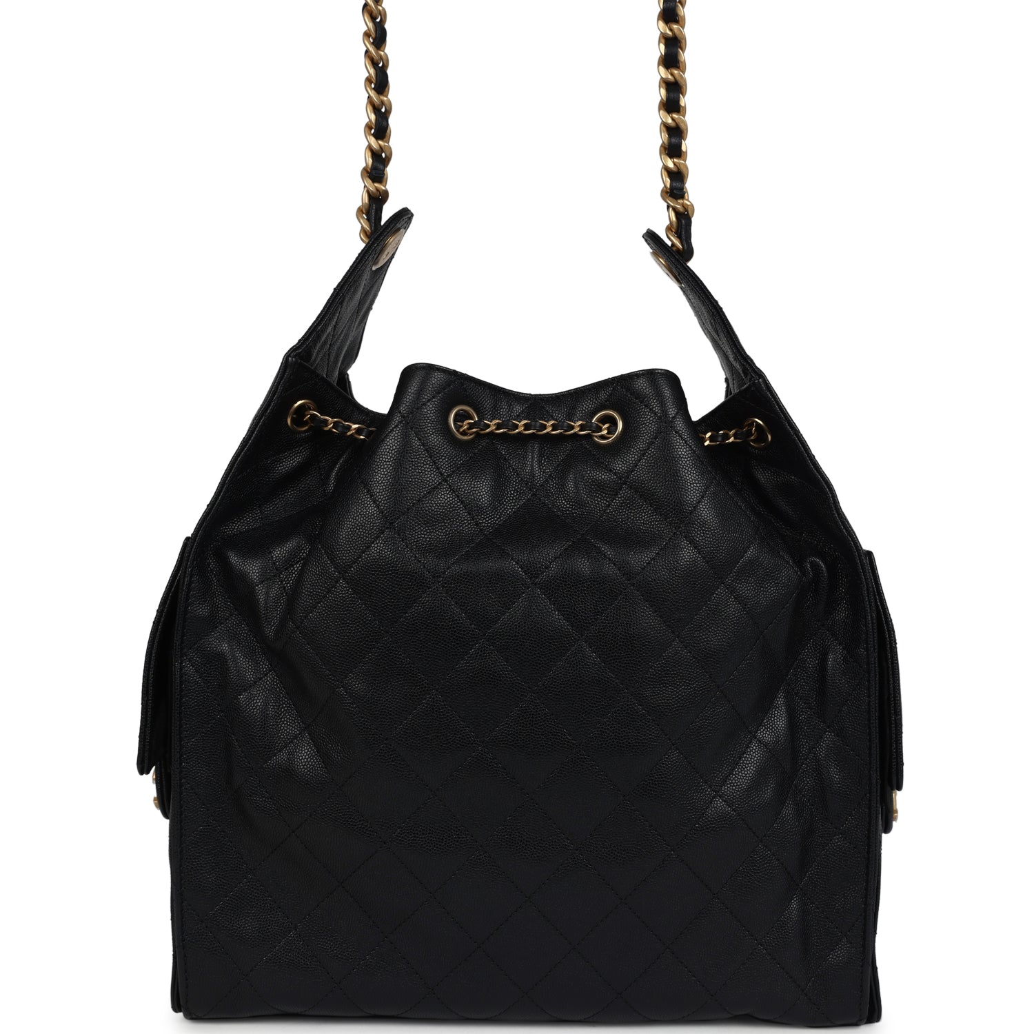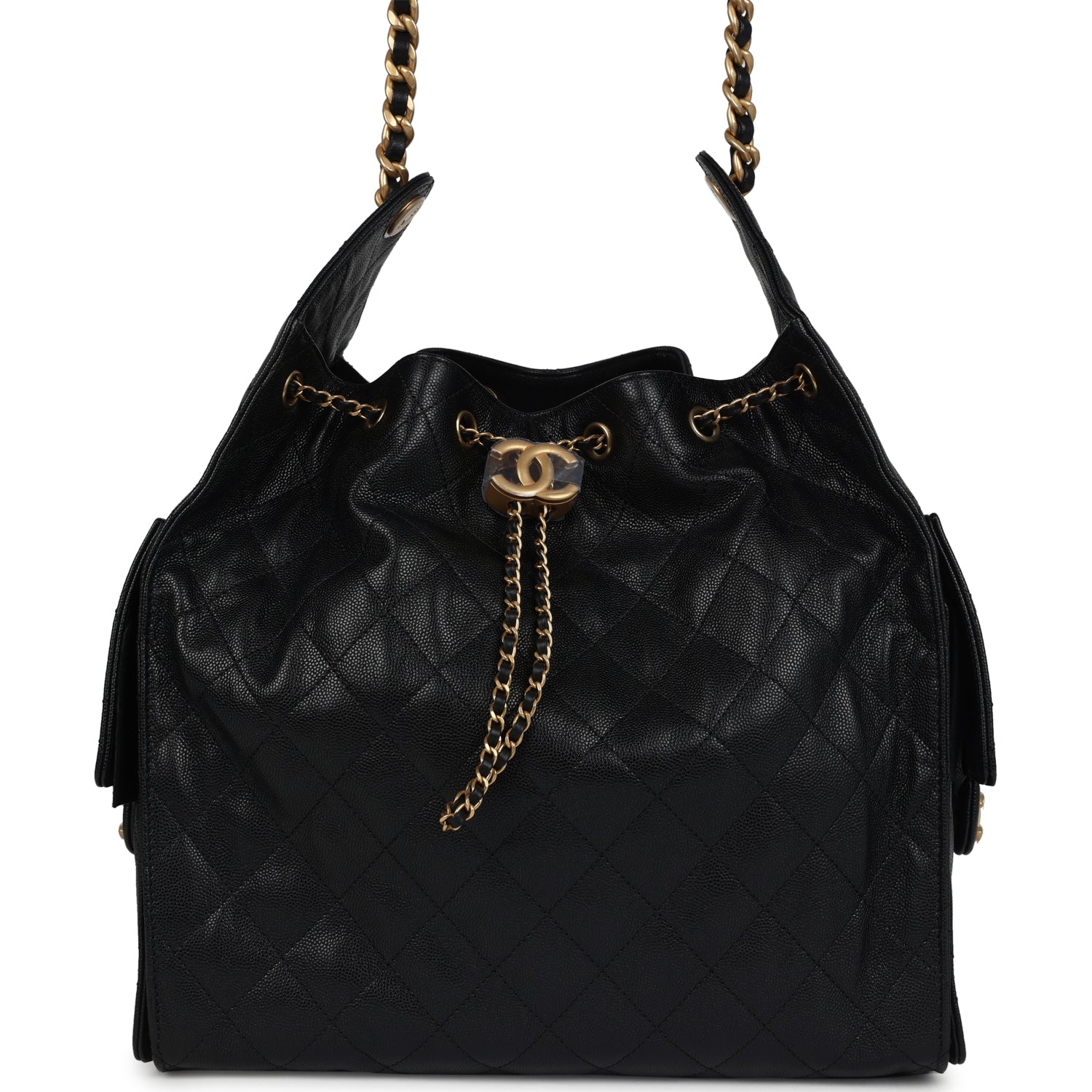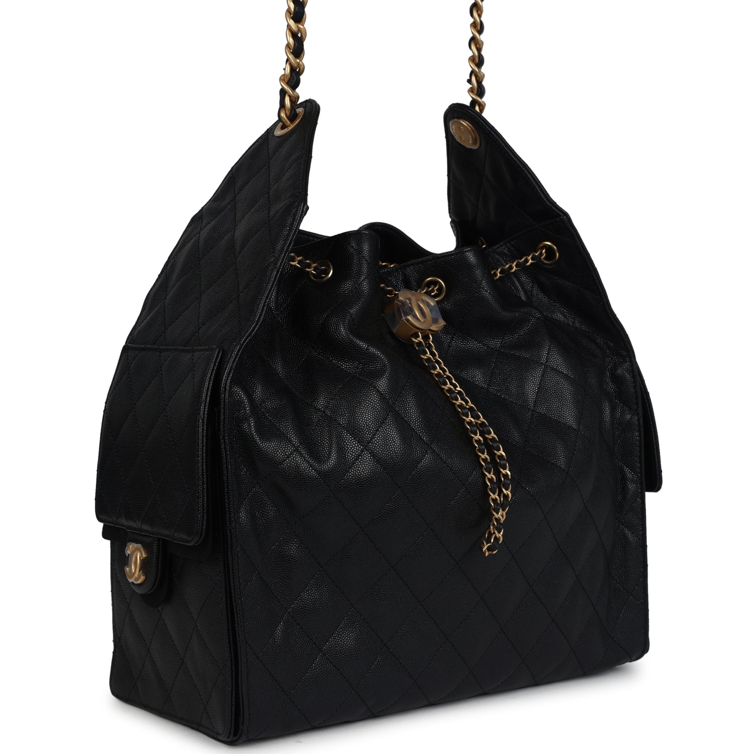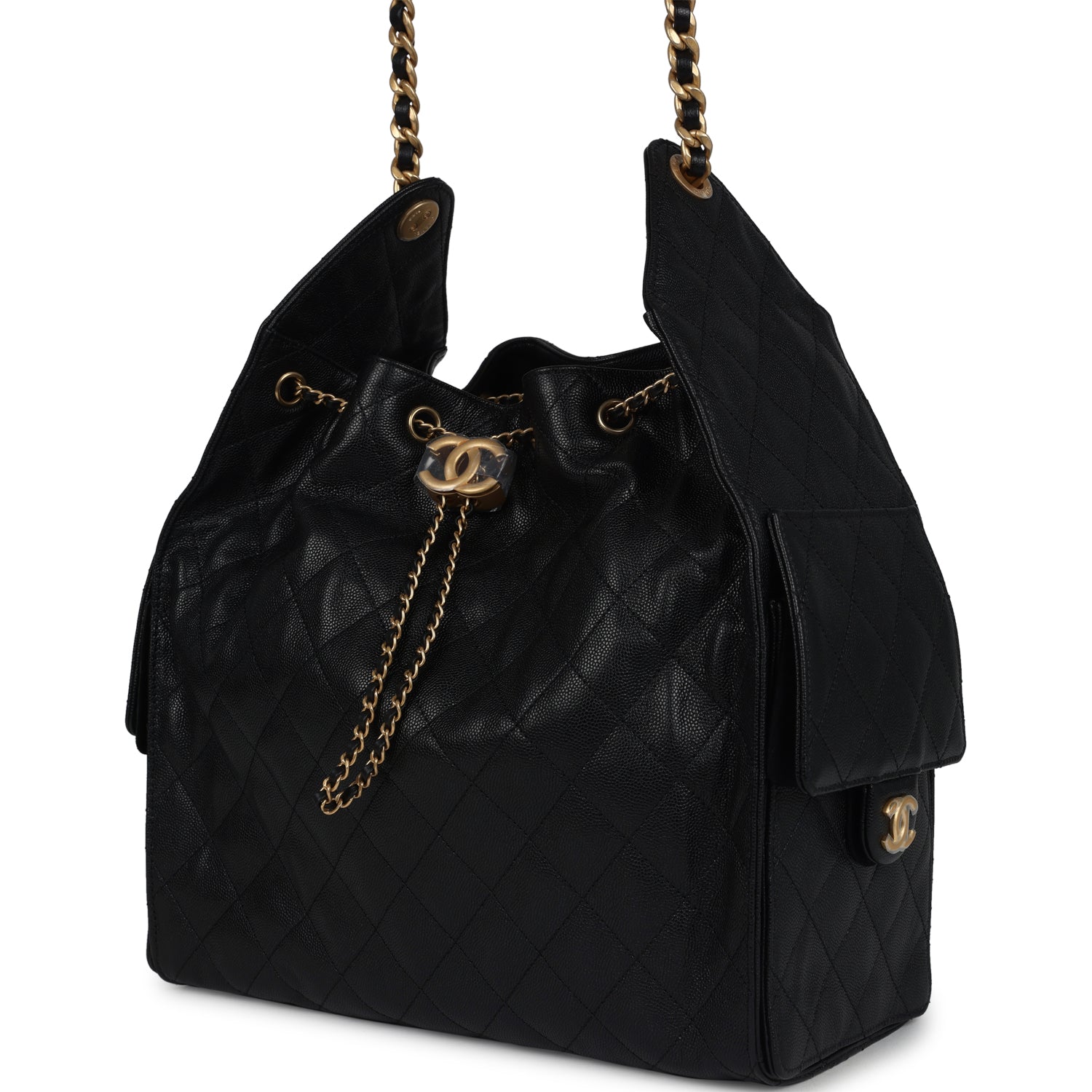 This Chanel Medium 25 Hobo Bag is in black caviar leather with antique gold hardware. features signature diamond quilt. two exterior side pockets. drawstring closure. a removable pouch. and a single interwoven antique gold and Black leather shoulder strap.