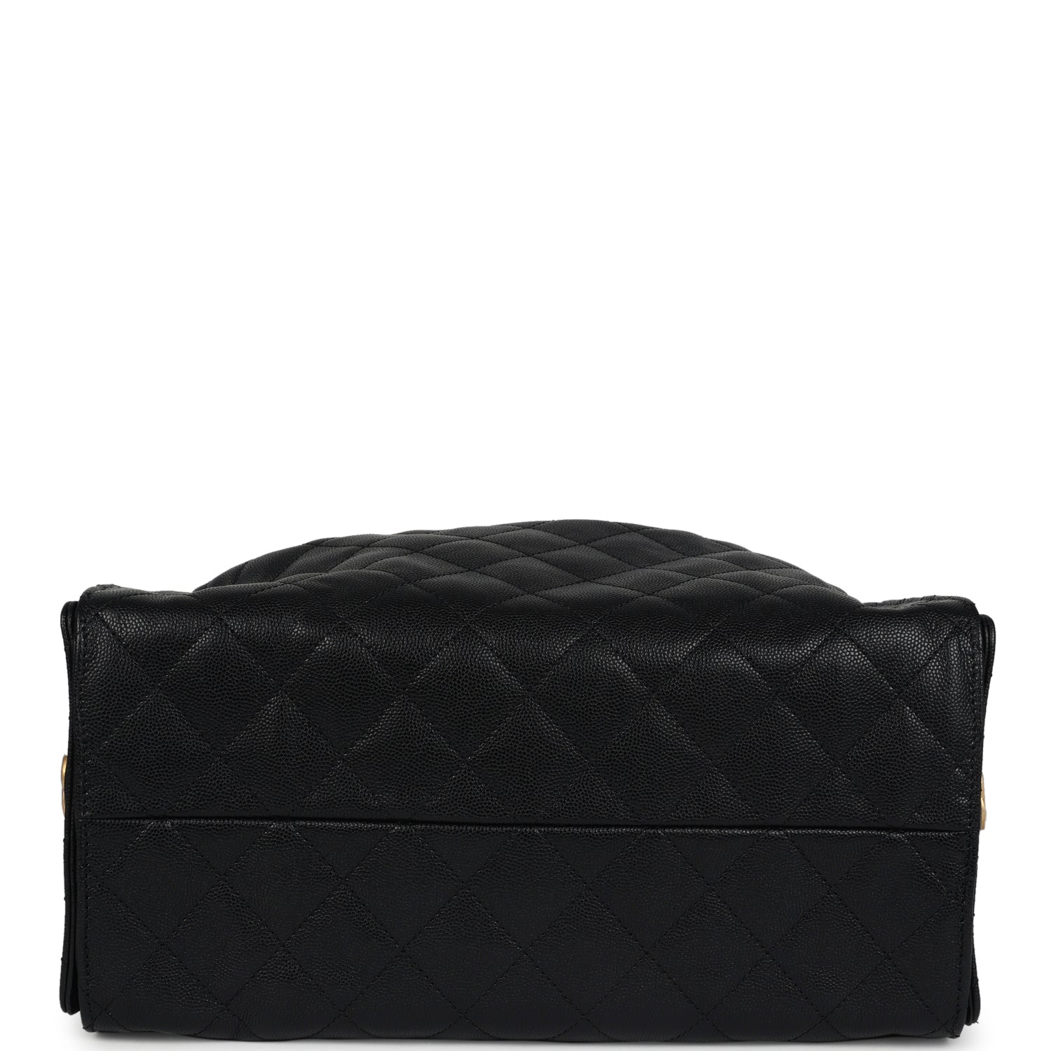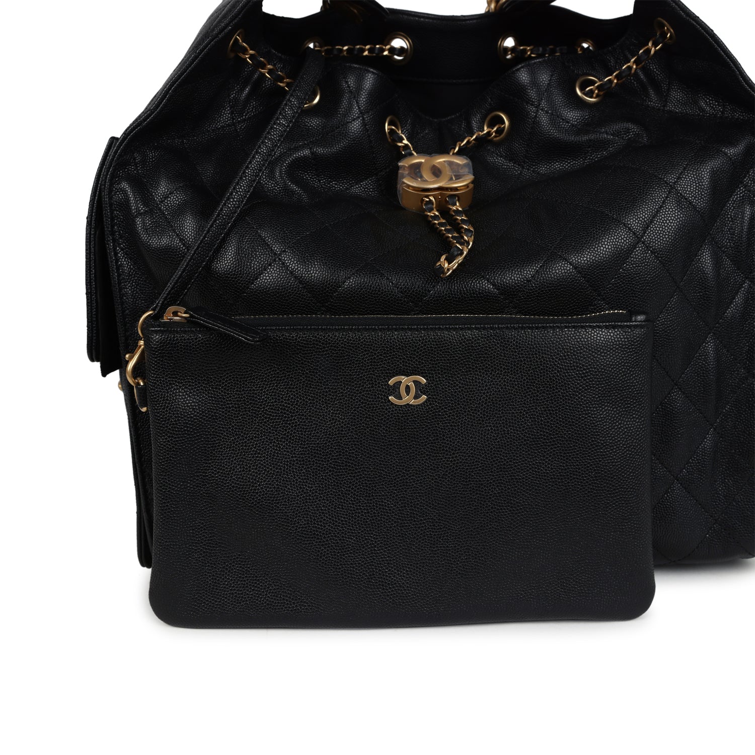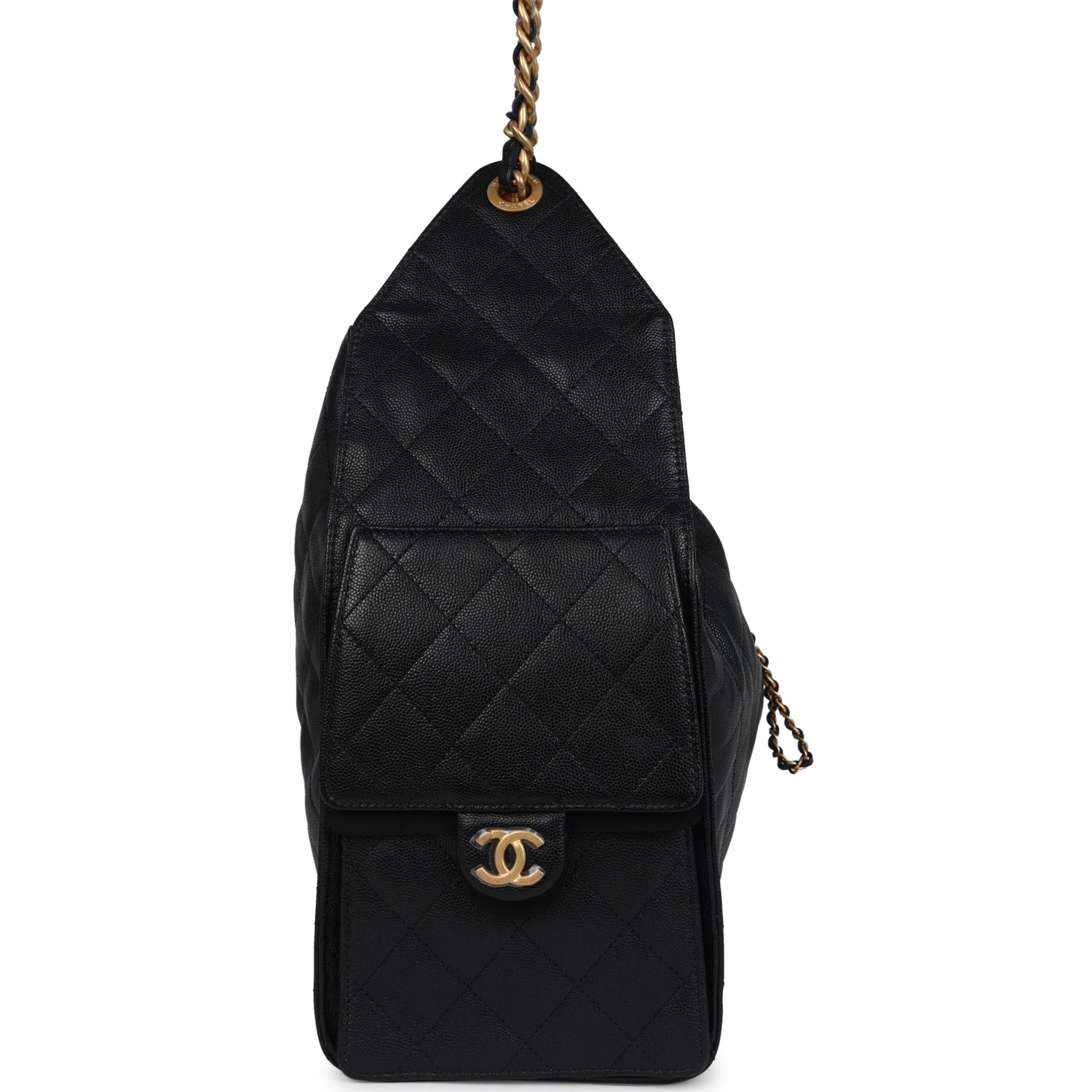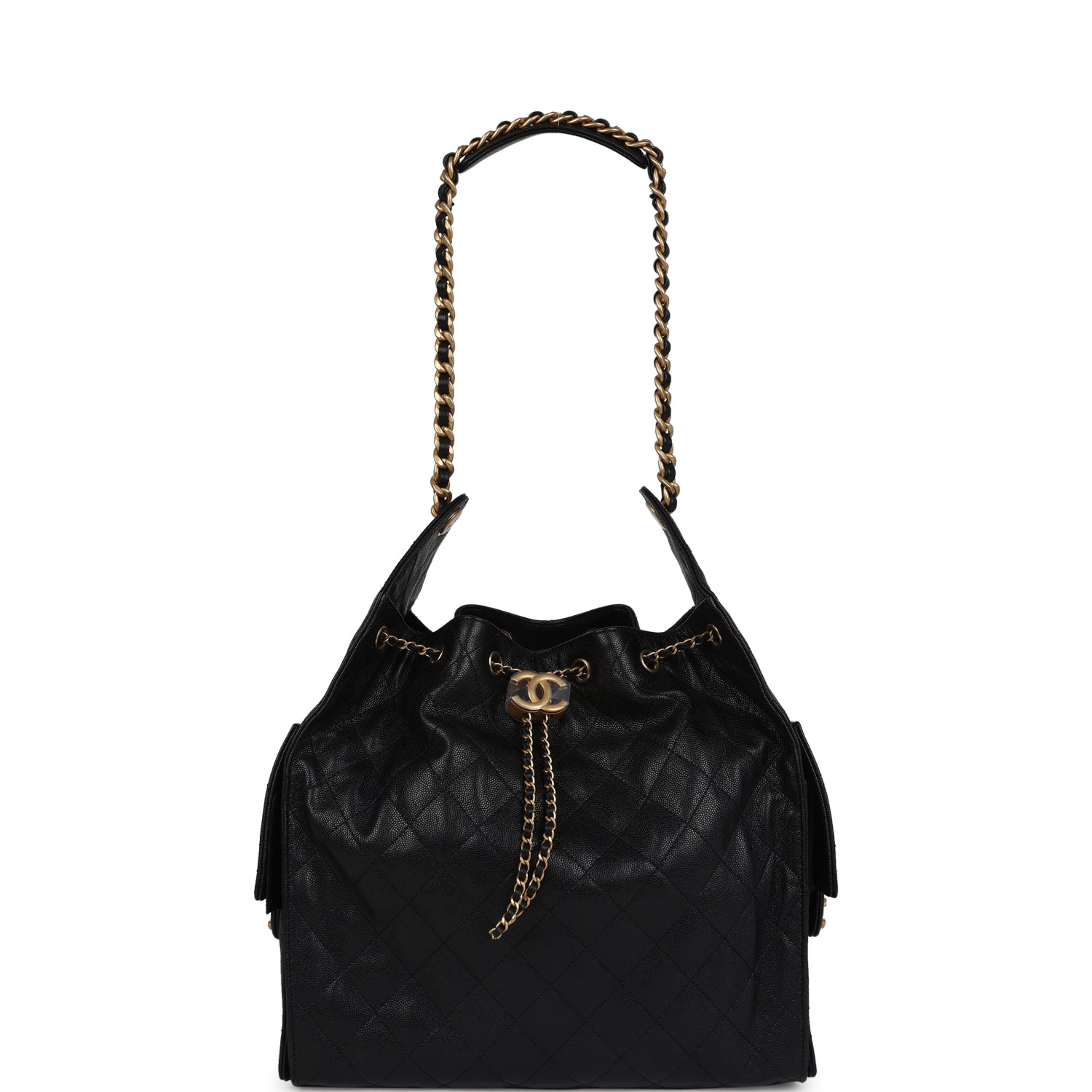 This Chanel Medium 25 Hobo Bag is in black caviar leather with antique gold hardware. features signature diamond quilt. two exterior side pockets. drawstring closure. a removable pouch. and a single interwoven antique gold and Black leather shoulder strap.