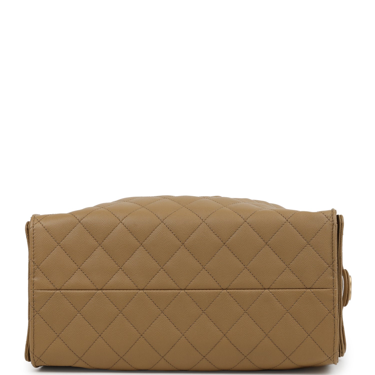 This Chanel Medium 25 Hobo Bag is in dark beige caviar leather with antique gold hardware. features signature diamond quilt. two exterior side pockets. drawstring closure. a removable pouch. and a single interwoven antique gold and dark beige leather shoulder strap.