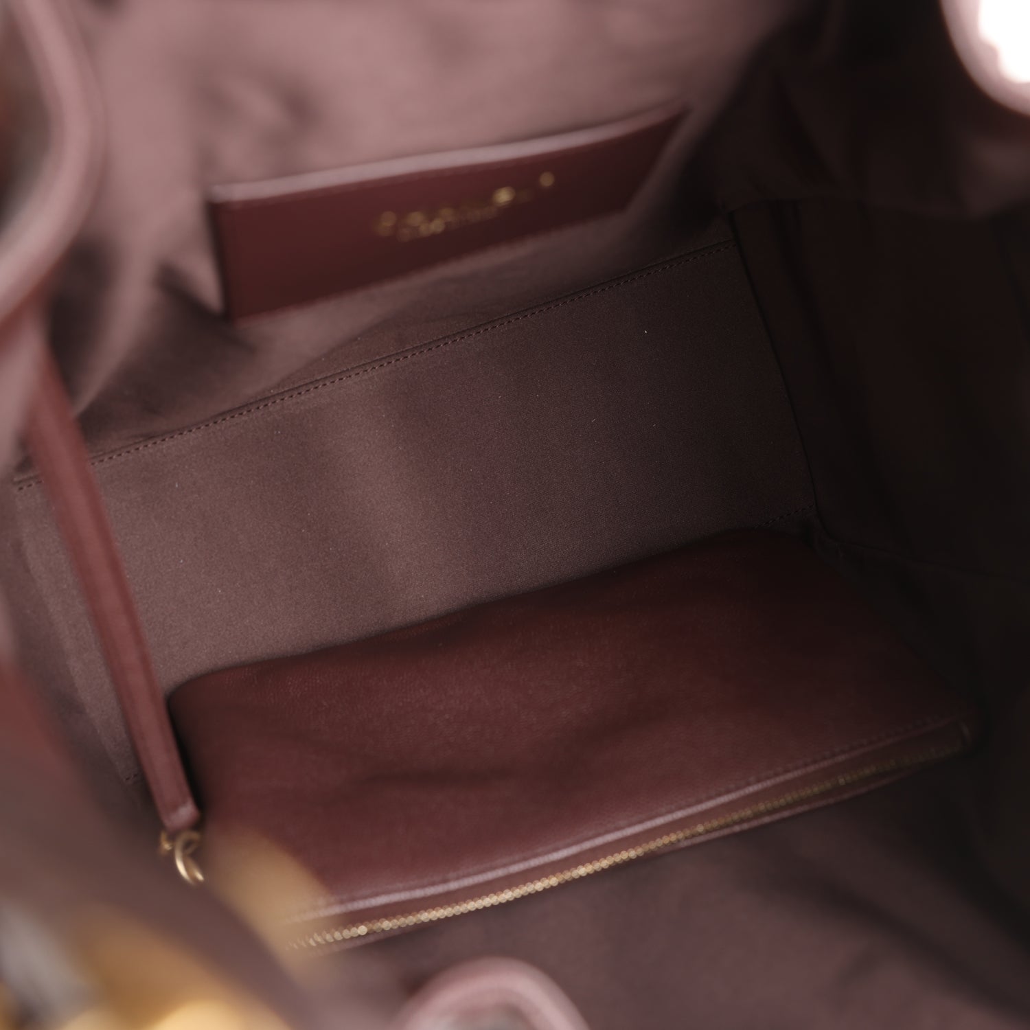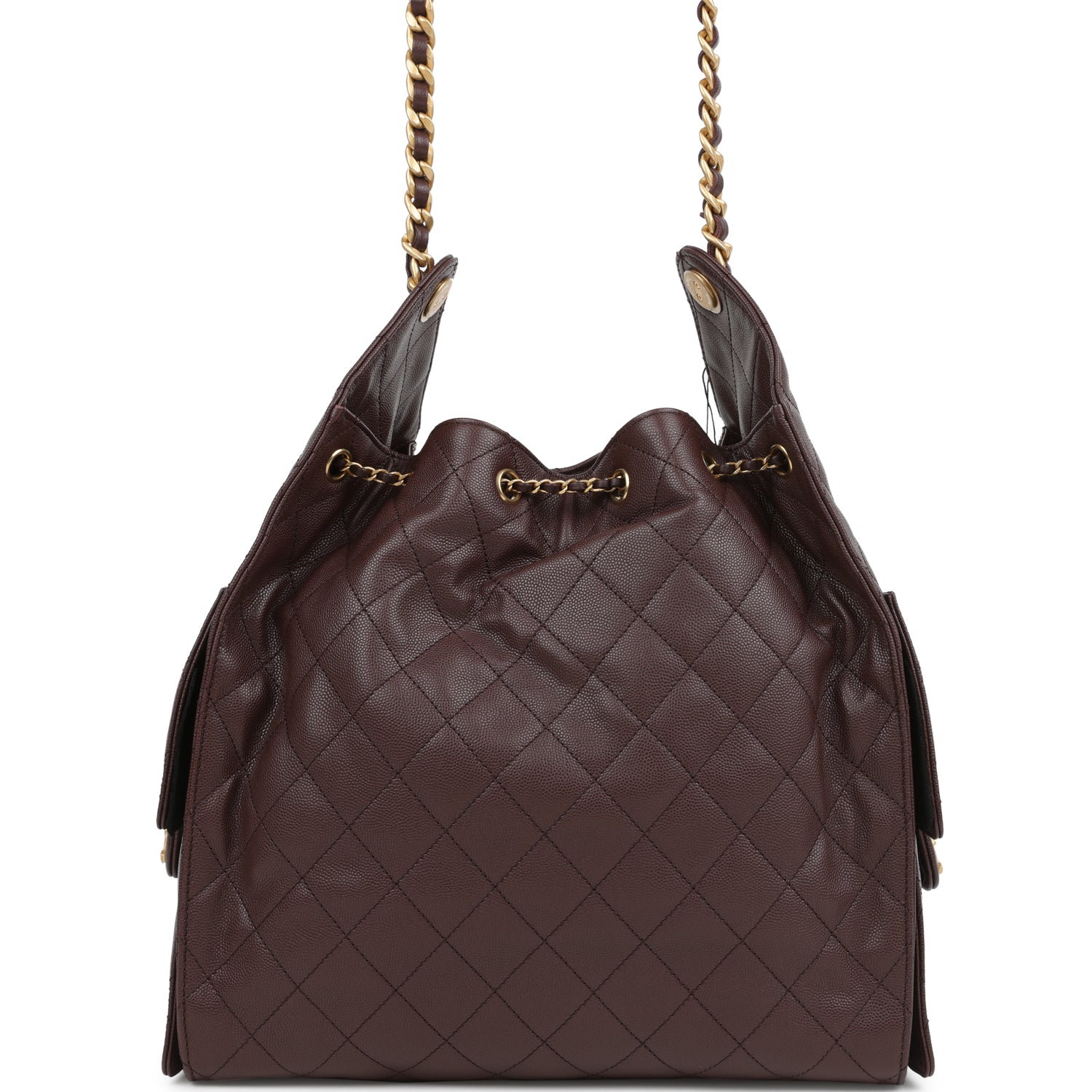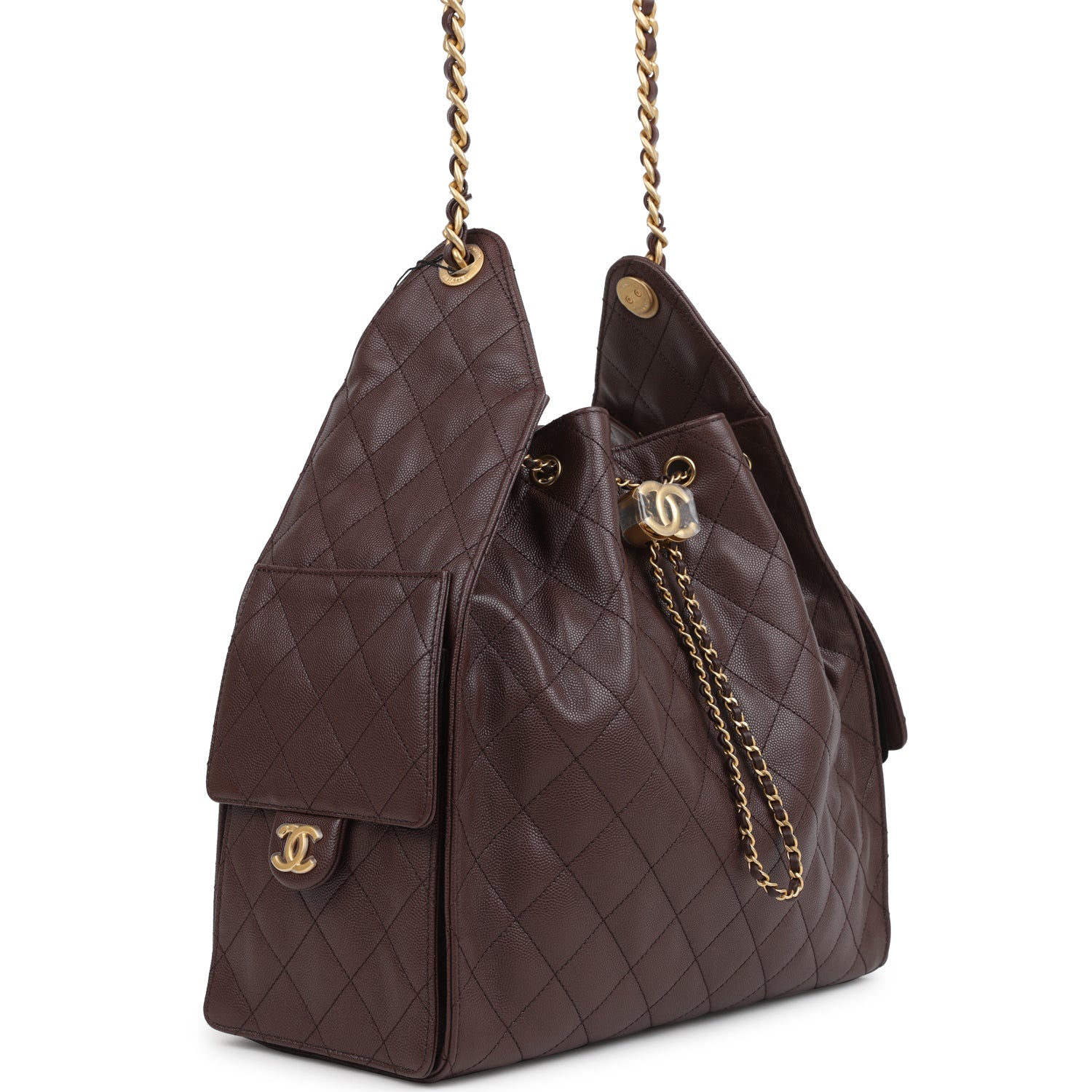 This Chanel Medium 25 Hobo Bag is in dark brown caviar leather with antique gold hardware. features signature diamond quilt. two exterior side pockets. drawstring closure. a removable pouch. and a single interwoven antique gold and dark brown leather shoulder strap.