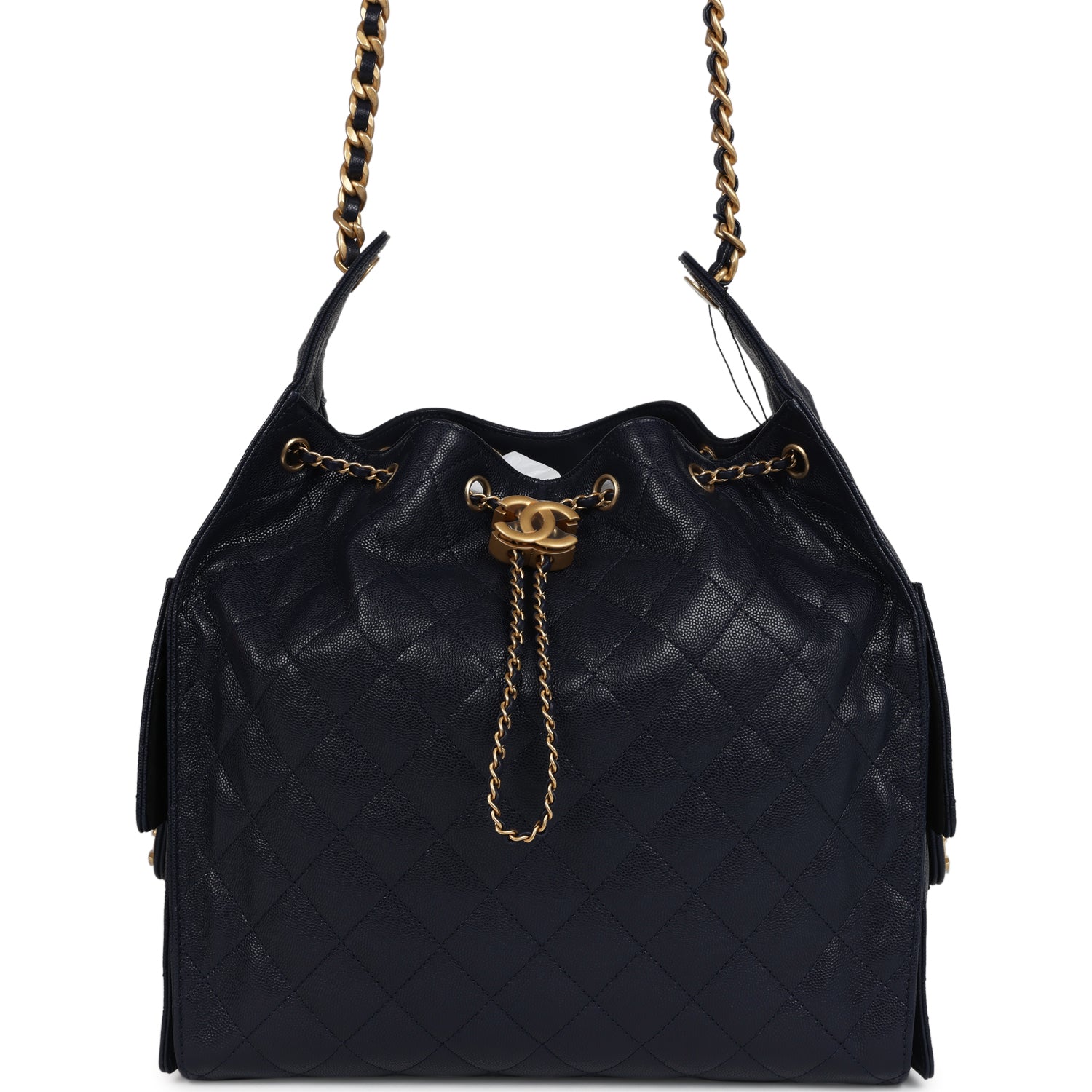This Chanel Medium 25 Hobo Bag is in dark navy caviar leather with antique gold hardware. features signature diamond quilt. two exterior side pockets. drawstring closure. a removable pouch. and a single interwoven antique gold and dark navy leather shoulder strap.