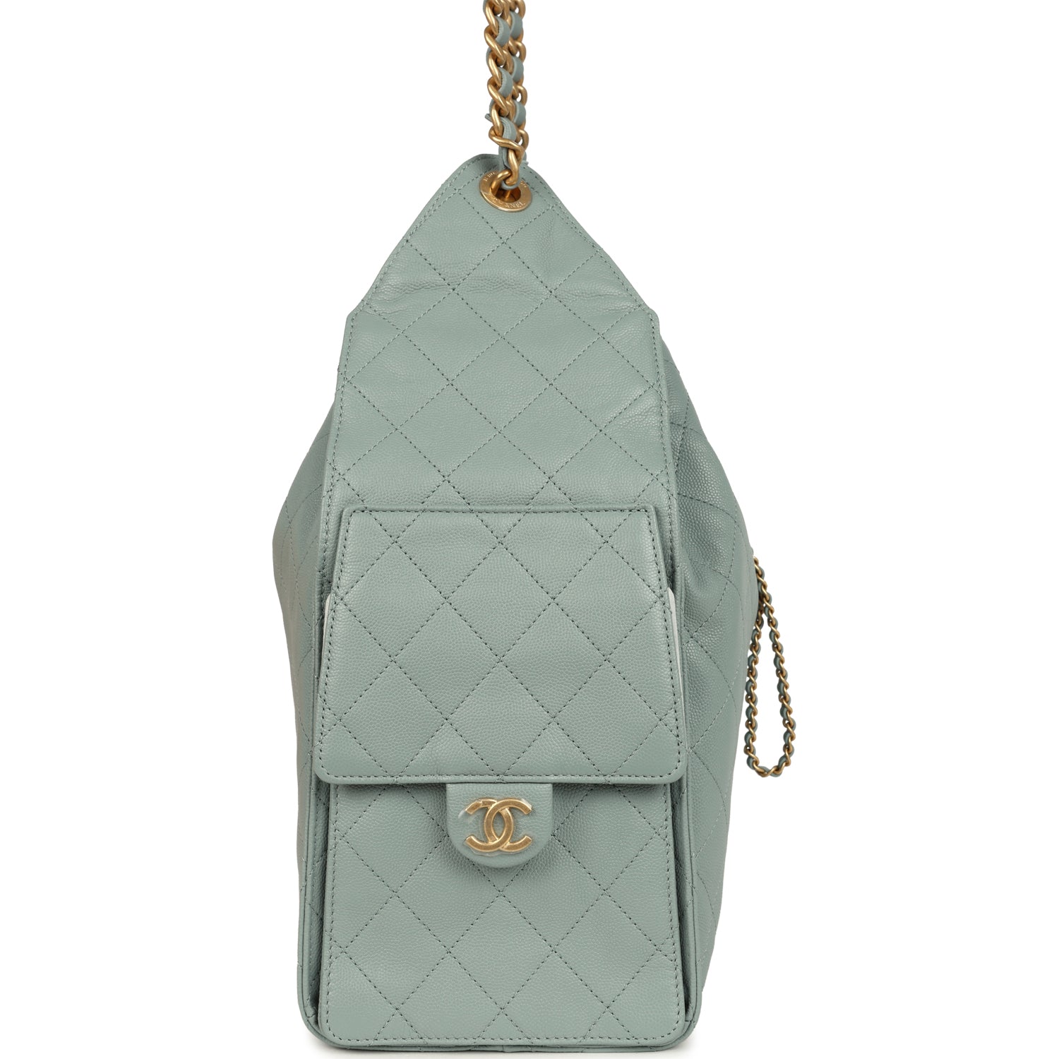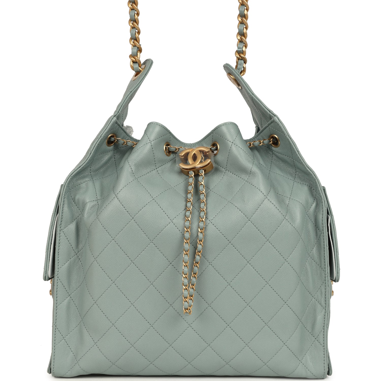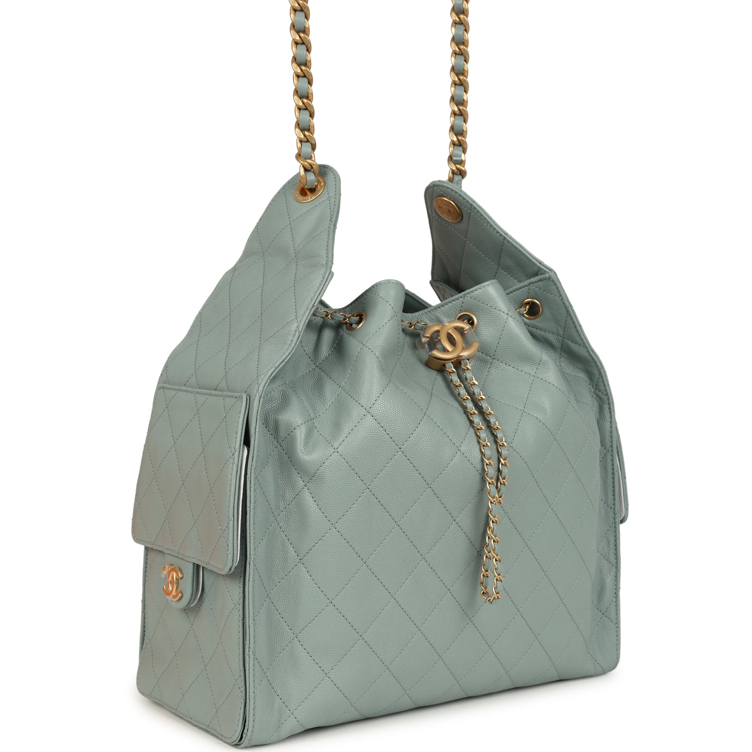 This Chanel Medium 25 Hobo Bag is in green caviar leather with antique gold hardware. features signature diamond quilt. two exterior side pockets. drawstring closure. a removable pouch. and a single interwoven antique gold and green leather shoulder strap.