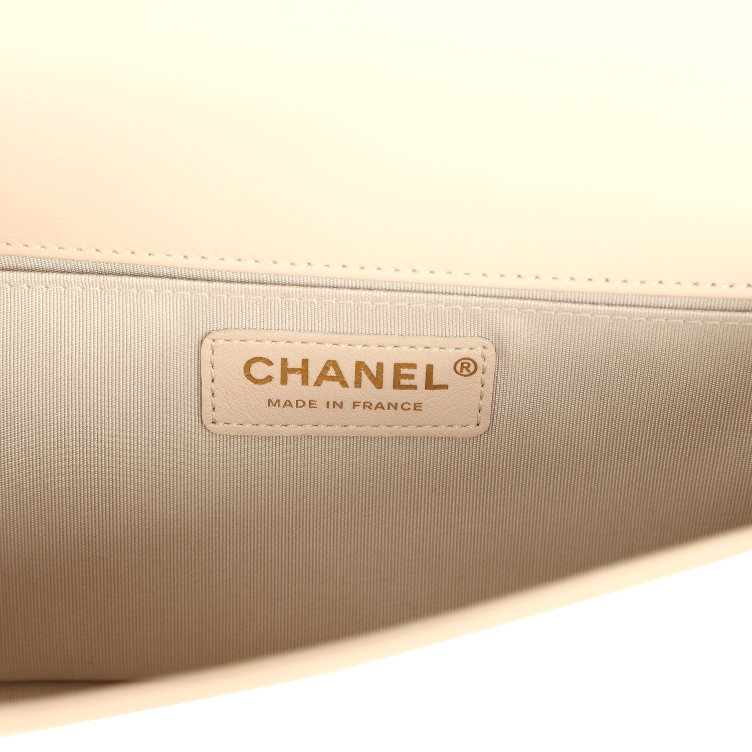 This Chanel medium Boy bag is in cream lambskin leather with antique gold hardware and features a full front flap with the Le Boy CC push lock closure and an antique gold tone chain link and cream leather padded shoulder/crossbody strap.