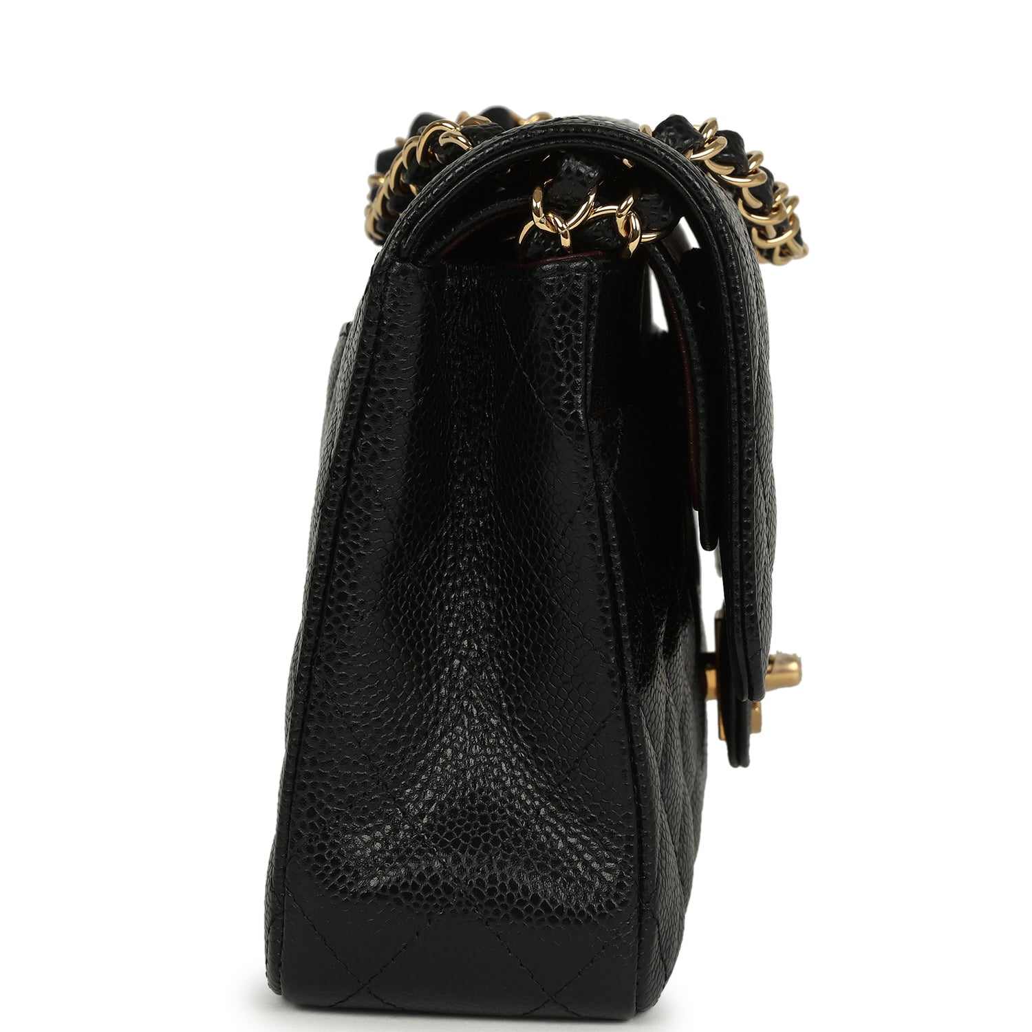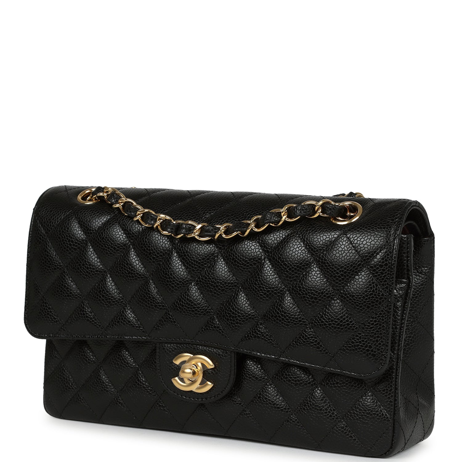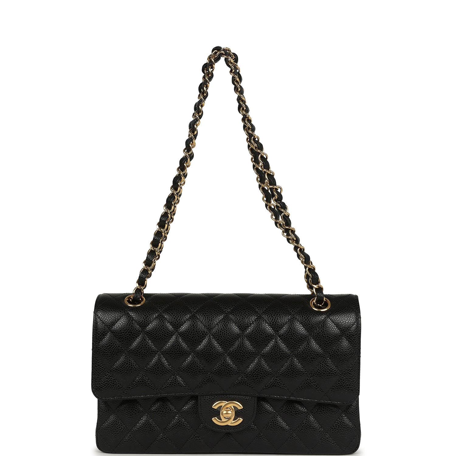 This Medium Classic Double Flap Bag is in Black caviar leather with gold hardware. front flap with CC turnlock closure. tonal stitching. half moon back pocket and an adjustable interwoven gold chain link and Black leather shoulder/crossbody strap.