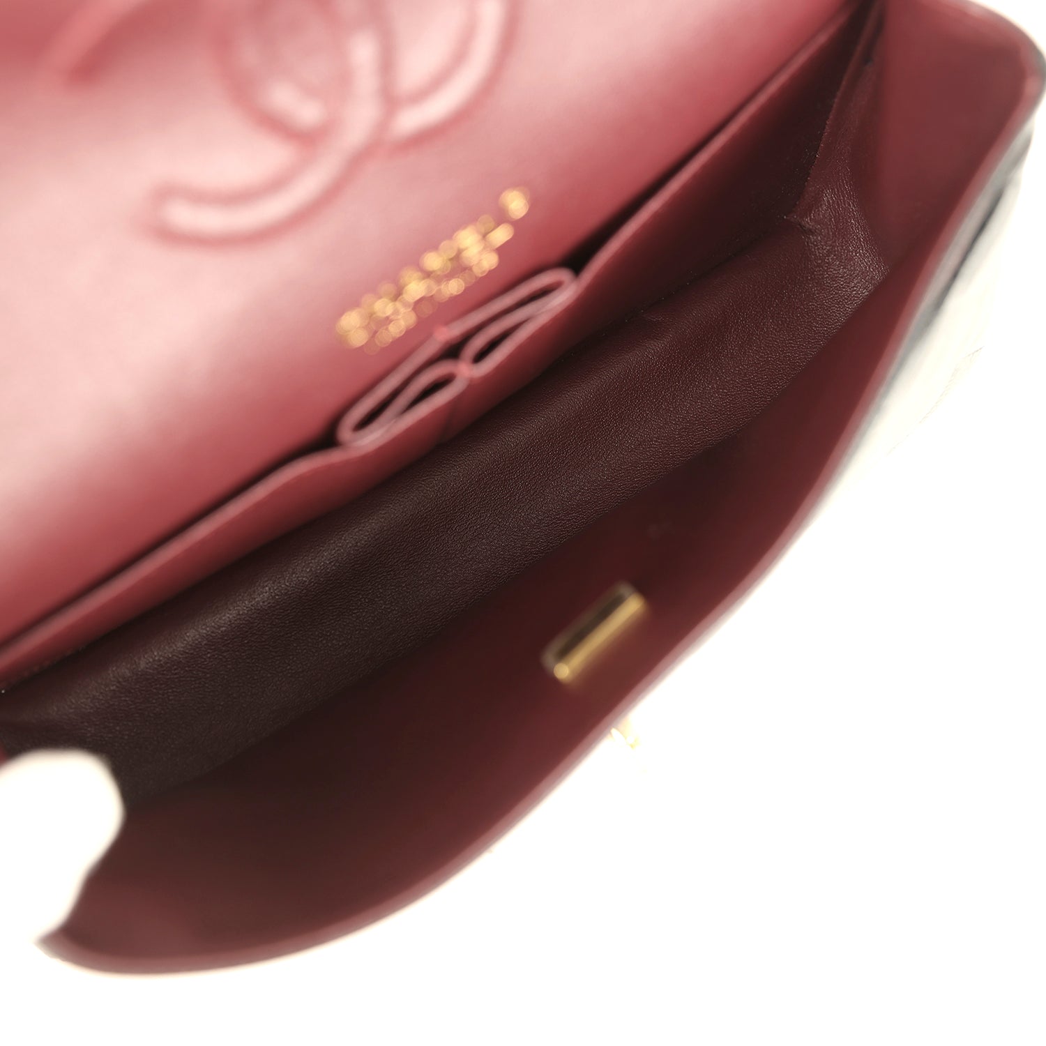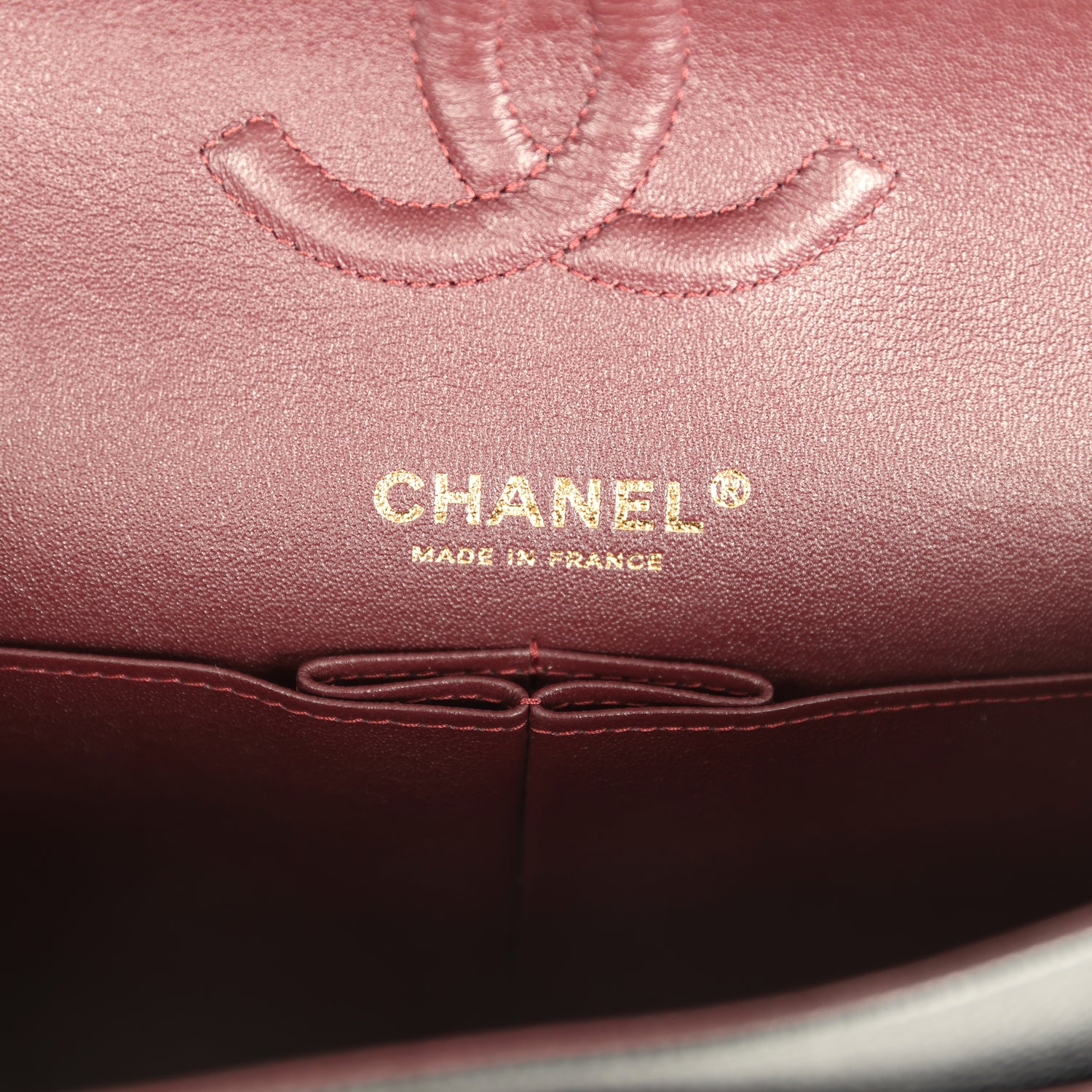 The interior is lined in burgundy leather with the "love letter" zipper compartment underneath the first flap. an "outer" slit pocket under the second flap. and an interior compartment with two open pockets separated by a "lipstick" compartment.