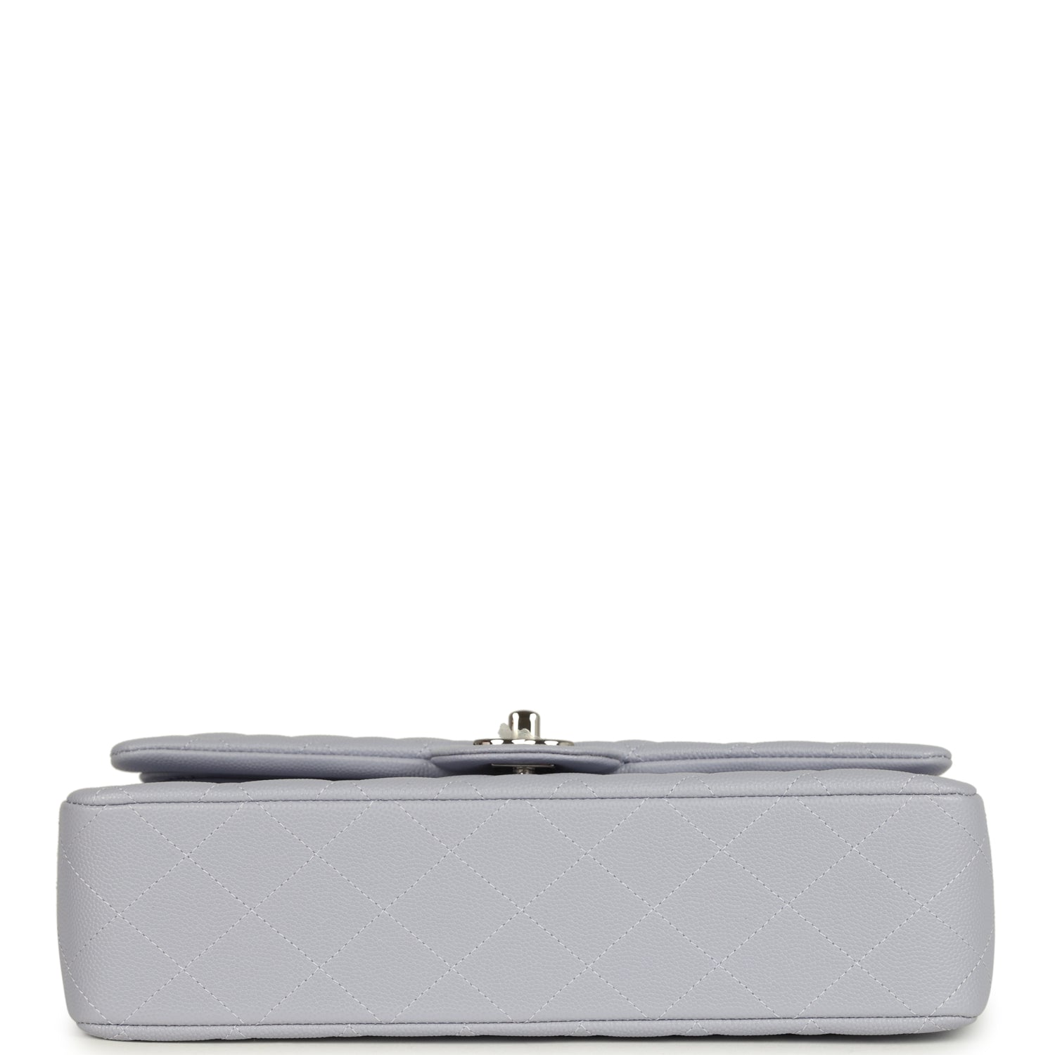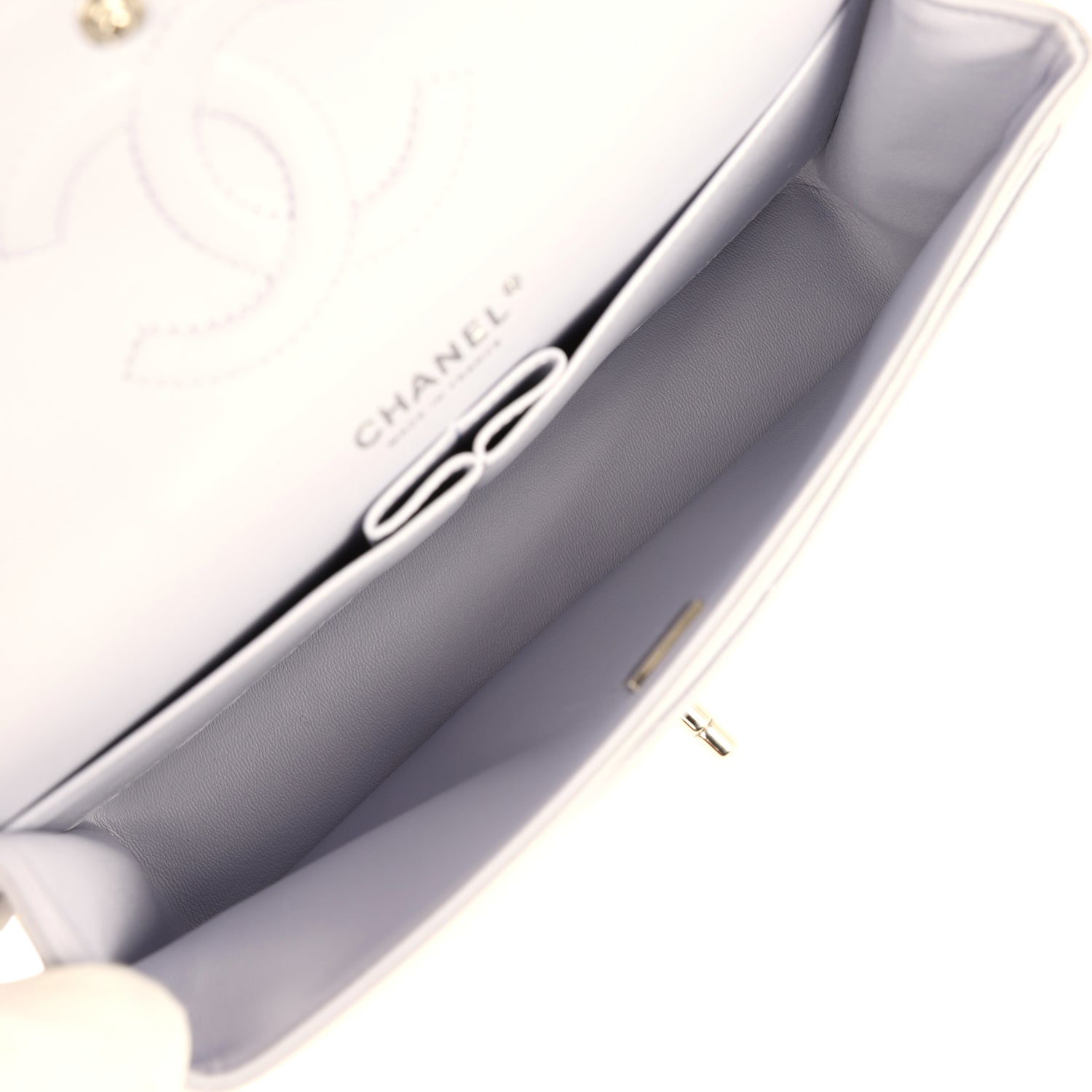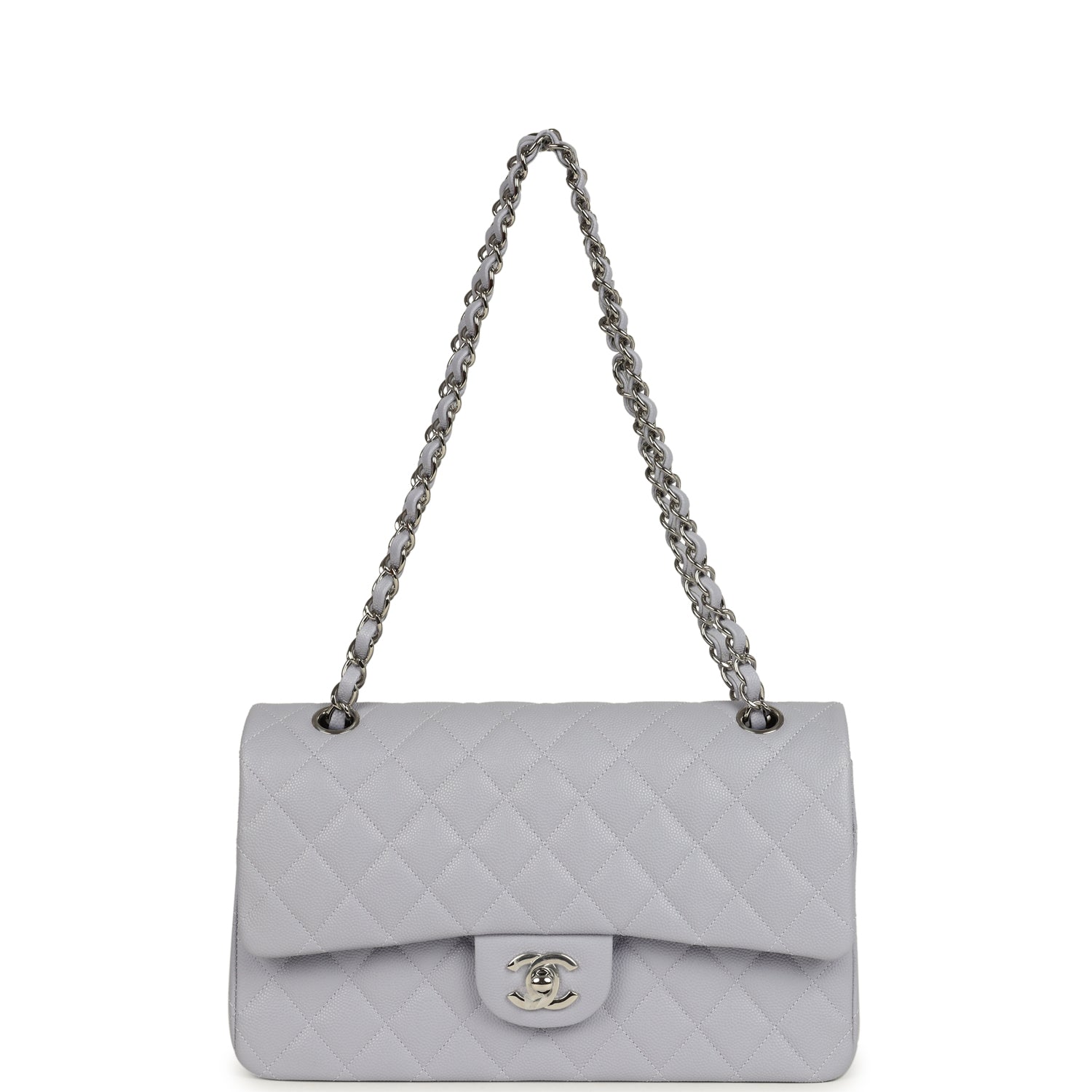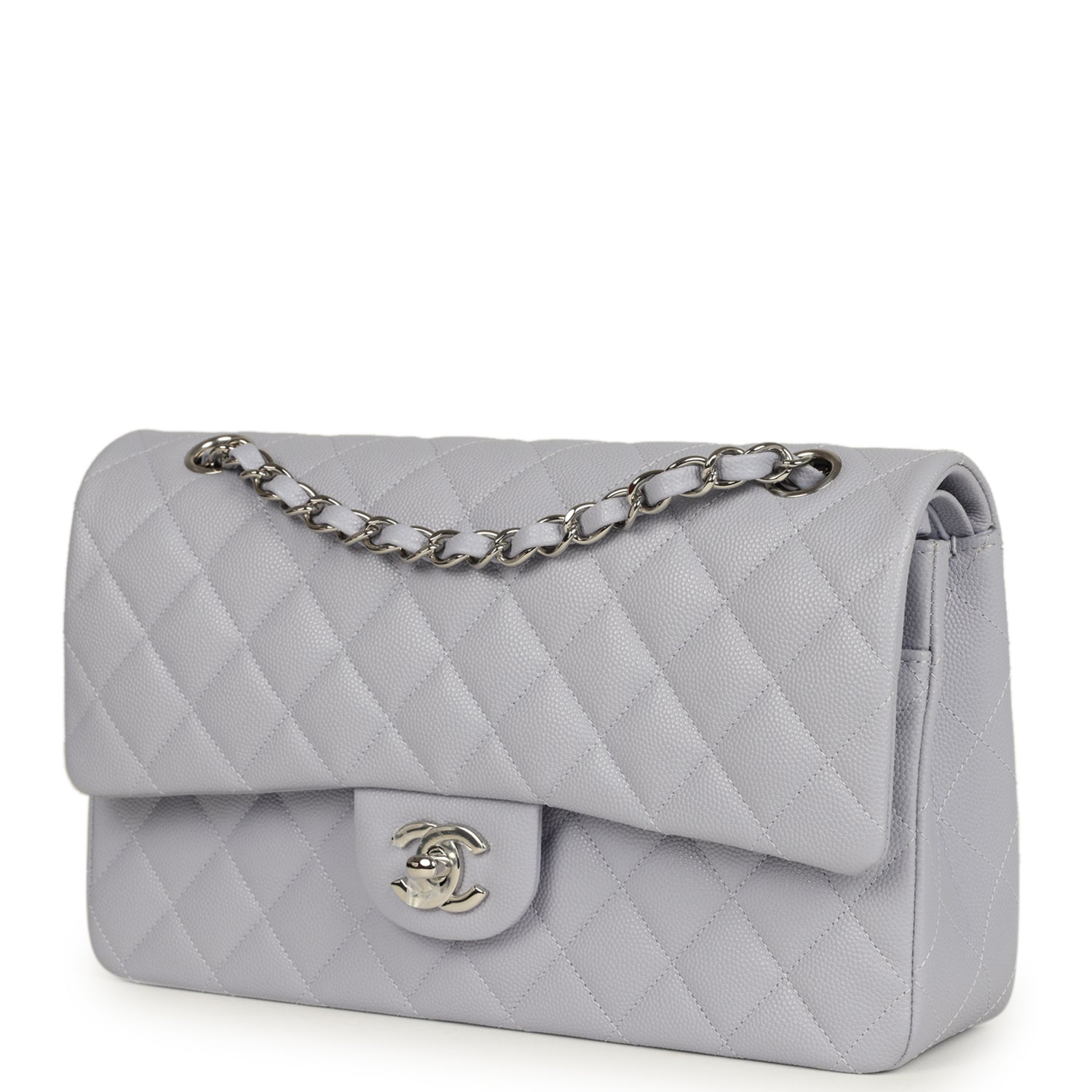 This Medium Classic Double Flap Bag in light purple caviar leather with silver tone hardware. front flap with CC turnlock closure. half moon back pocket and adjustable interwoven light gold tone chain link and light purple lambskin leather shoulder/crossbody strap.