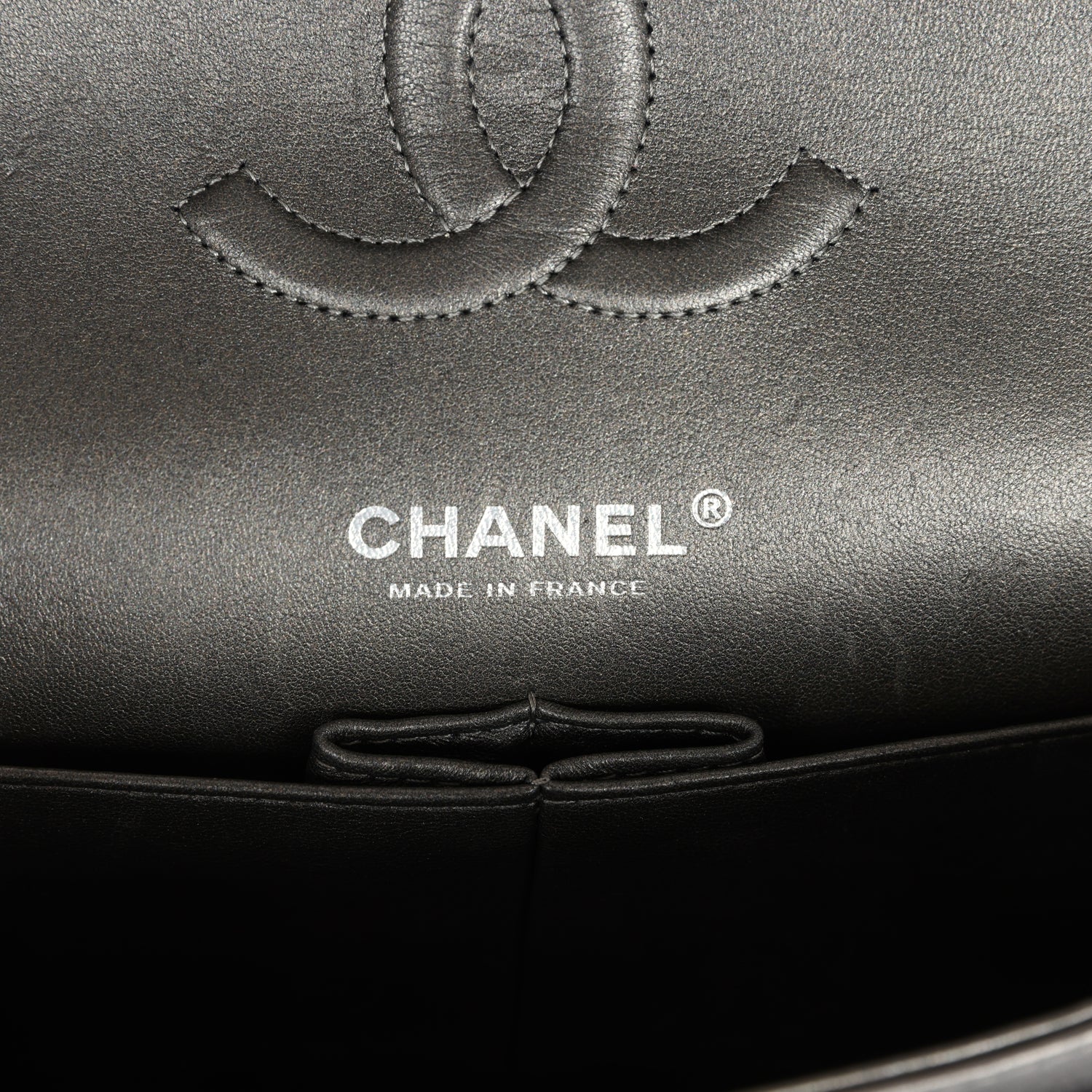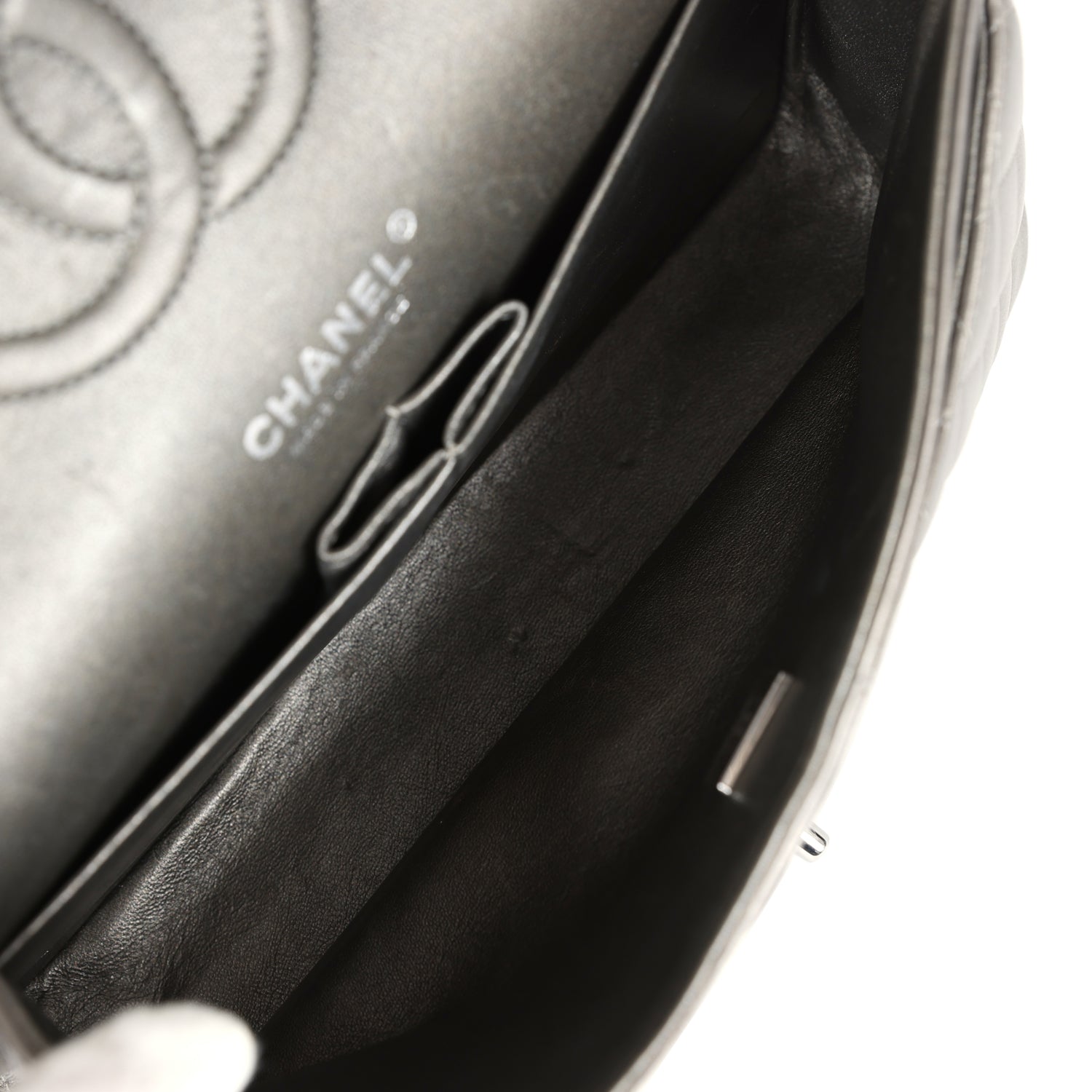 The interior is lined in metallic grey leather with the "love letter" zipper compartment under the first flap. an "outer" slit pocket is under the second flap. and an interior compartment with two open pockets separated by a "lipstick" compartment.