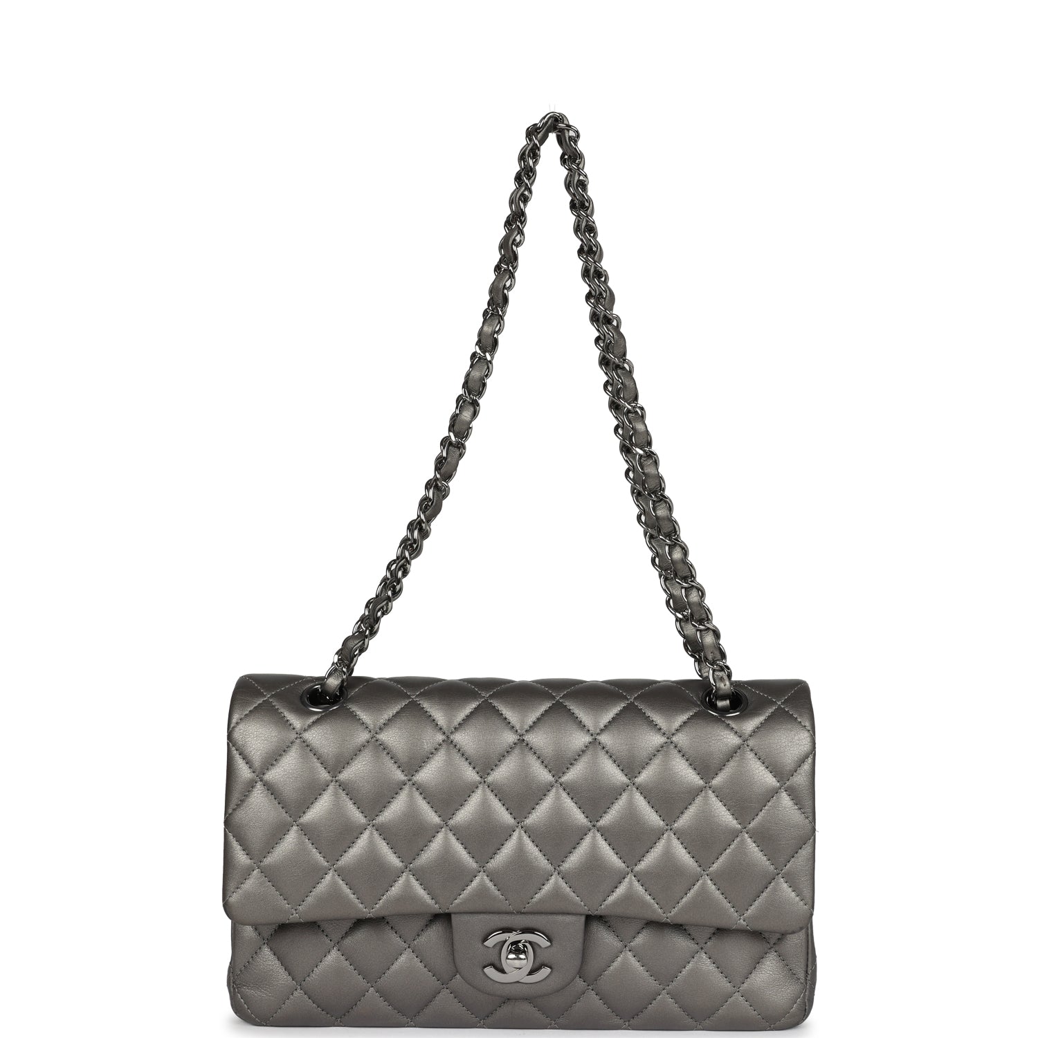 This Chanel Medium Classic Double Flap bag is in metallic grey lambskin leather with silver hardware. front flap with CC turnlock closure. half moon back pocket and adjustable interwoven silver chain link and metallic grey leather shoulder/crossbody strap.