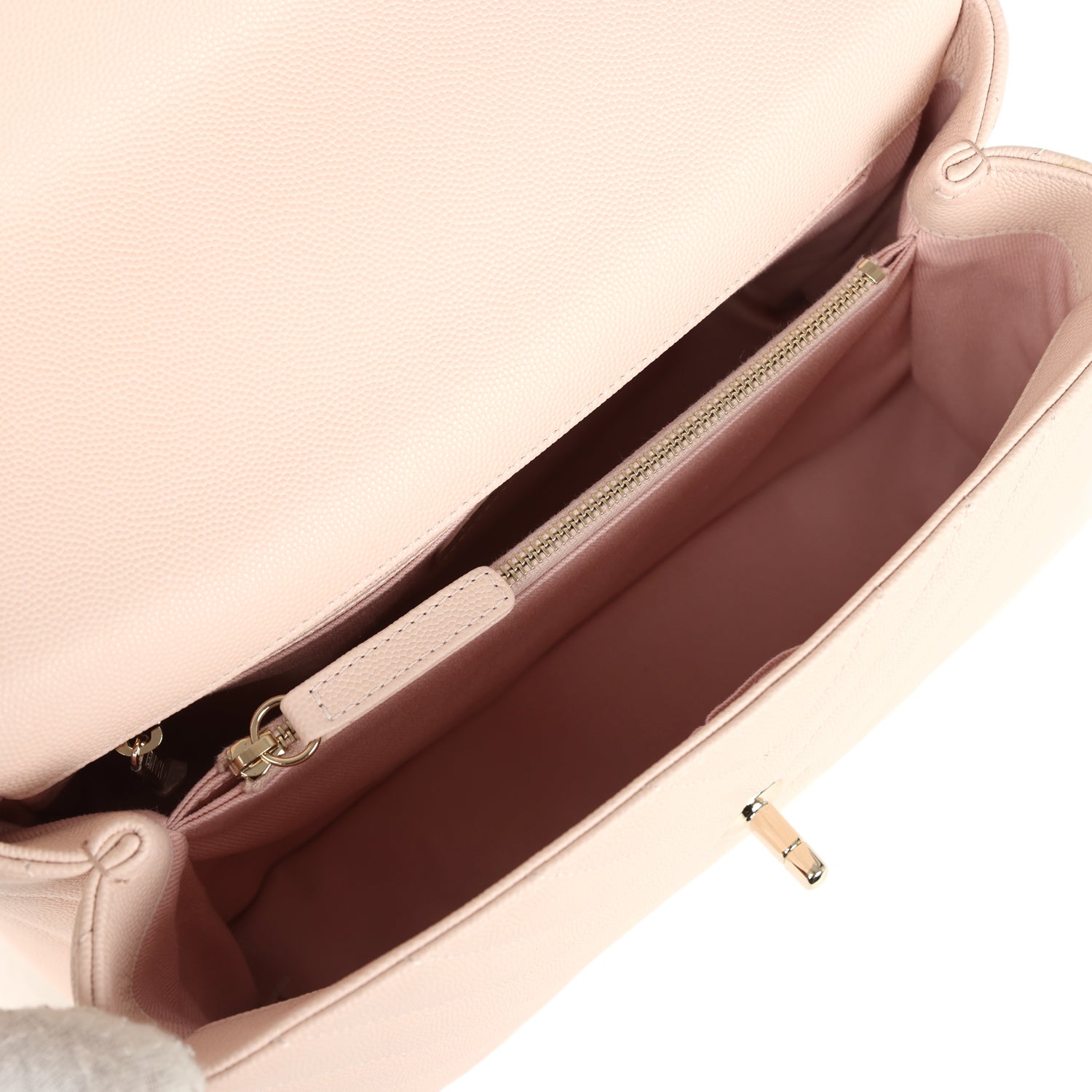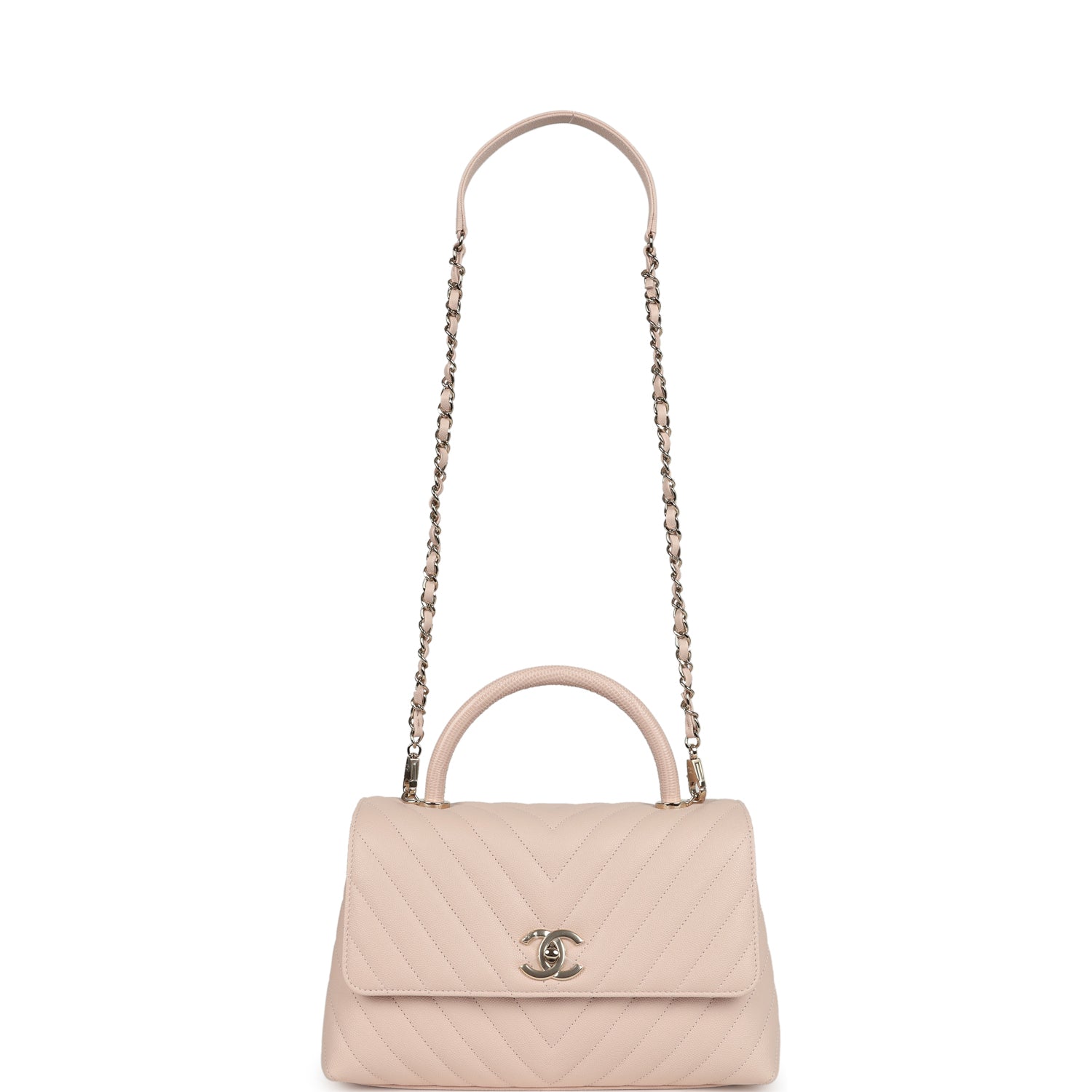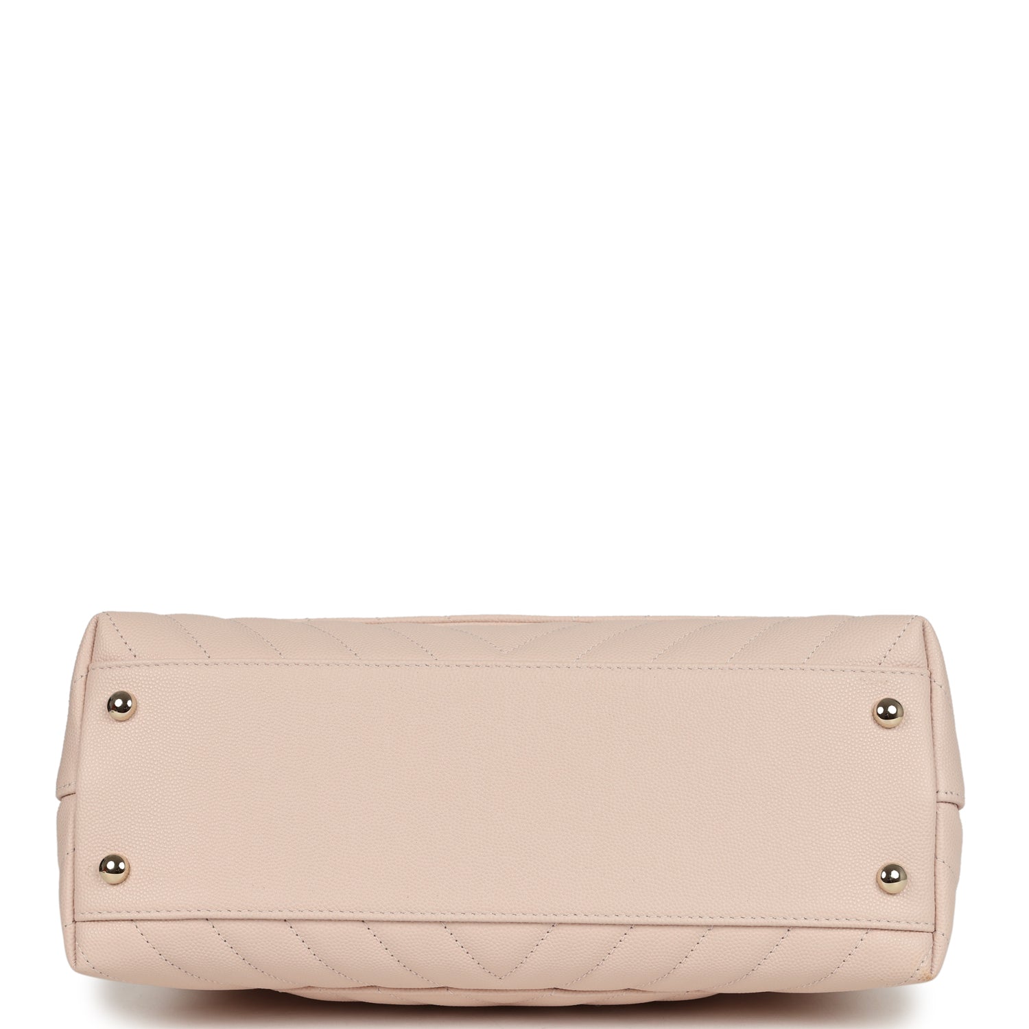 This Medium Chevron Coco Top Handle Flap bag is of light beige caviar leather with light gold tone hardware and has the signature chevron quilting in a trapezoidal shape with signature CC interlocking closure. half moon exterior pocket. a leather top handle with liight gold tone chainlink. and a single removable interwoven light gold tone and light beige leather chainlink shoulder strap.