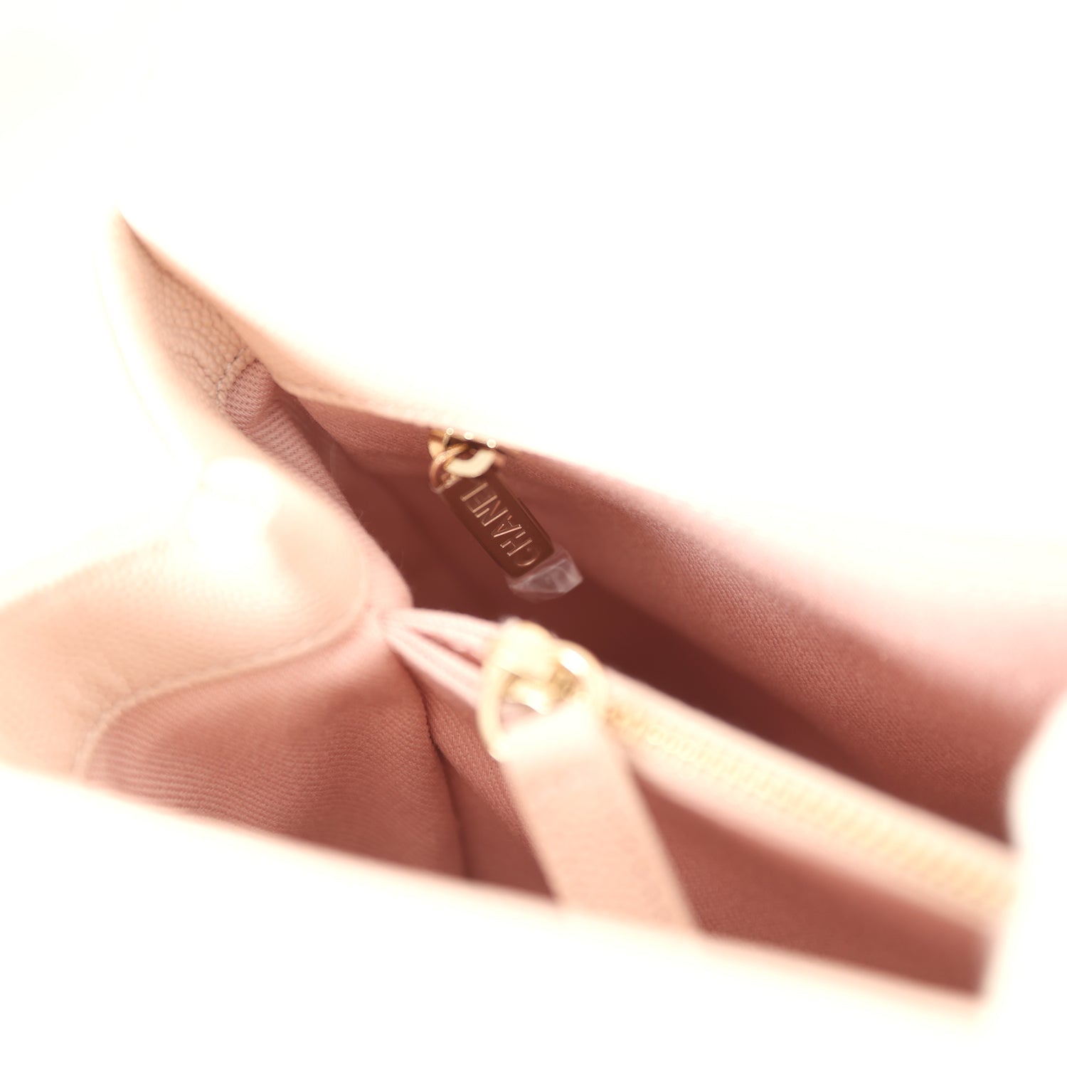 The interior is lined in light pink grossgrain fabric and has two main open compartments. one zip pocket on the rear wall. two small slip pockets on the front wall. and one center divide zip pocket.