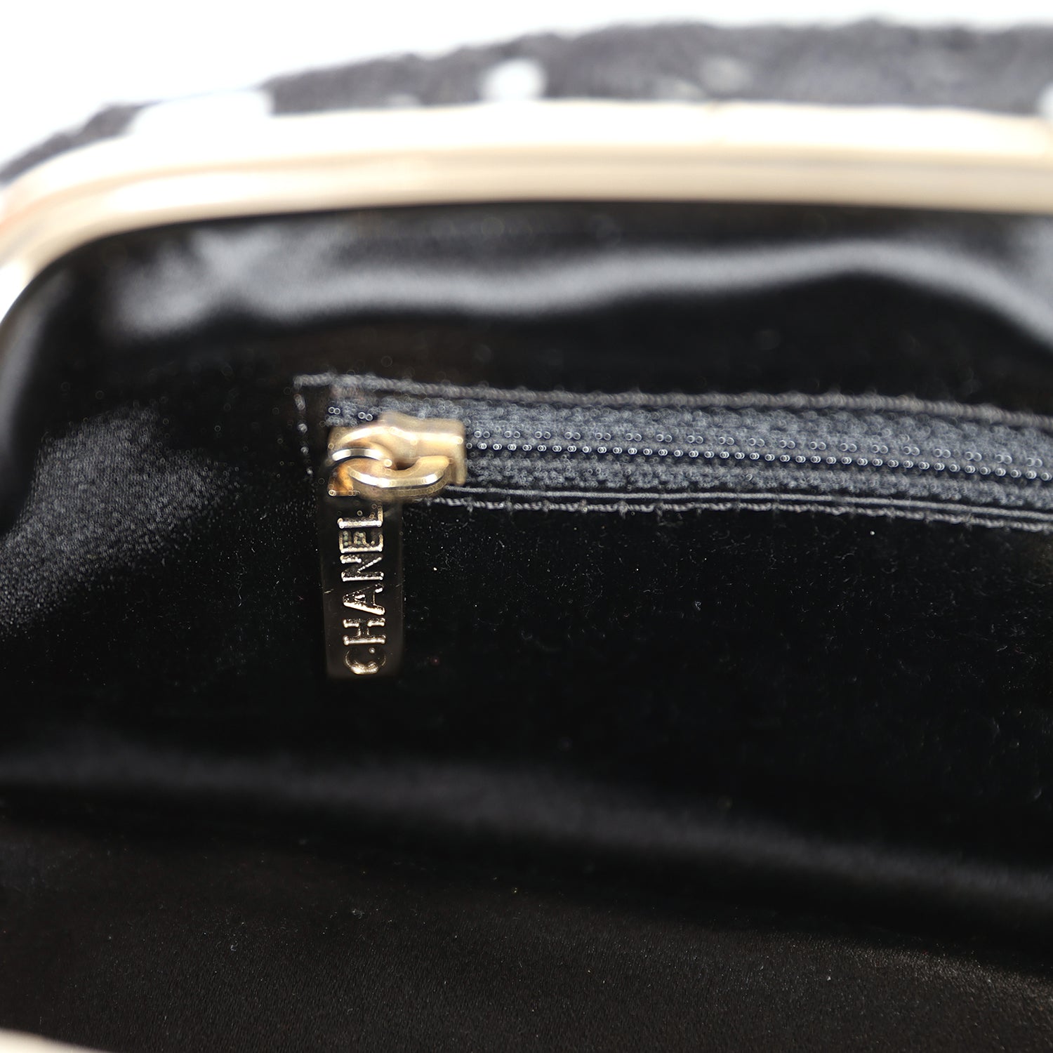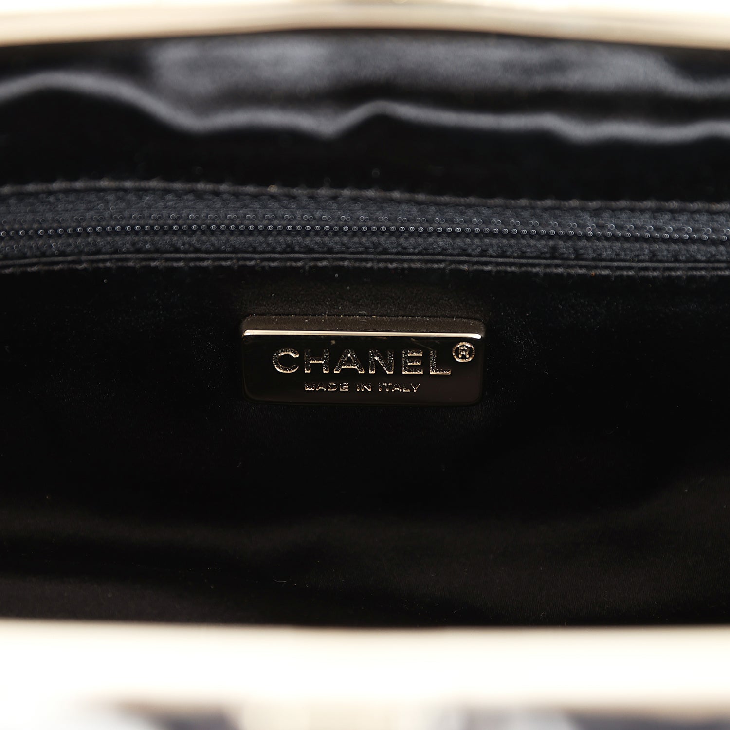 The interior is lined in black satin and has one zip pocket with Chanel pull.