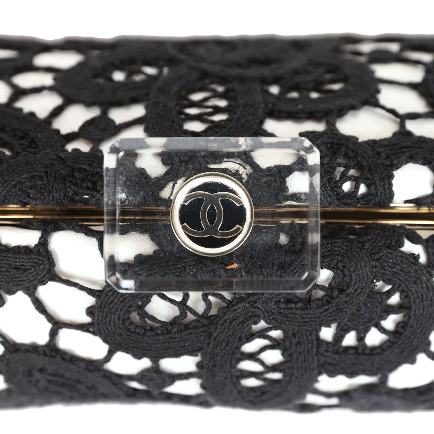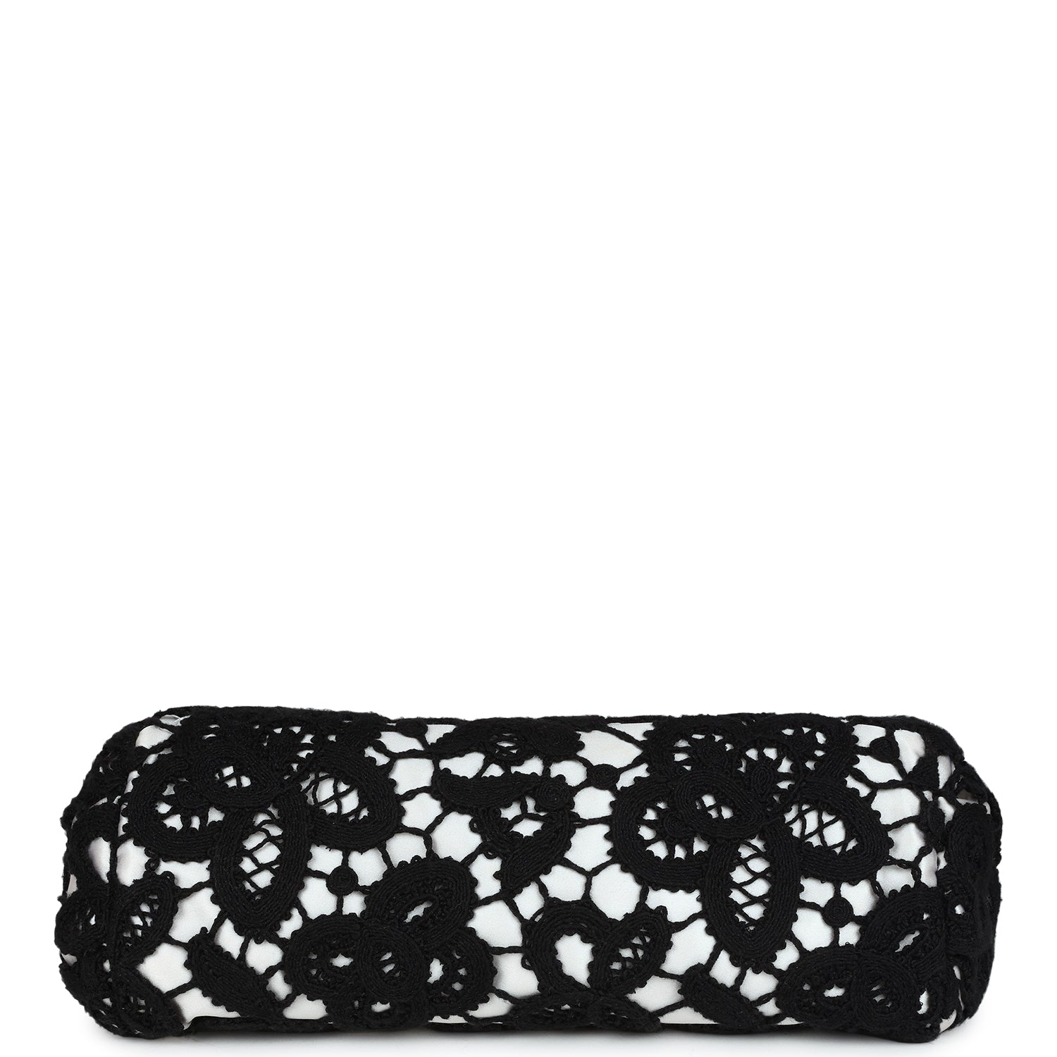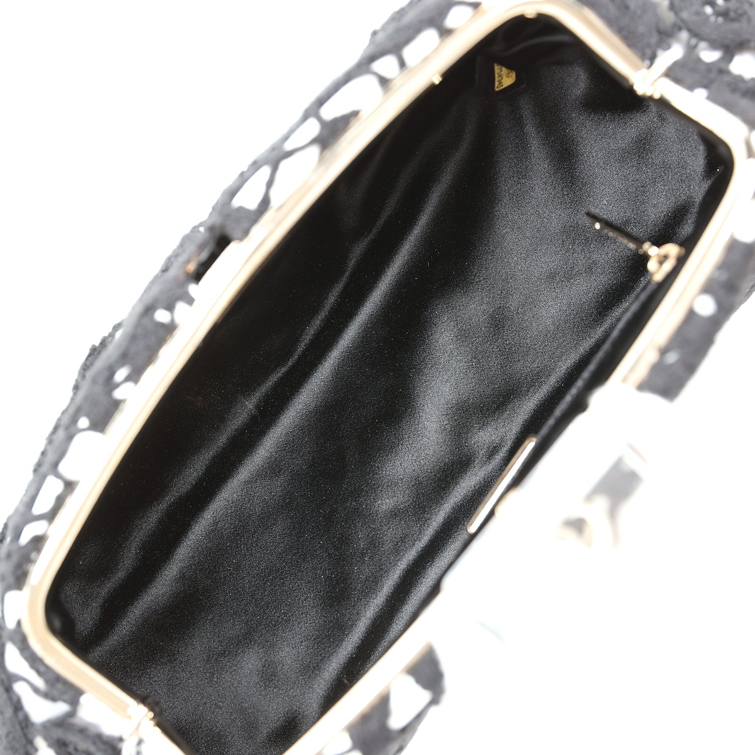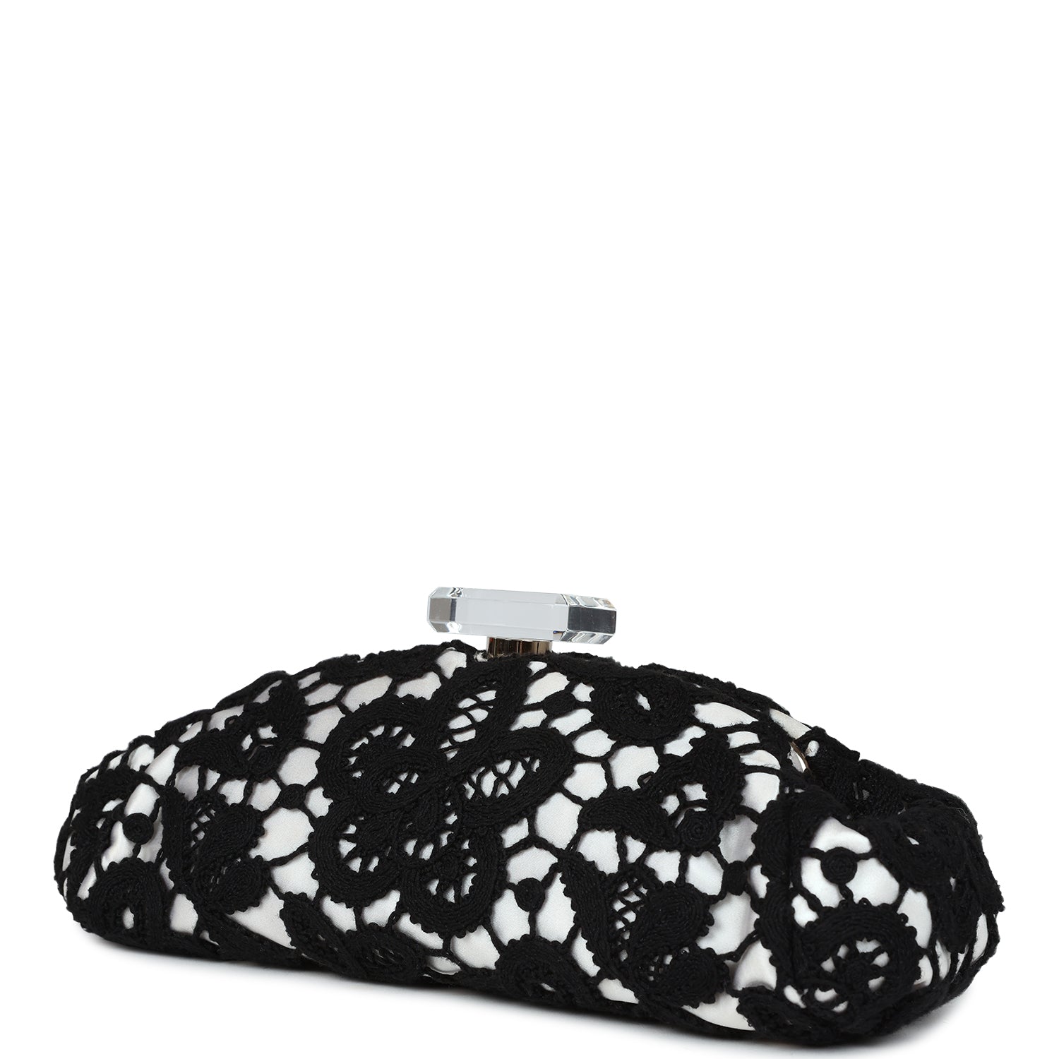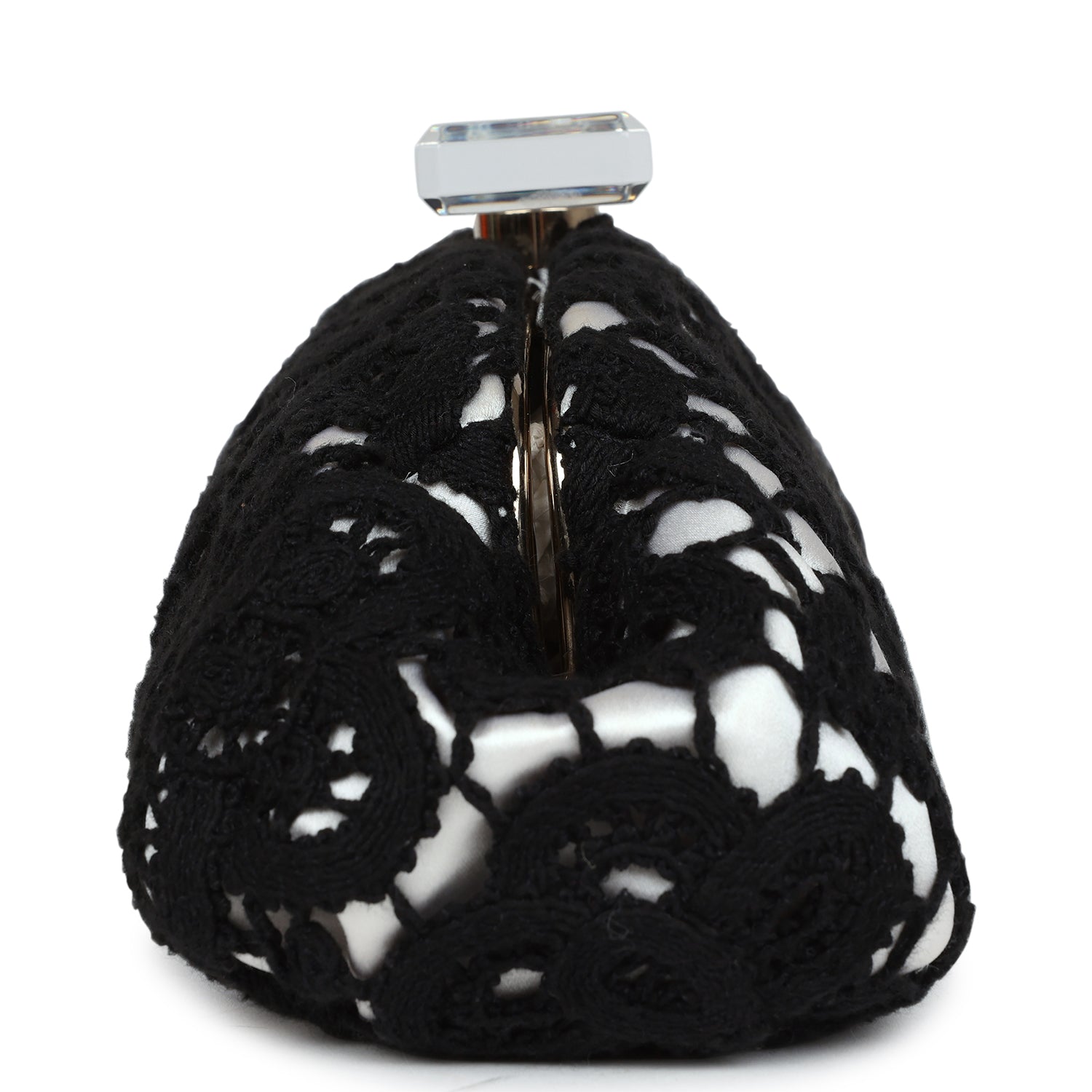 This clutch is in black lace and White satin with gold hardware. featuring a black lace overlay. gold-tone metal frame. and perfume bottle shaped top snap closure.