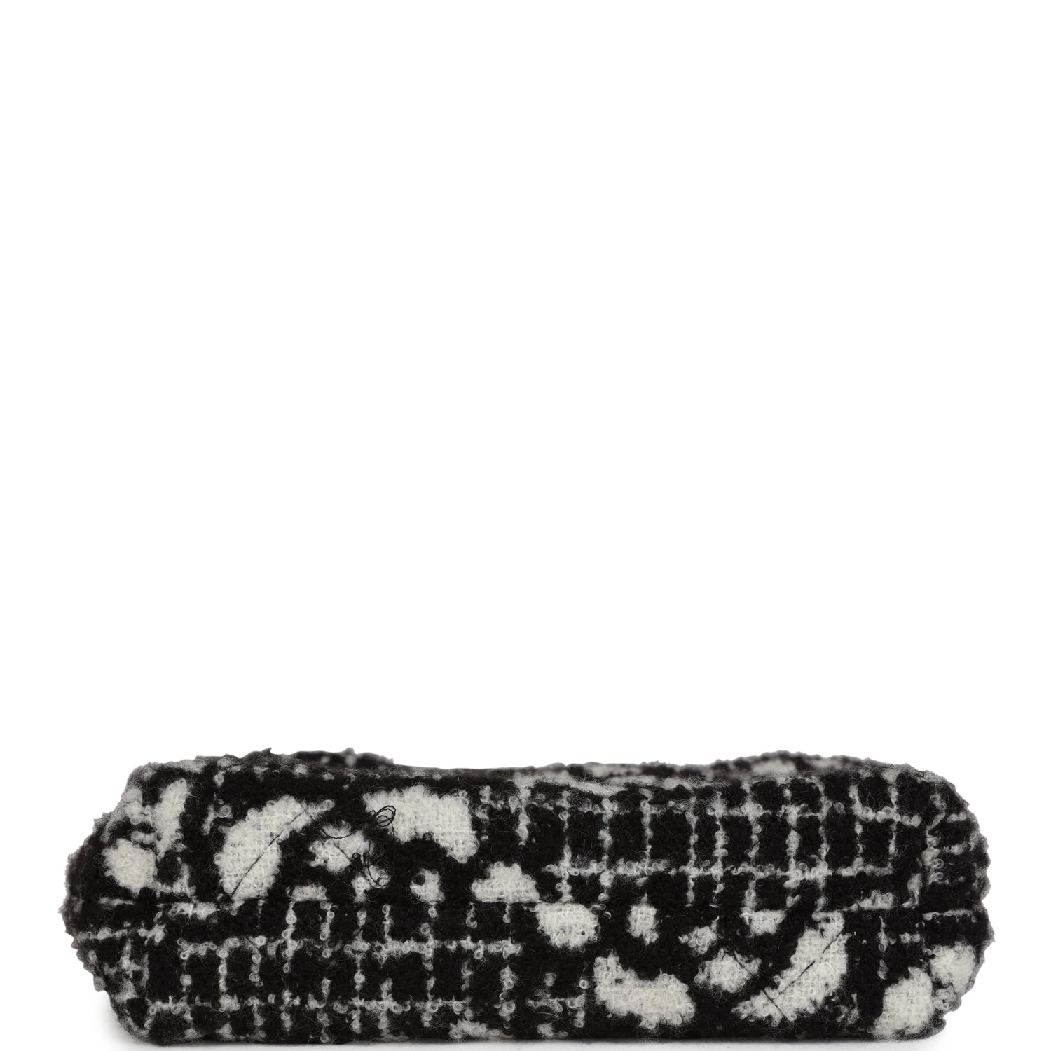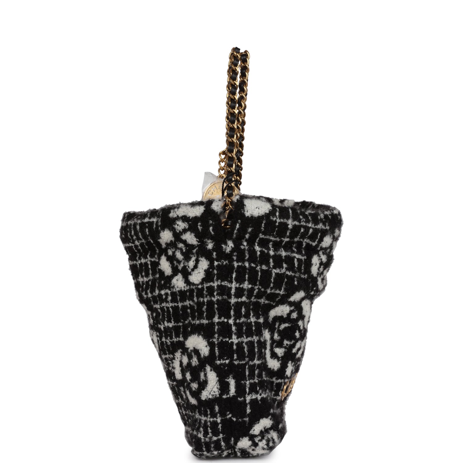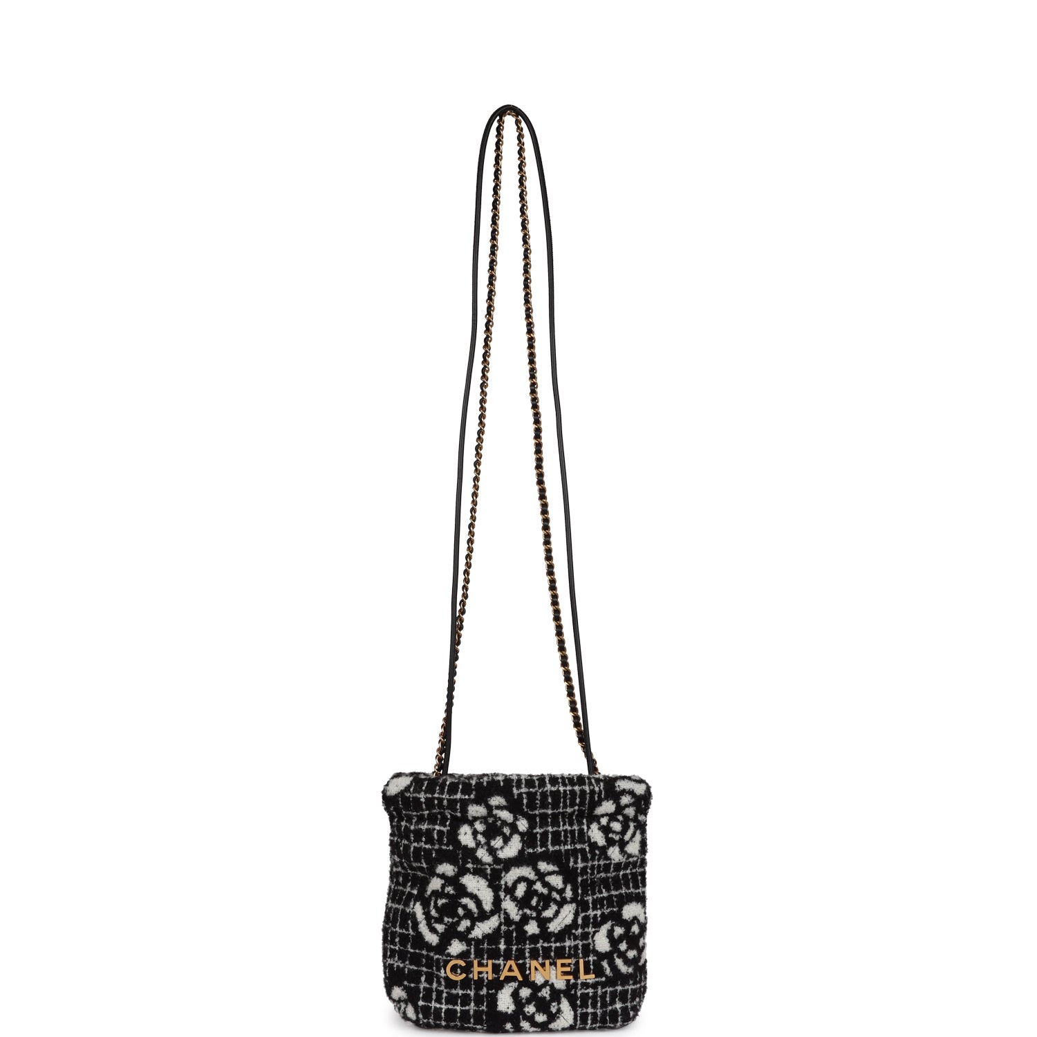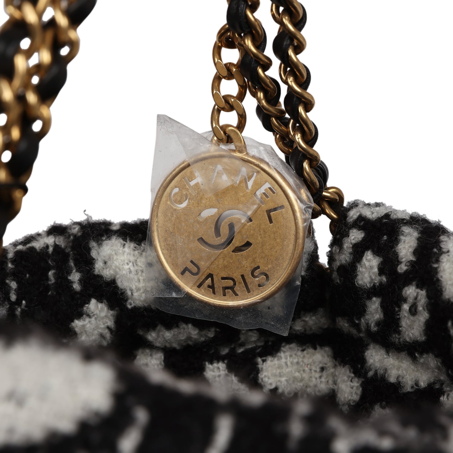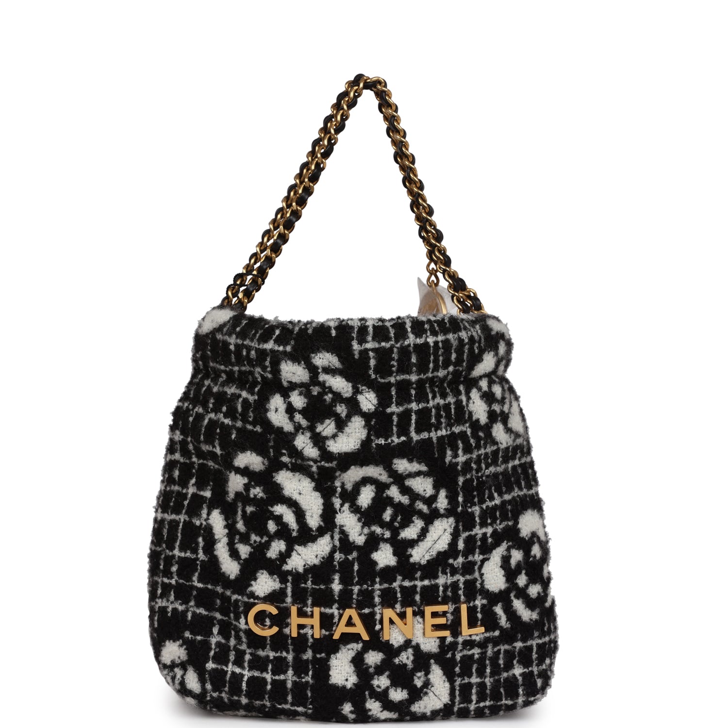 This Mini 22 Hobo Bag is in black and white floral tweed with gold tone hardware. CHANEL on the front in gold tone metal. a short gold tone and leather interwoven chain. a long one. and a long leather cord strap.