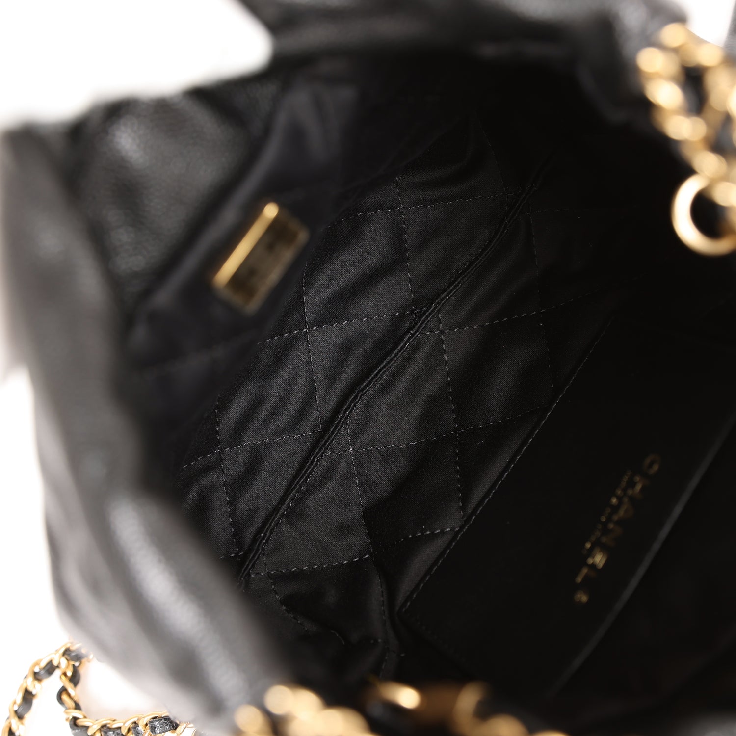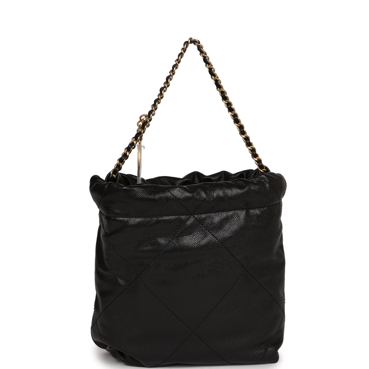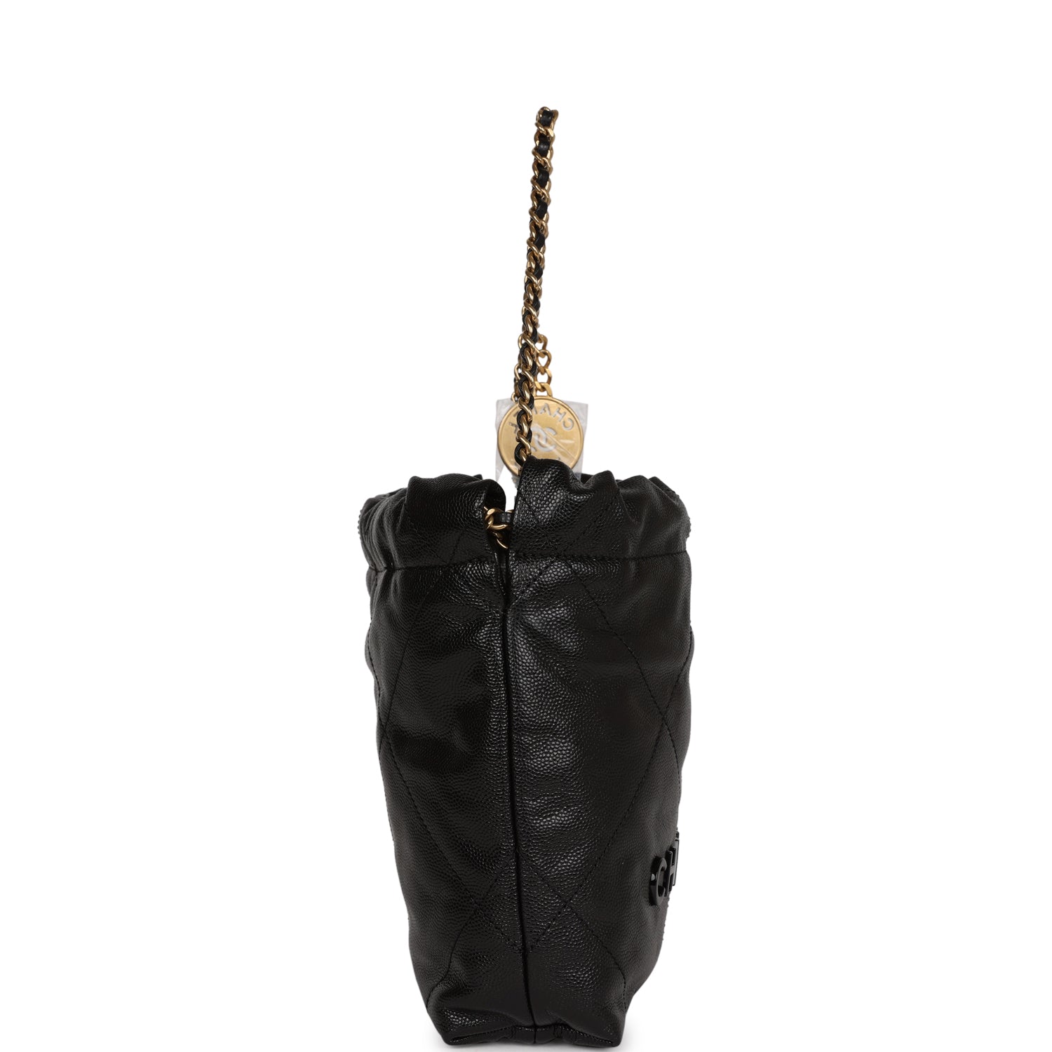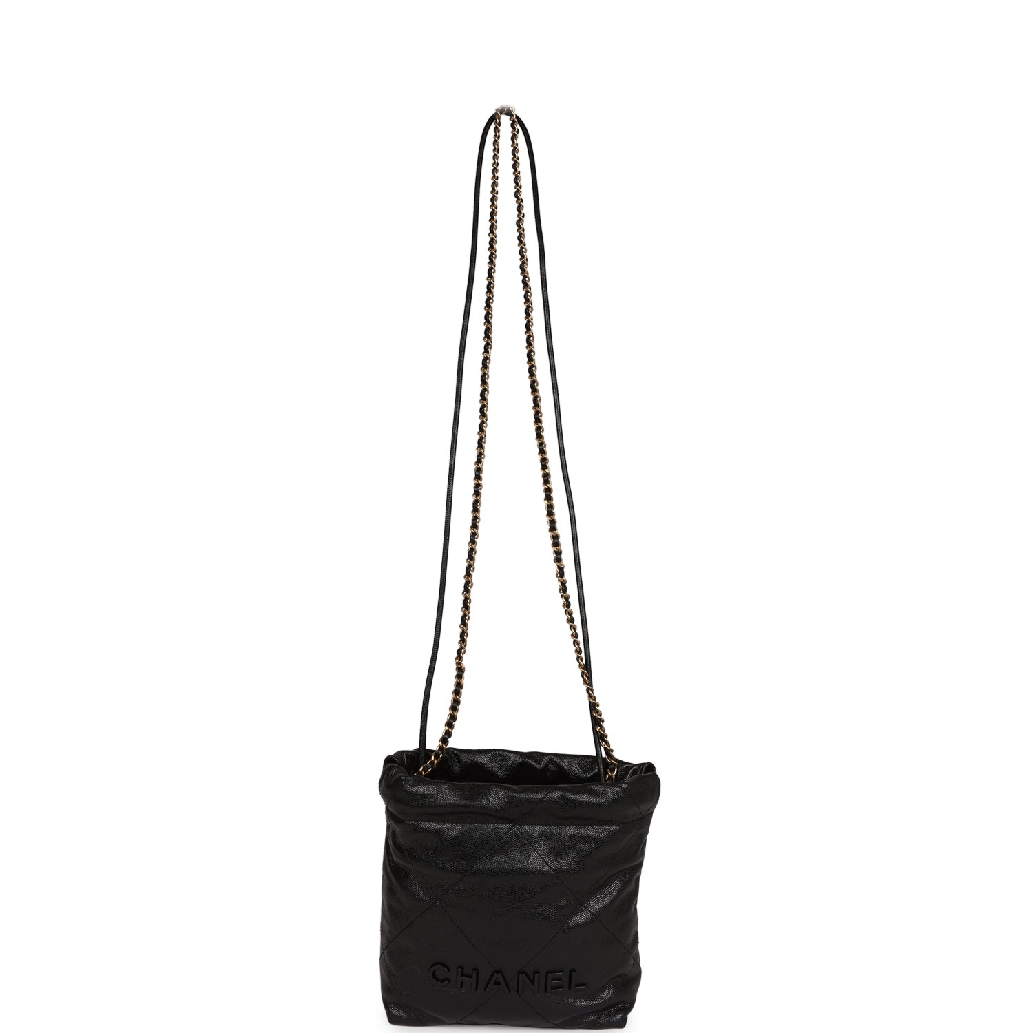 This Mini 22 Hobo Bag is in black grained calfskin with gold tone hardware. CHANEL on the front in black tone metal. a short gold tone and leather interwoven chain. a long one. and a long leather cord strap.
