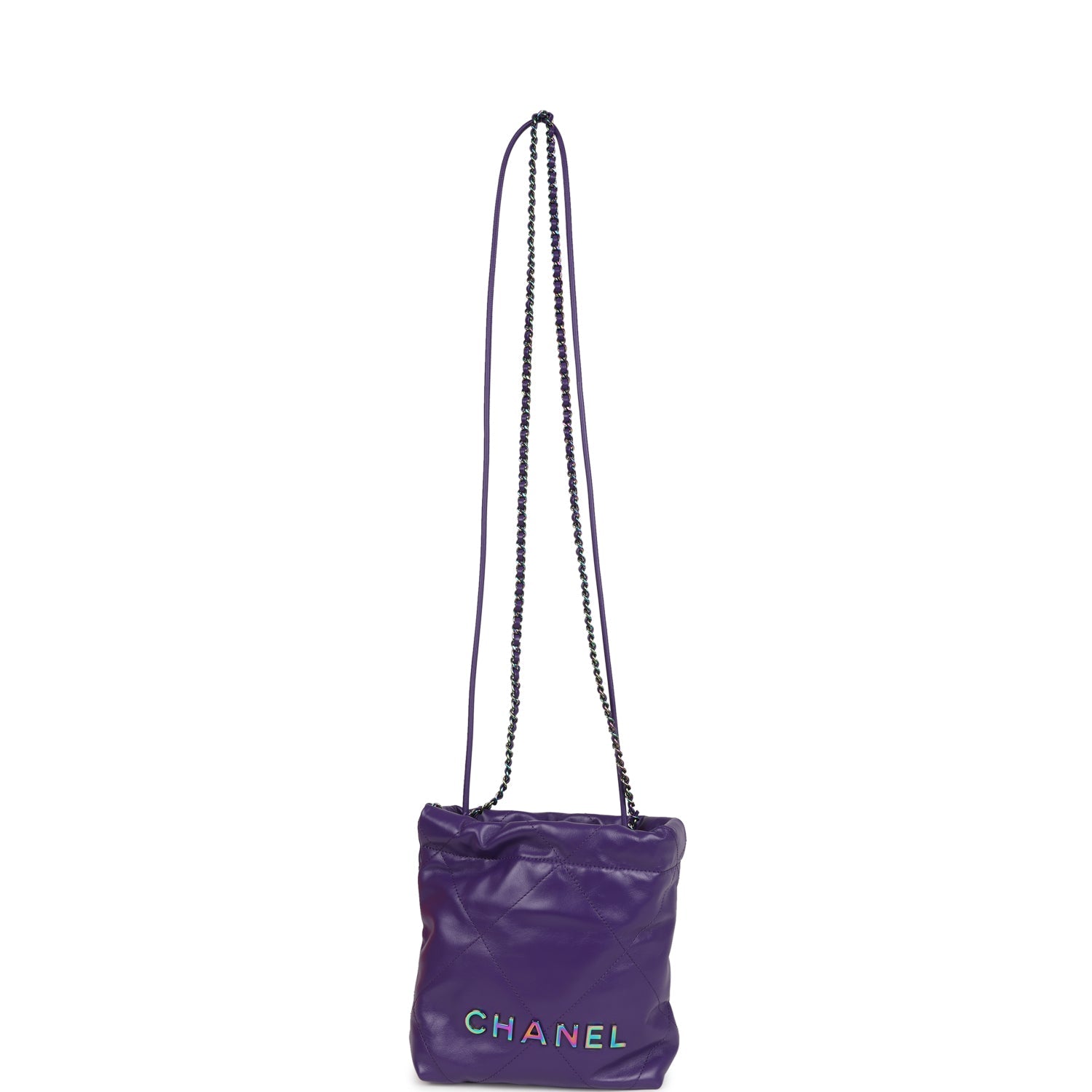 This Chanel Mini 22 Bag is in dark purple lambskin leather with rainbow lacquered hardware. has the signature diamond quilt. lacquered metal "Chanel" logo on front of bag. Chanel Paris metal hang tag. and a lacquered chainlink and interwoven with leather shoulder strap. and one long leather cord shoulder/crossbody strap.