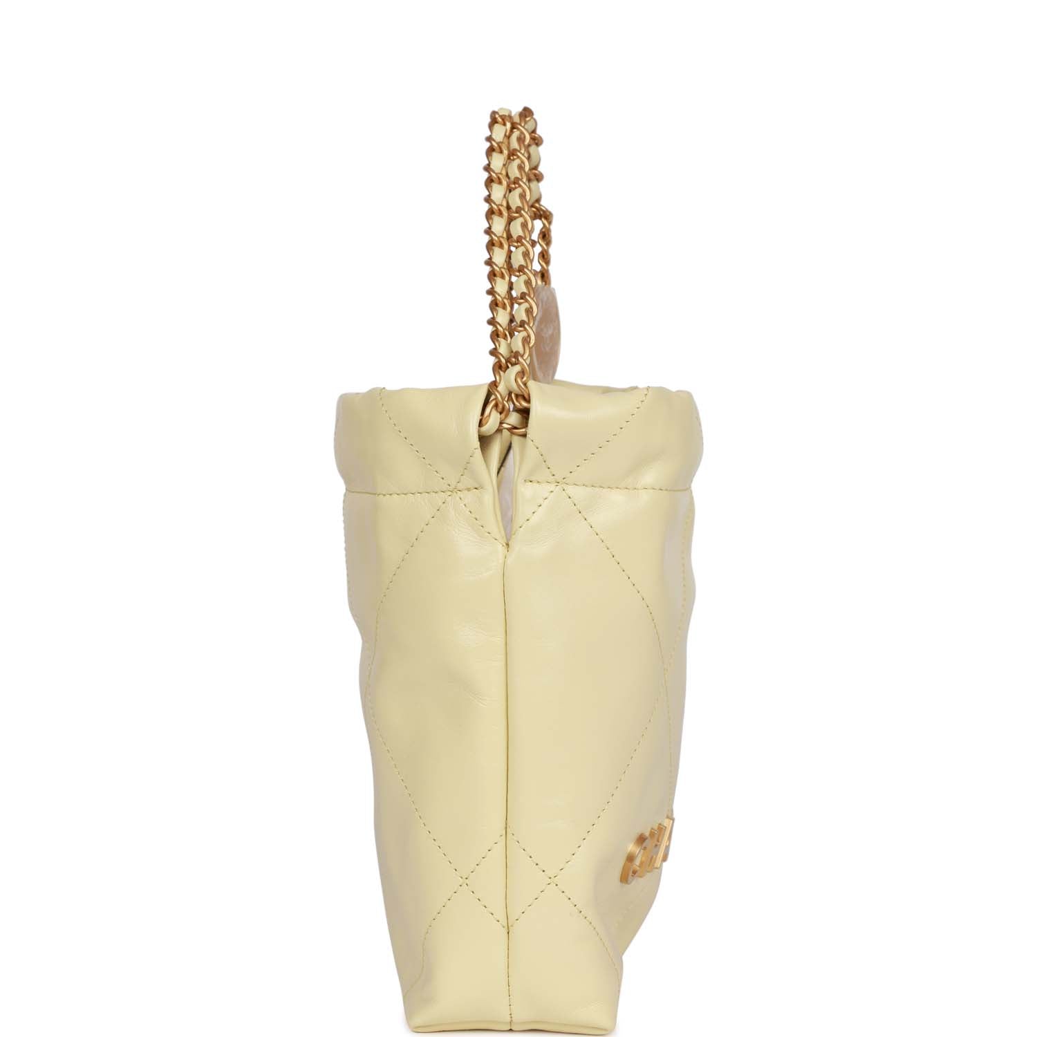 This mini 22 hobo bag in yellow calfskin with gold tone hardware and has the signature diamond quilting. CHANEL on the front in gold metal. and long gold tone and yellow leather interwoven chain.