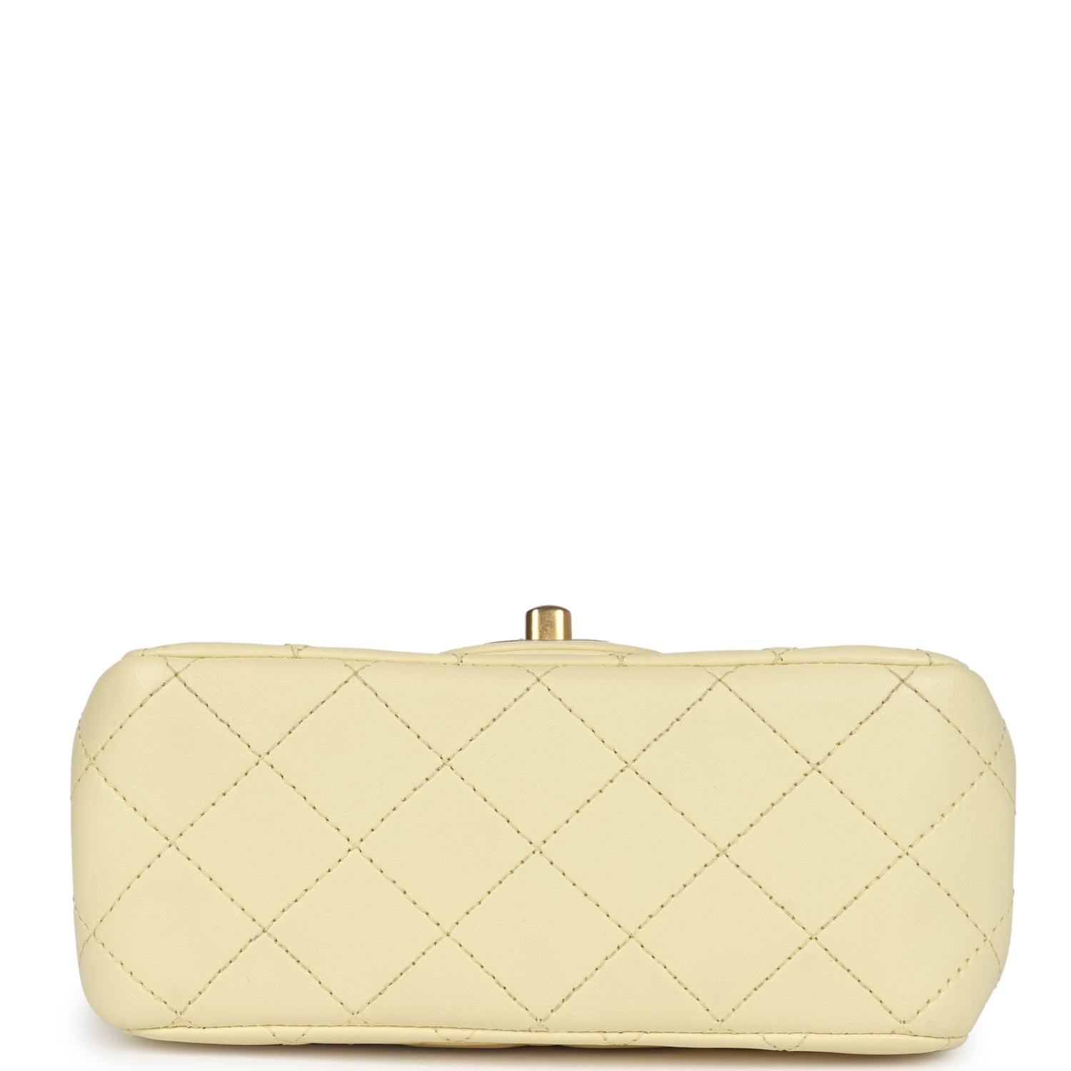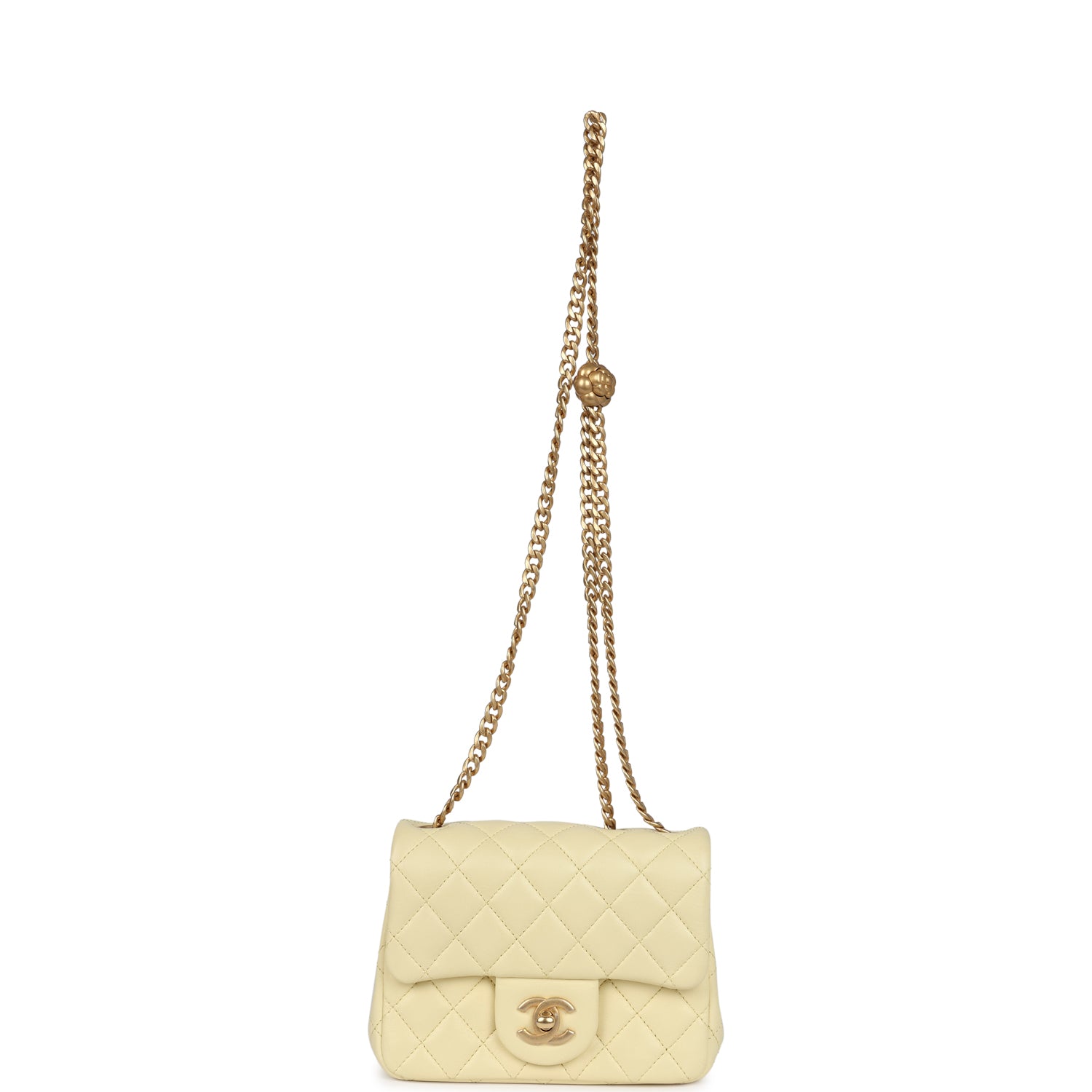This Chanel Camellia Crush Mini Flap bag is in light yellow lambskin leather with antique gold tone hardware and features a front flap with CC turnlock closure. back half moon pocket and adjustable interwoven antique gold tone chain link shoulder/crossbody strap with camellia flower attachment.
