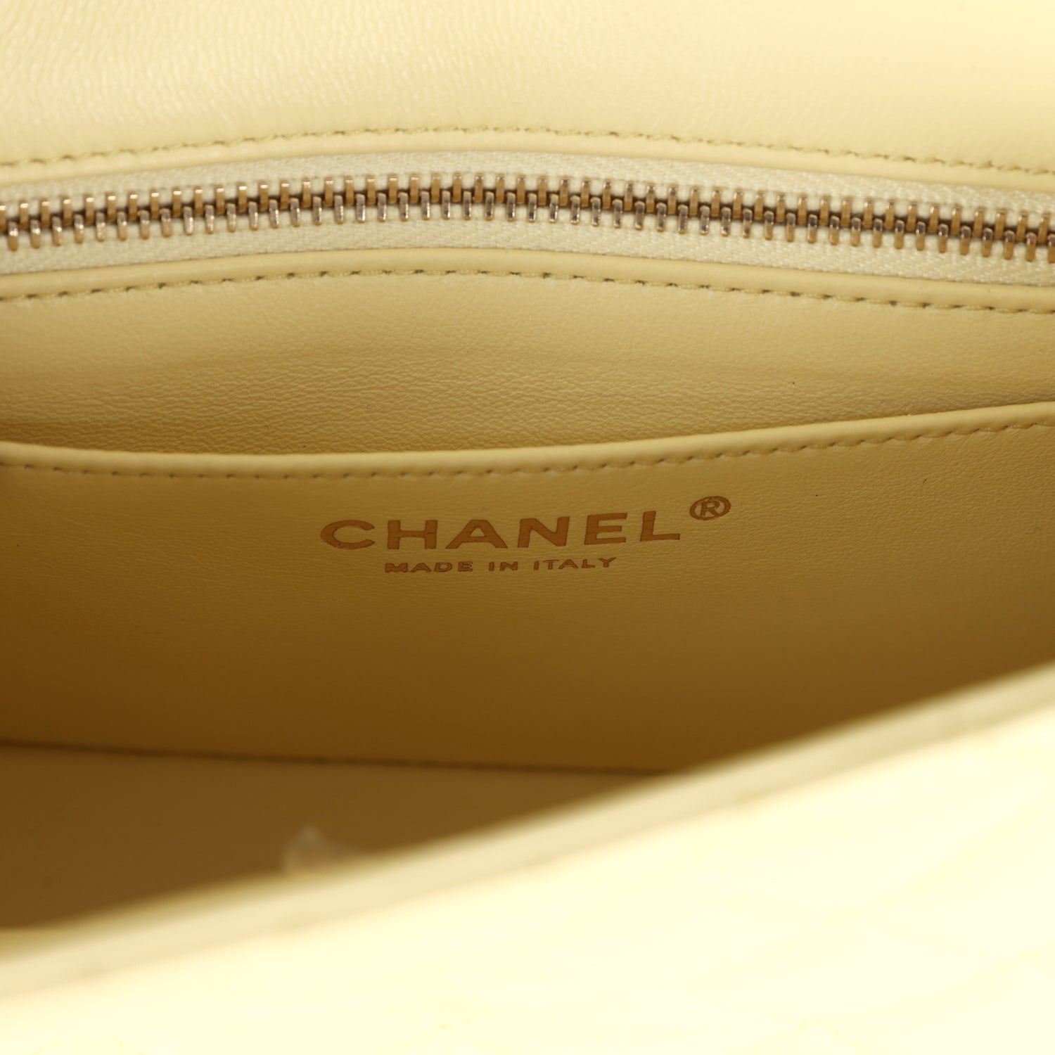 The interior is lined in light yellow leather and features a small zip pocket with Chanel pull and slip pocket underneath on the rear wall.