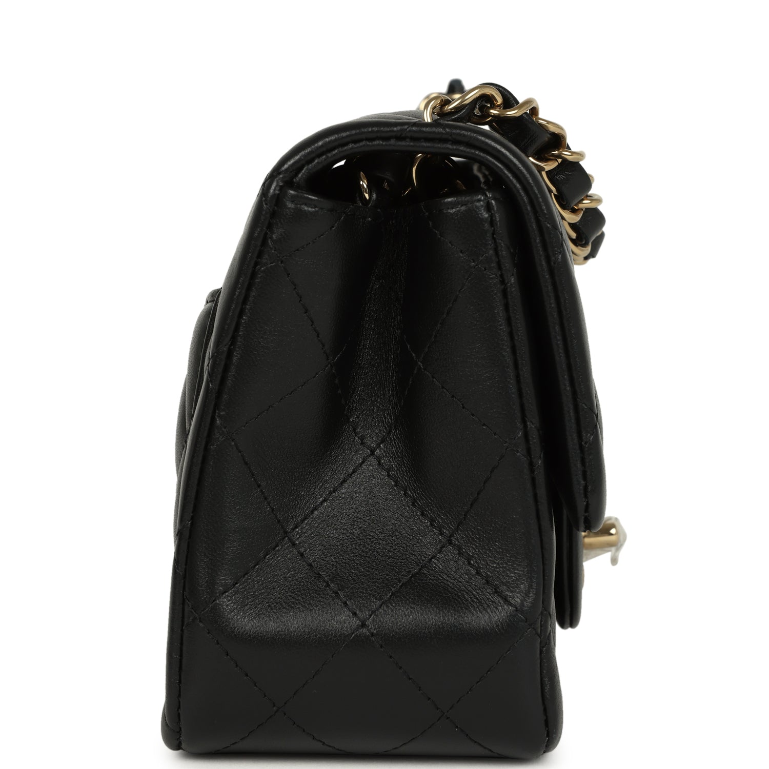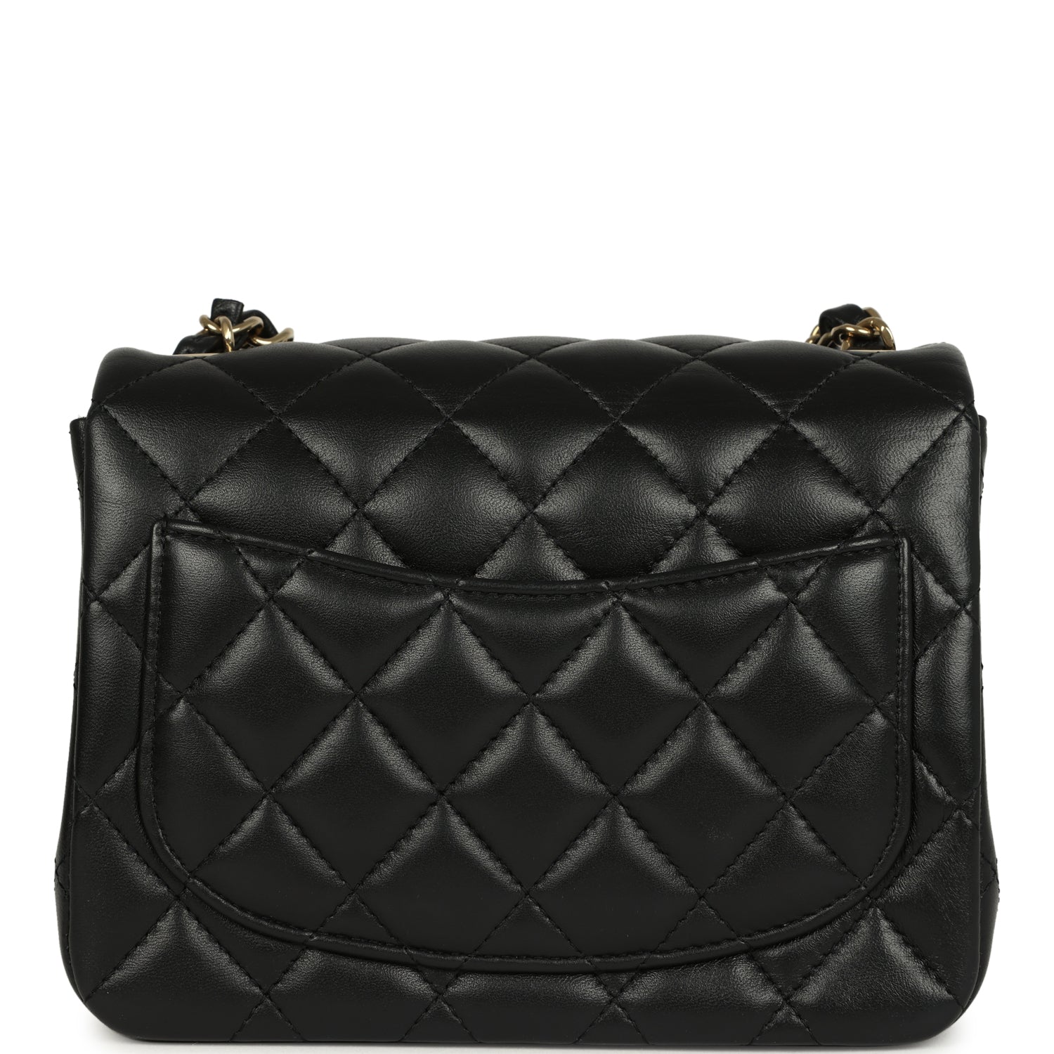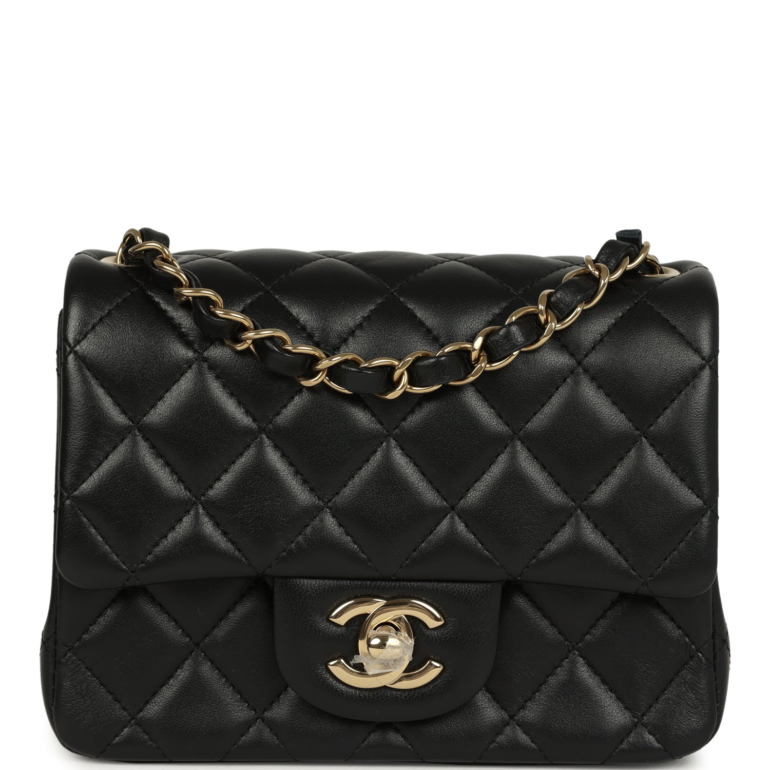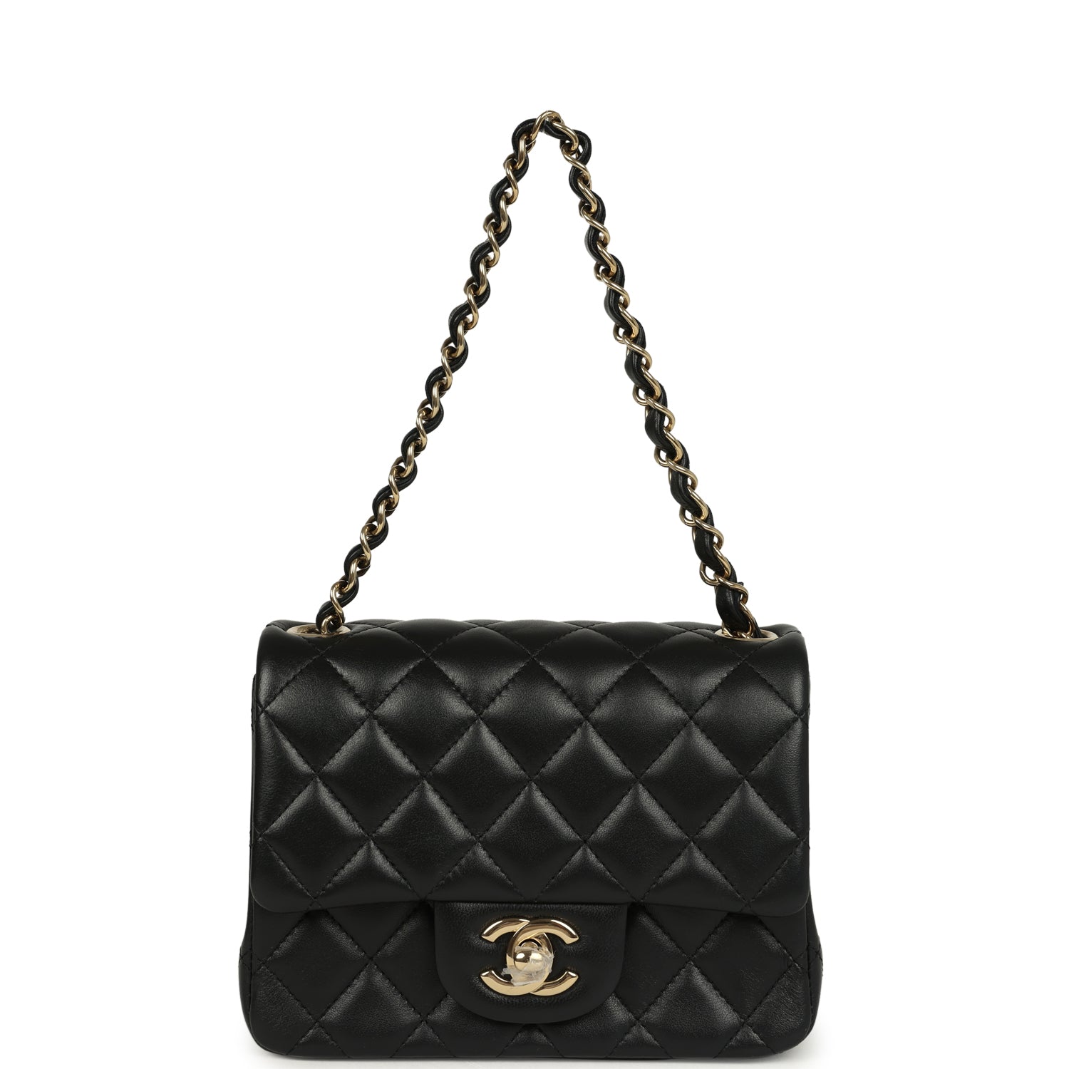This Chanel Classic Mini Square flap bag is in black lambskin leather with light gold tone hardware and has a front flap with signature CC turnlock closure. tonal stitching. rear half moon pocket and single interwoven black leather and light gold tone chain link shoulder/crossbody strap.