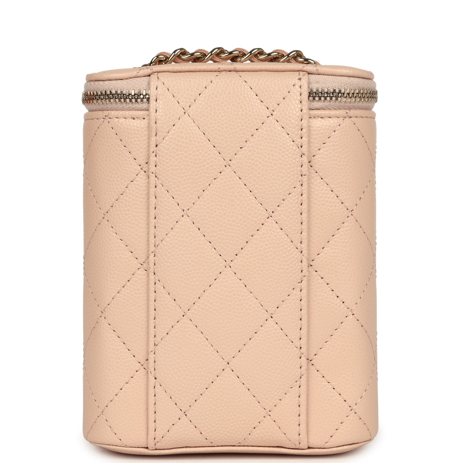 This Mini Clutch Vanity on Chain is in beige quilted caviar leather with light gold hardware. features a box-like design. top zipper closure. interwoven gold with beige leather shoulder/crossbody strap. and a CC emblem on the front of the bag.