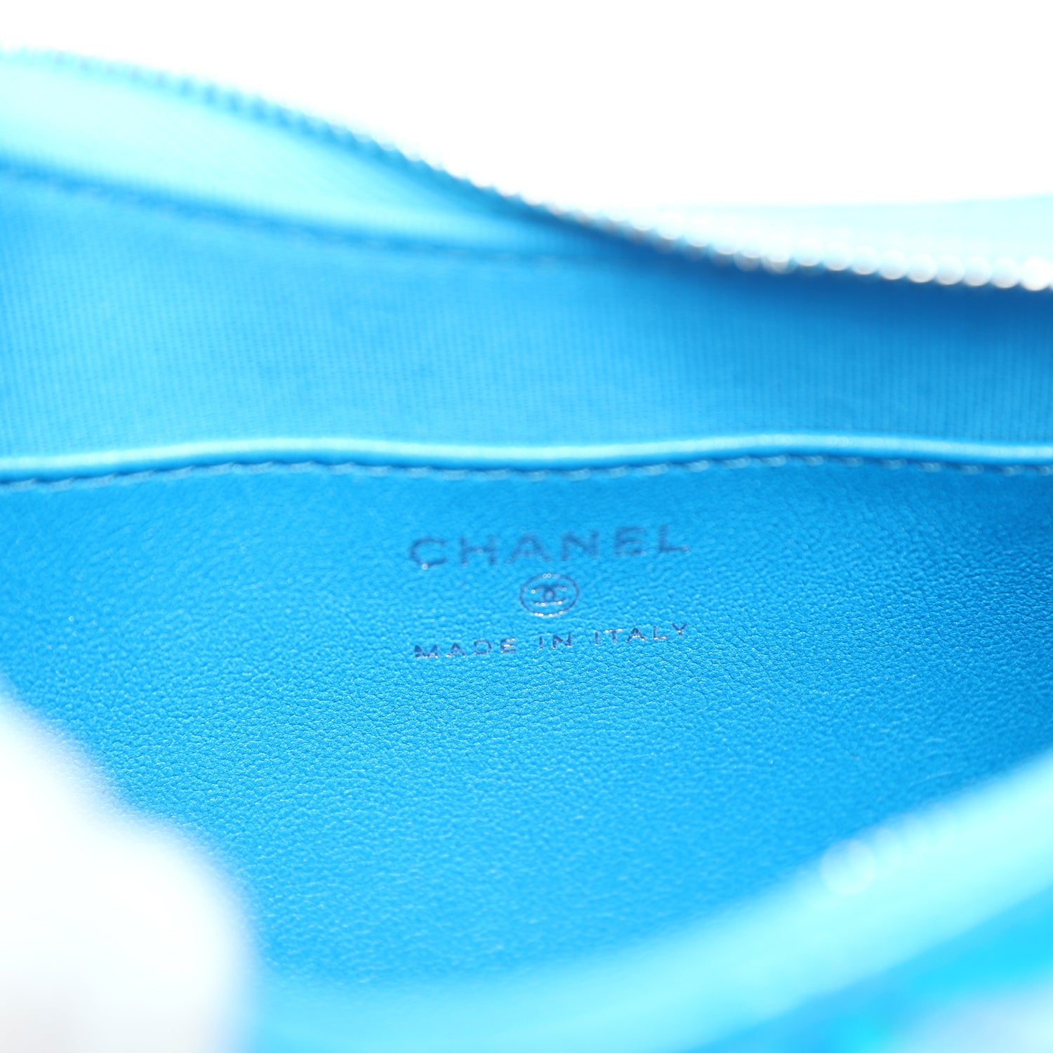 This Mini Hobo Crossbody Bag in blue metallic goatskin leather with silver hardware and features halfmoon round shape structure. tonal stitching. signature CC logo on front of bag. zippered closure. two interior slit pockets and a silver tone interwoven with blue leather chainlink shoulder/crossbody strap.
