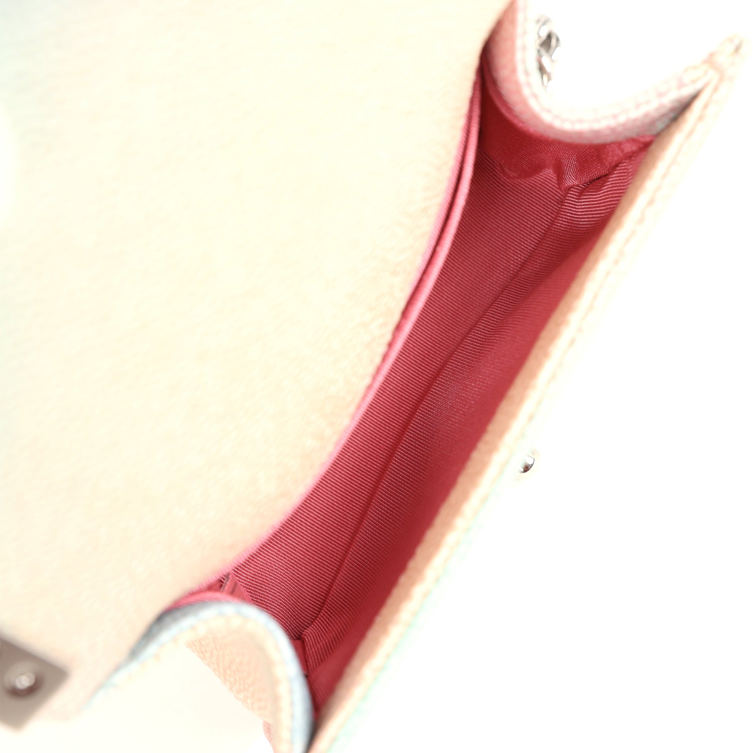 The interior is lined in pink grossgrain fabric and has one slit pocket on rear wall.