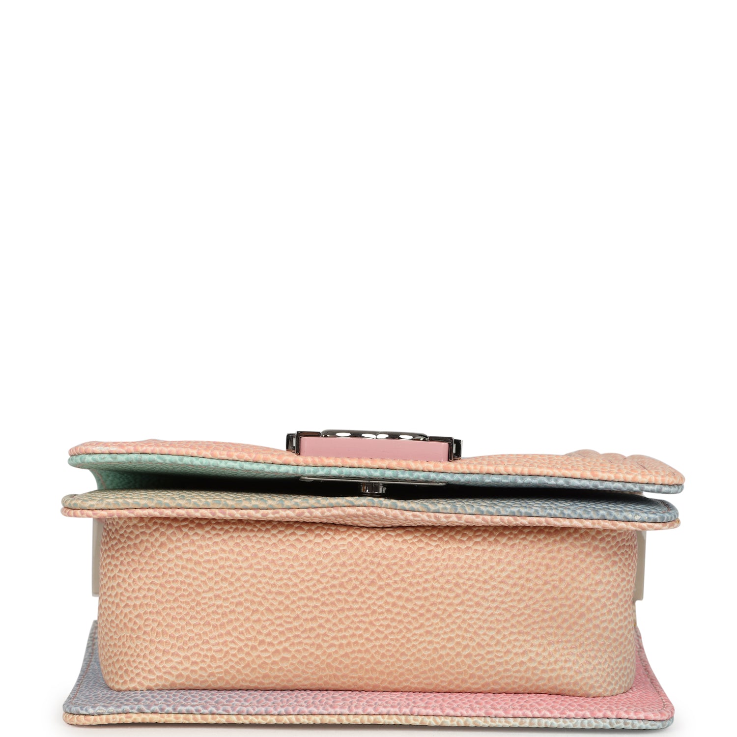 This Mini "Paris-Cuba" Rainbow Boy Bag is in multicolored caviar leather with silver tone hardware. and features tonal stitching. front flap with Pink enamel and silver tone Le Boy CC push closure. and an adjustable silver tone chainlink and rainbow leather shoulder strap.