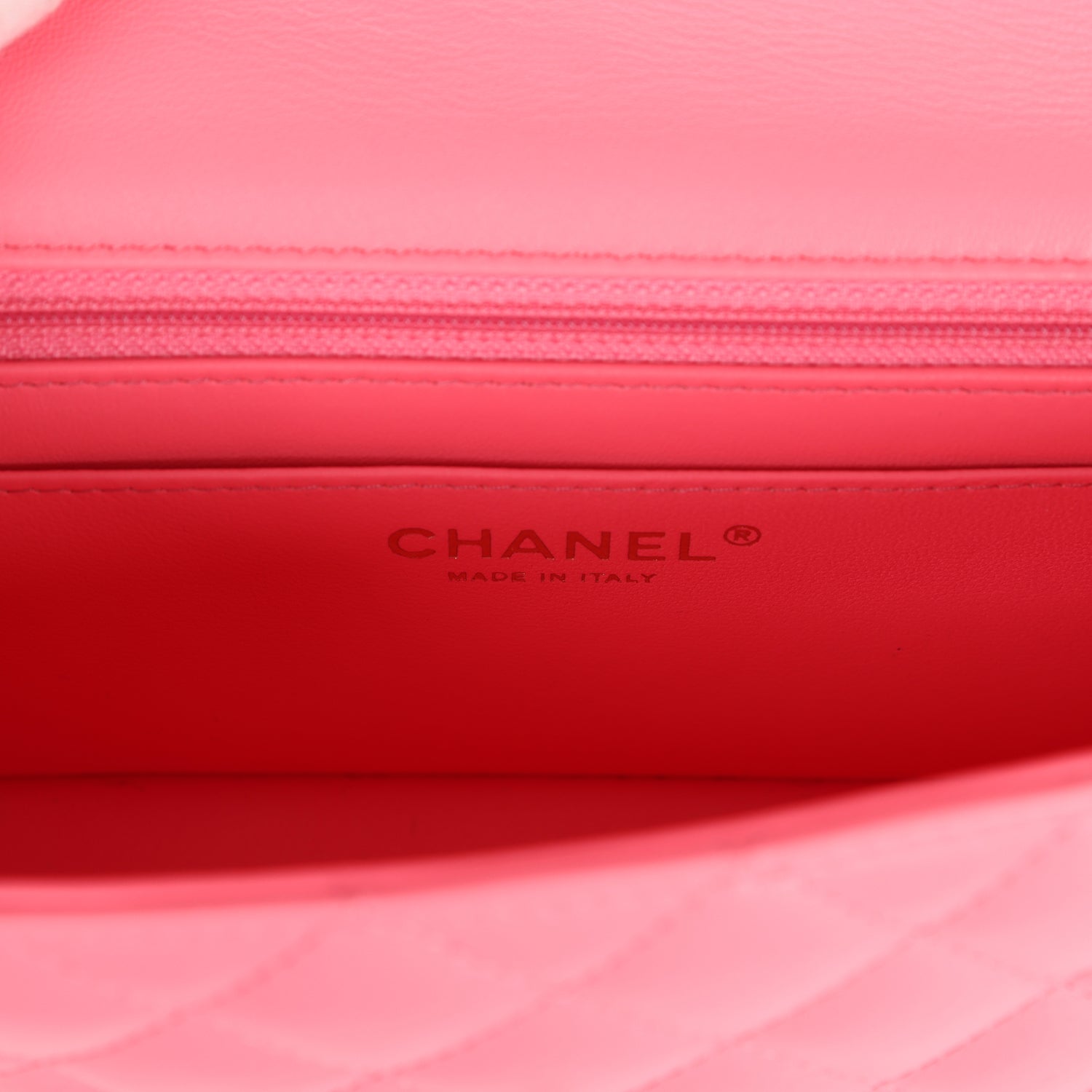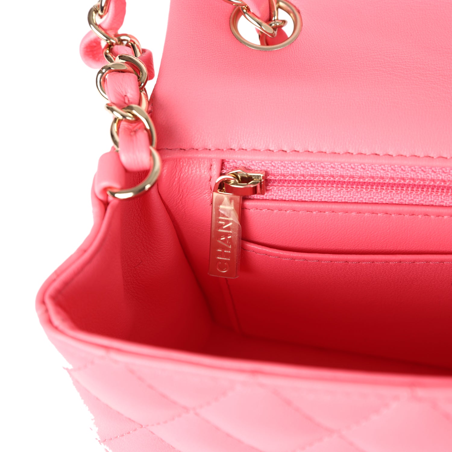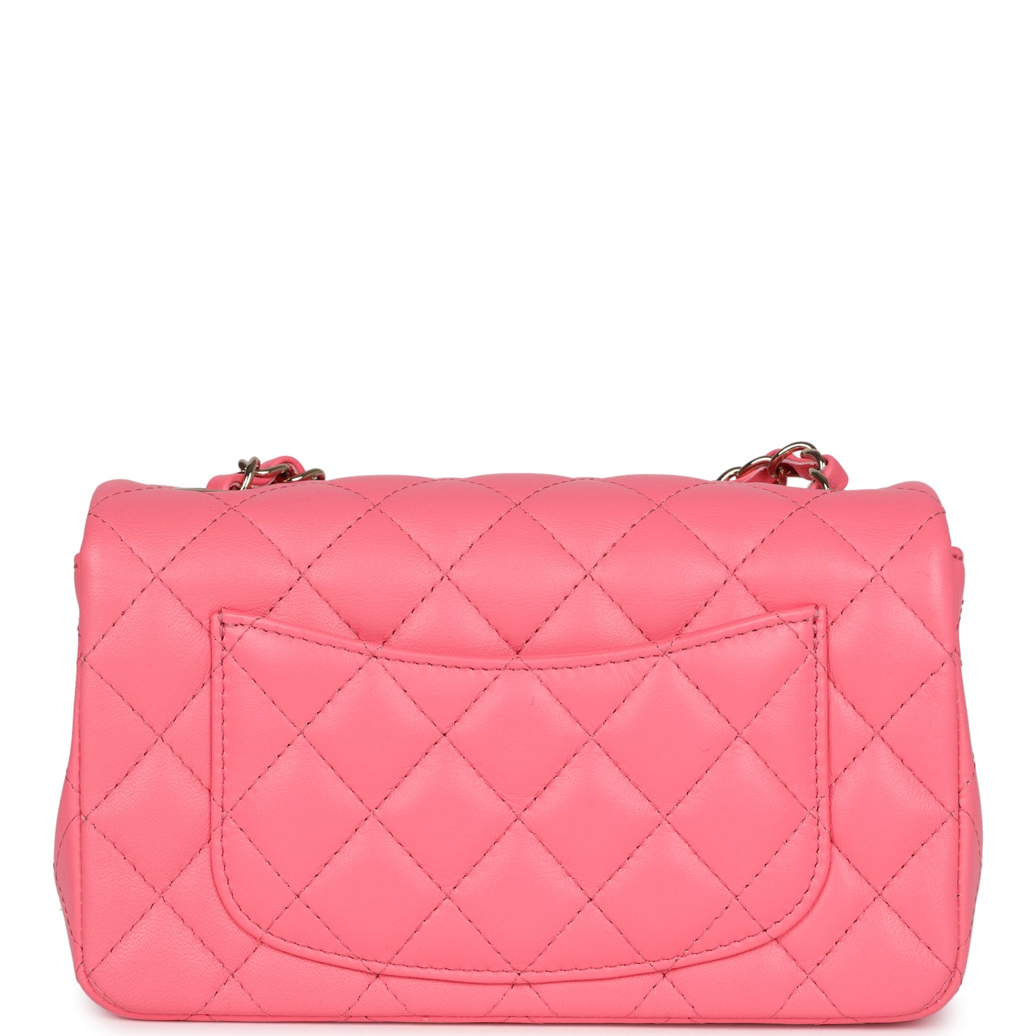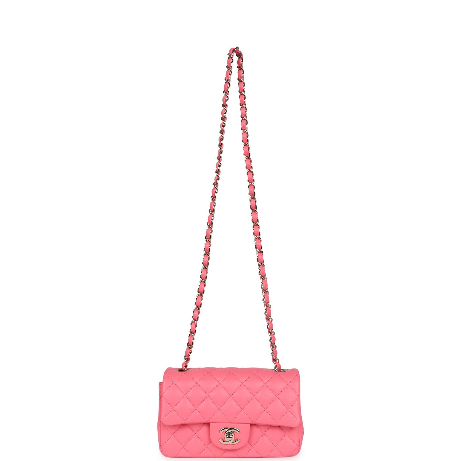 This Chanel Mini Classic Rectangular flap bag is of hot pink lambskin leather with light gold tone hardware and has a front flap with signature CC turnlock closure. rear half moon pocket. single interwoven hot pink leather and light gold chain link shoulder/crossbody strap.