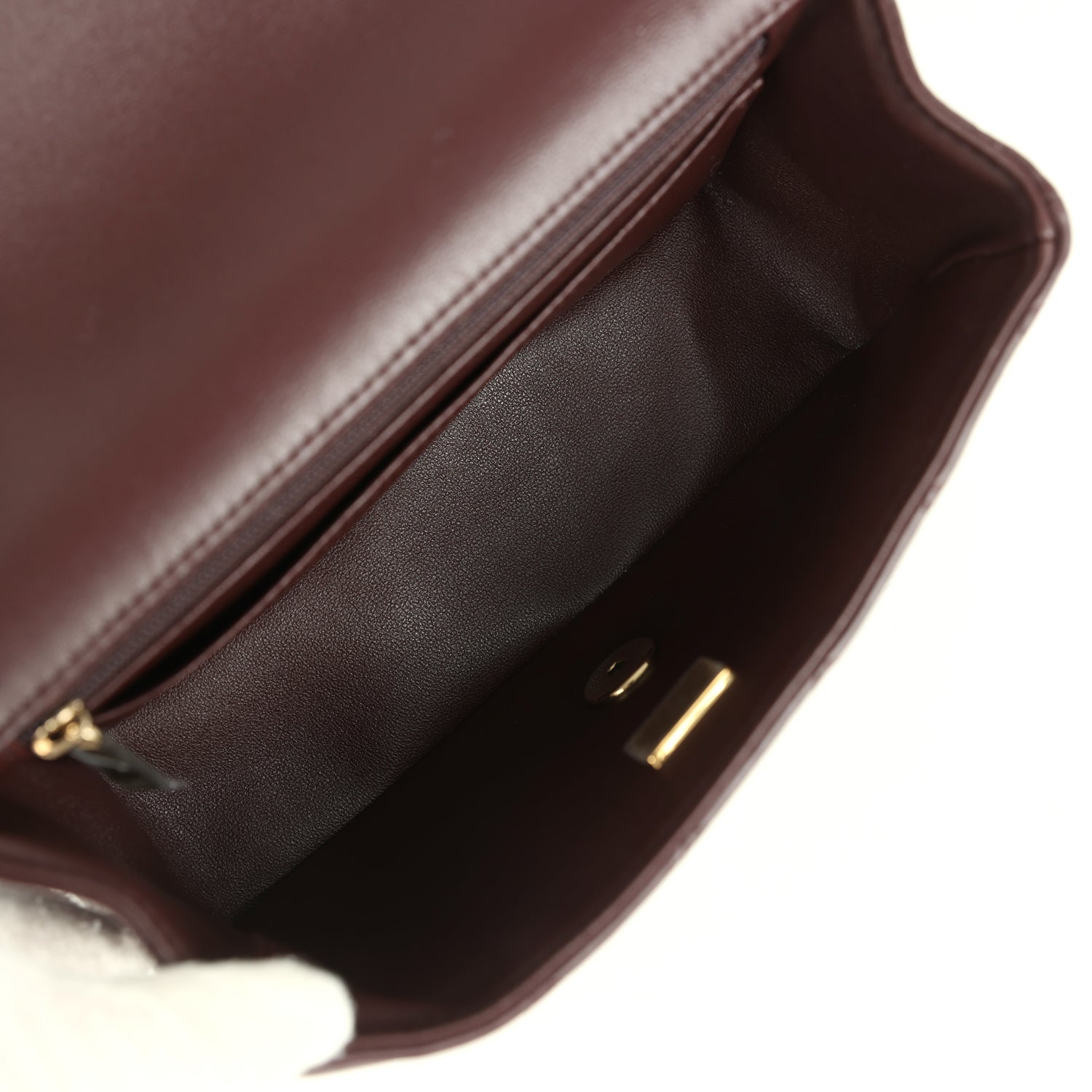 The interior is lined in dark brown leather and has one zip pocket on the rear wall with logo pull and one open one slit pocket.
