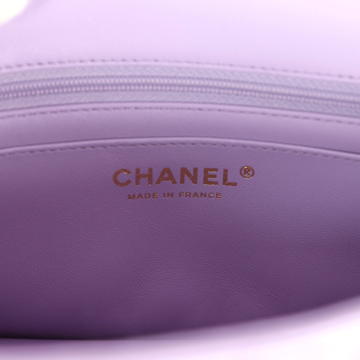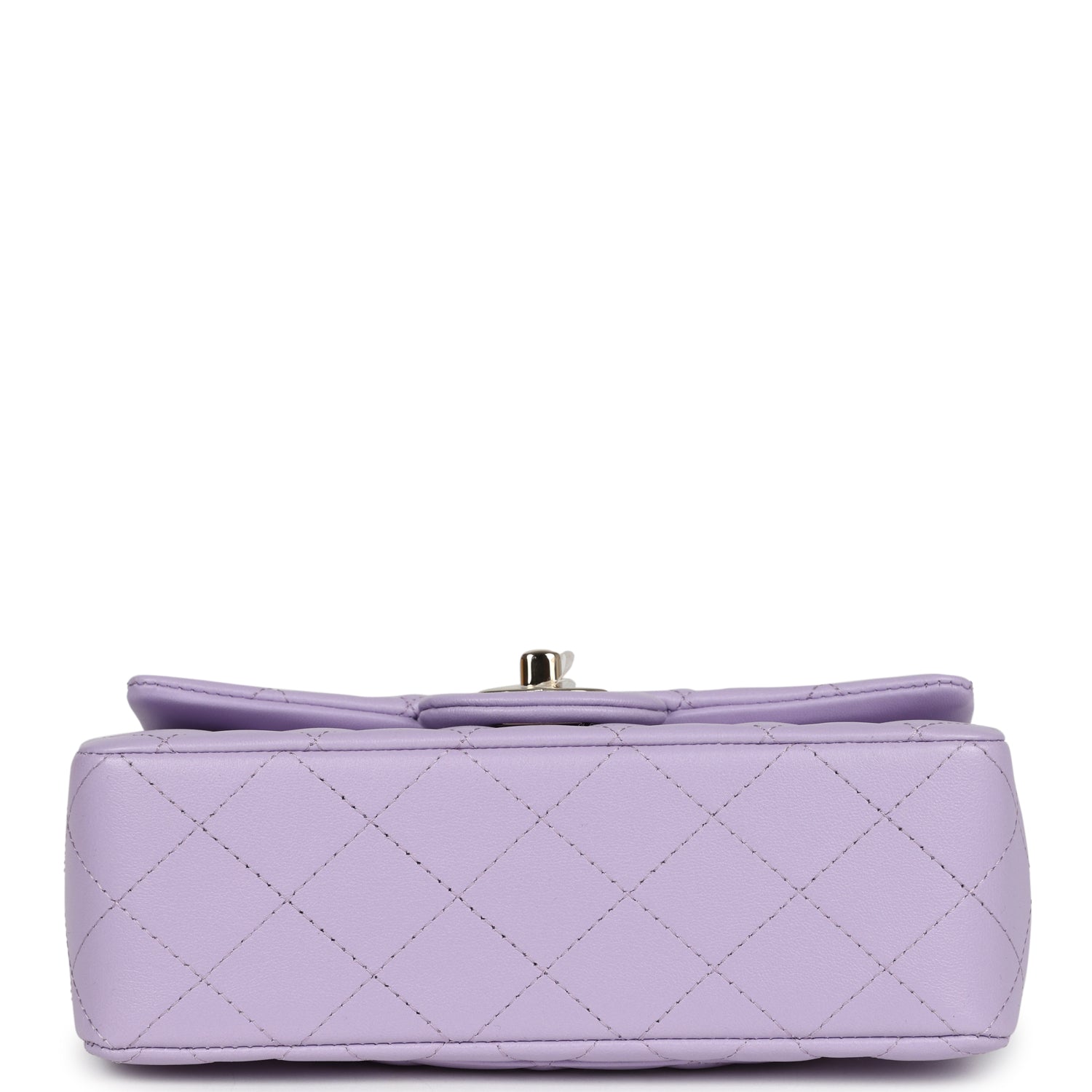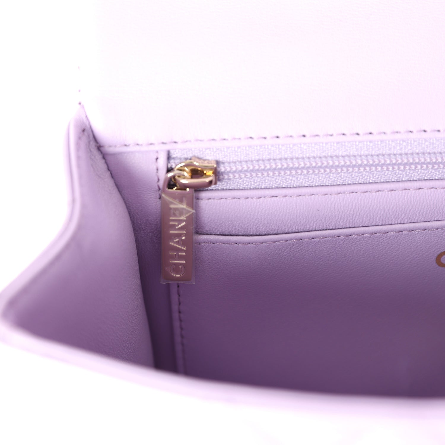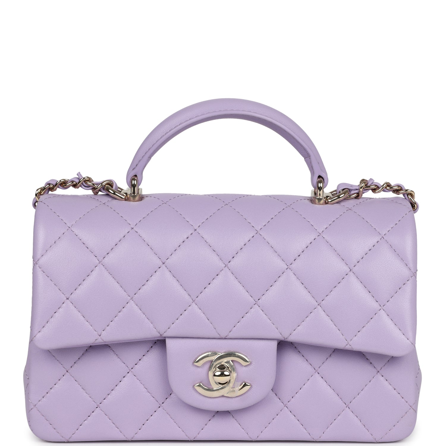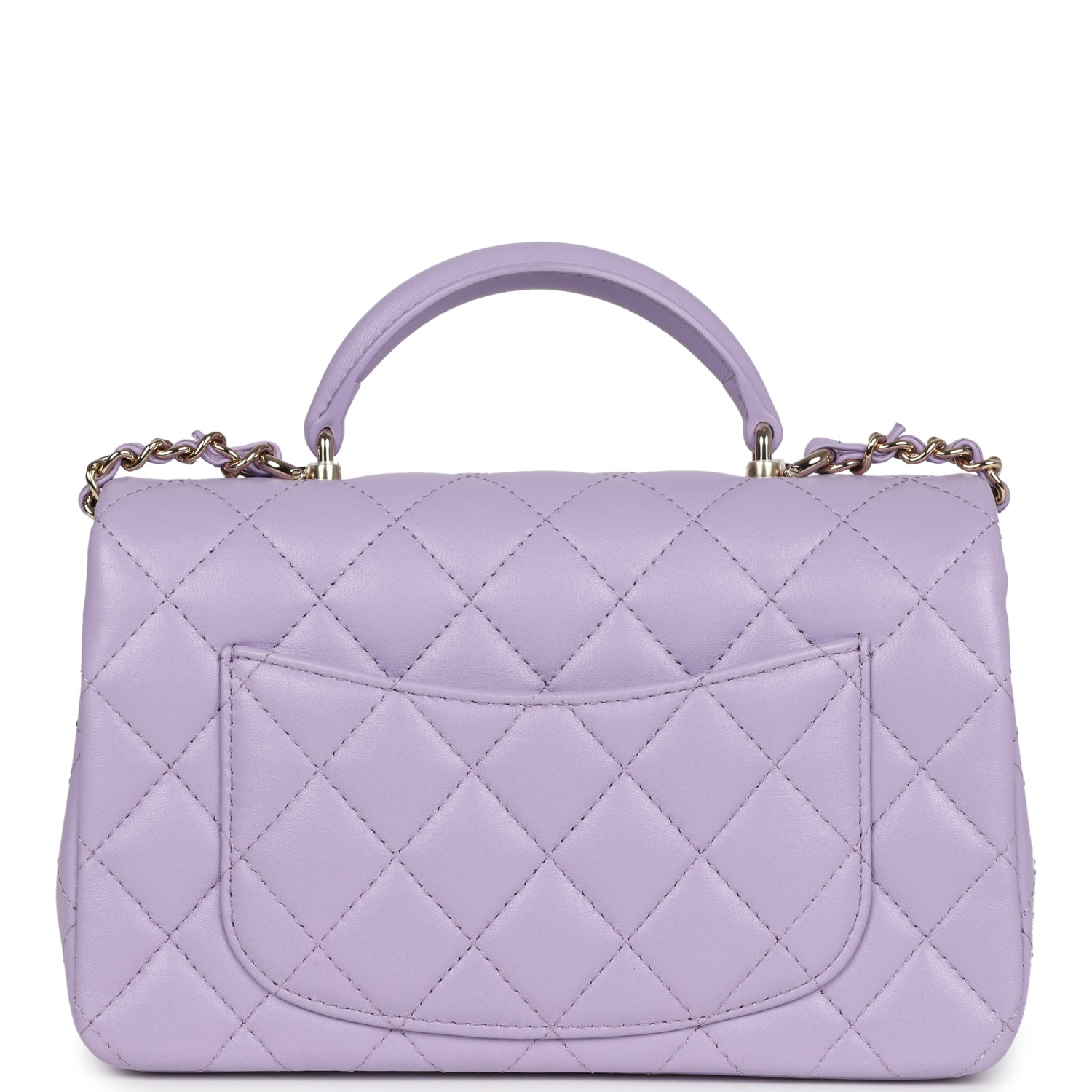 This mini Chanel rectangular flap bag with top handle is in lilac lambskin with light gold tone hardware has a front flap with signature CC turnlock closure. rear half moon pocket. top handle and single interwoven lilac leather and light gold tone chain link shoulder/crossbody strap.