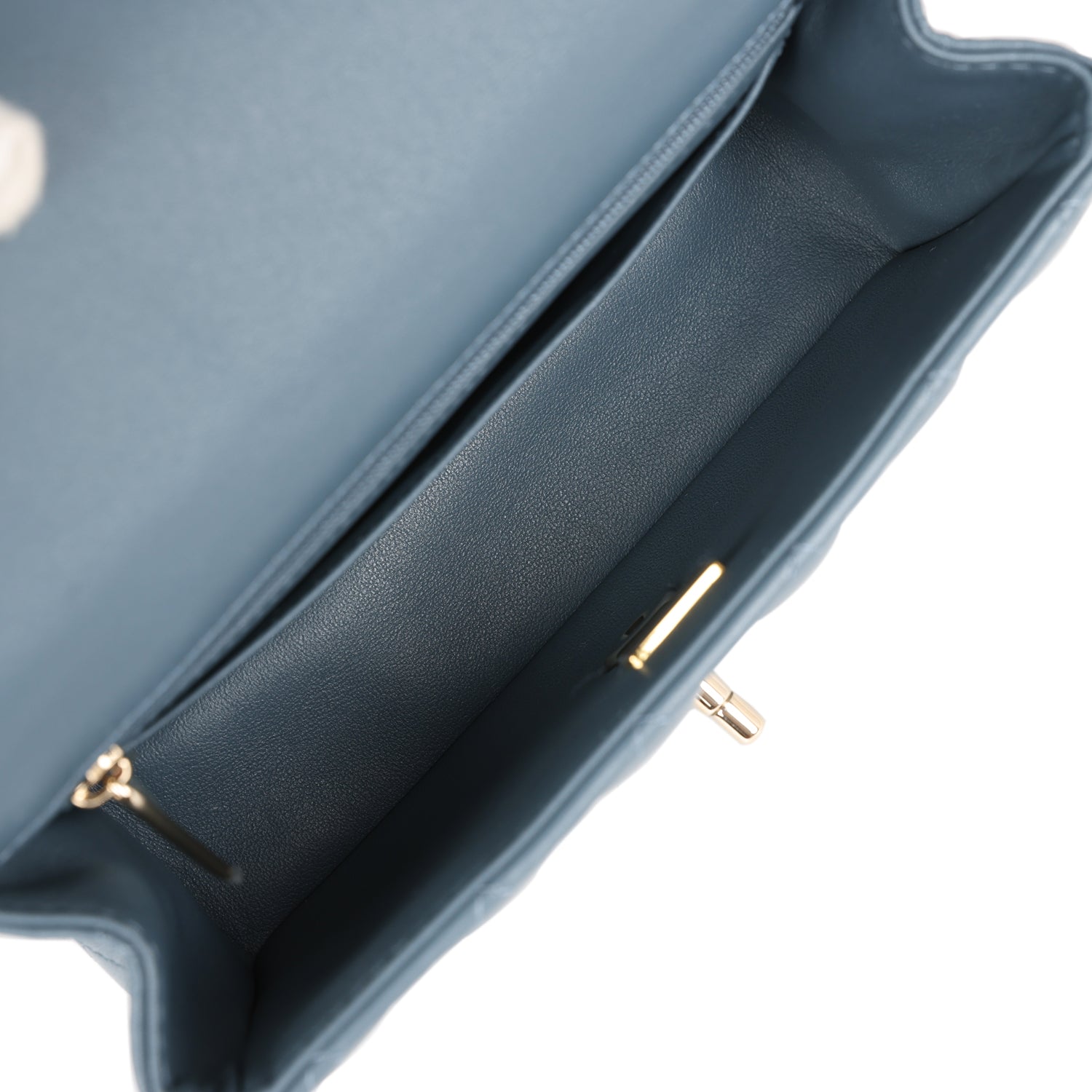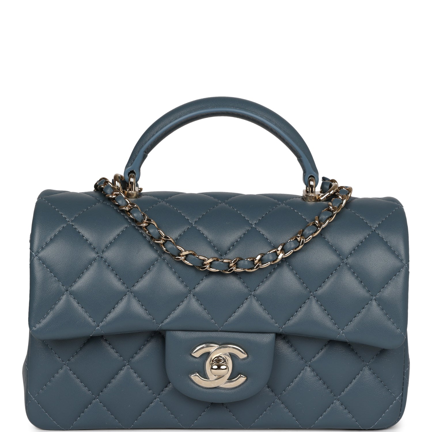 This Mini Rectangular Top Handle Flap bag is in Blue Lambskin with light gold hardware. front flap with CC turnlock closure. half moon back pocket and an interwoven light gold tone chain link and blue leather shoulder/crossbody strap.