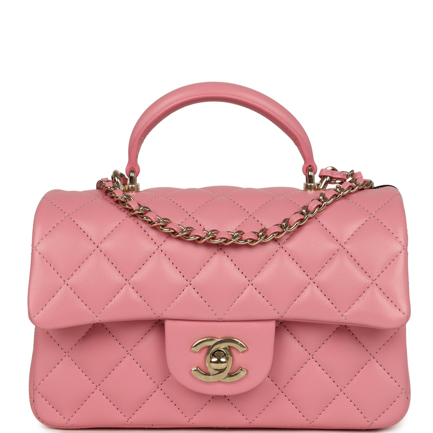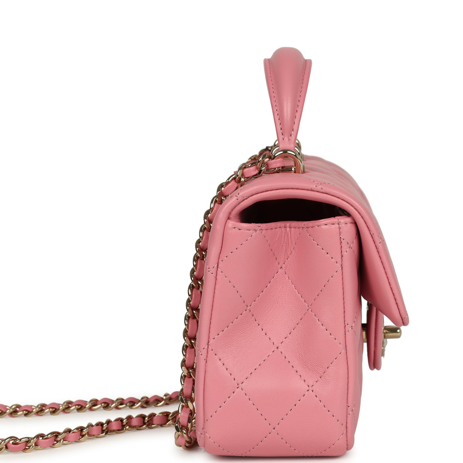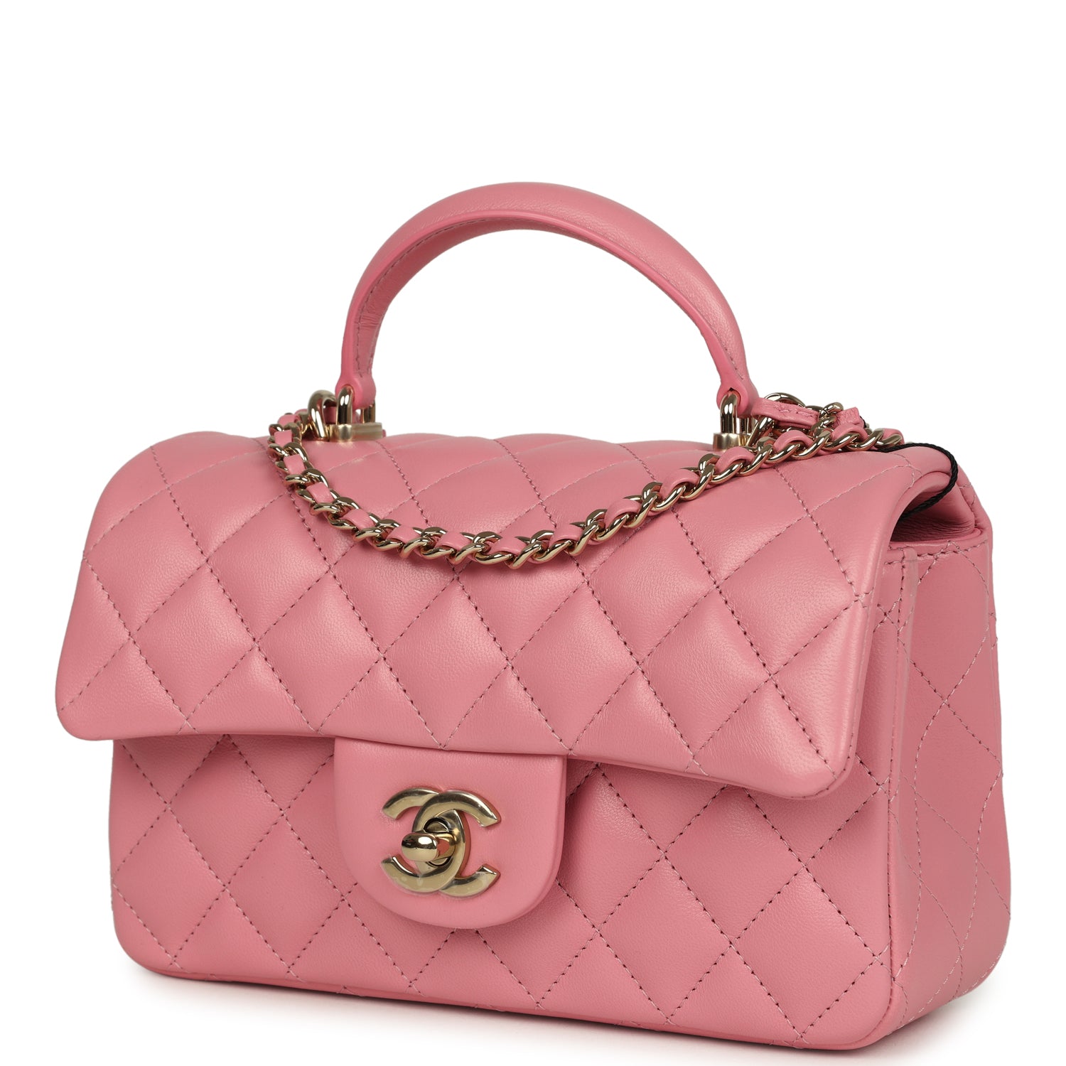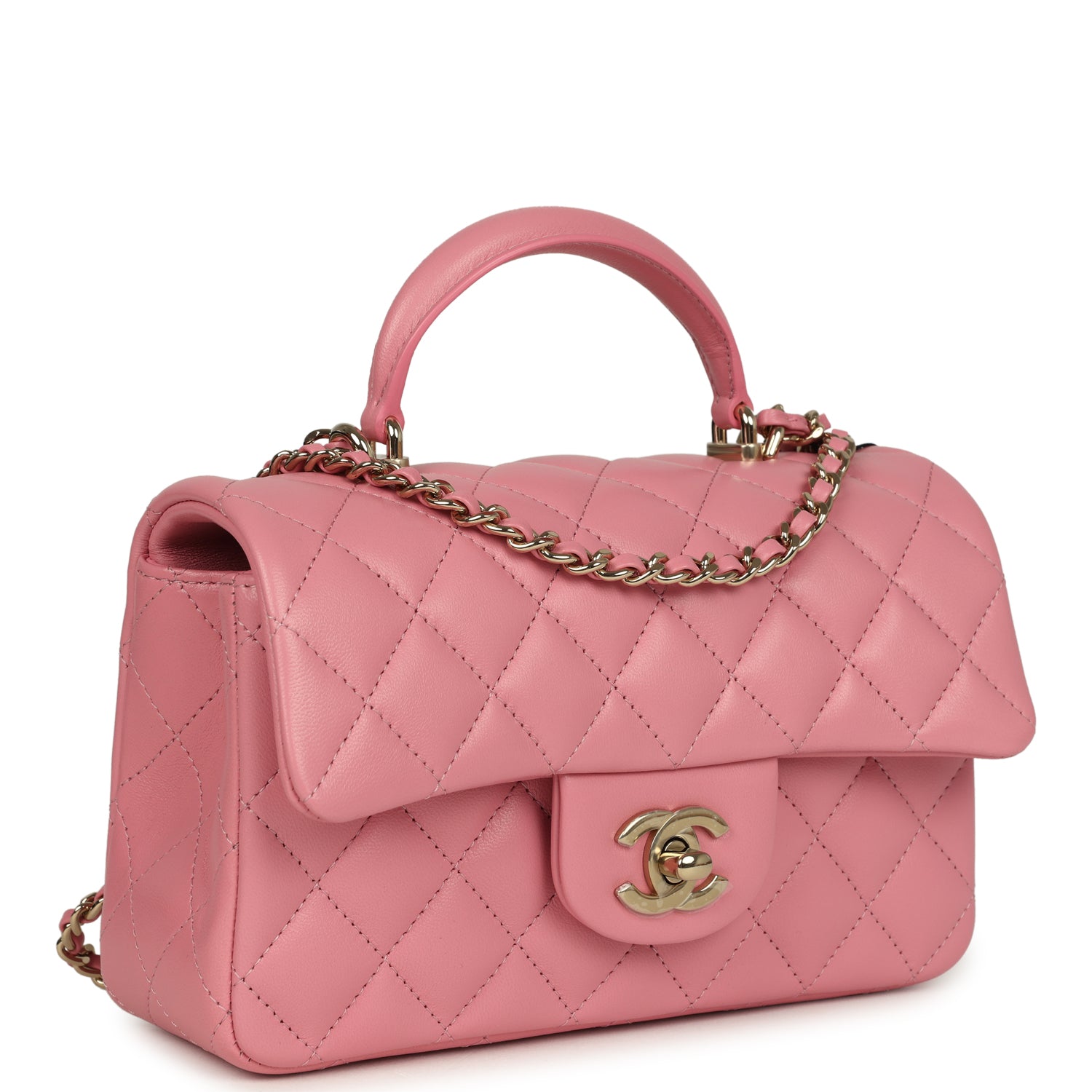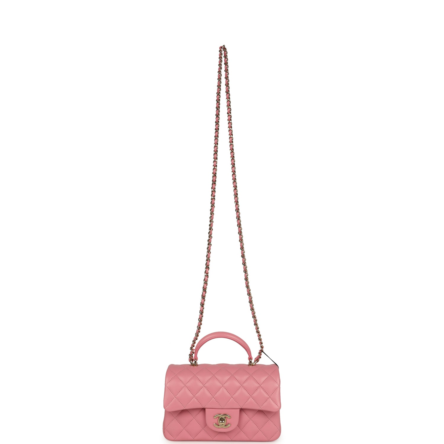 This Mini Classic Rectangular Top Handle Flap Bag is in pink Lambskin leather with light gold tone hardware and has a front flap with signature CC turnlock closure. rear half moon pocket. top handle and single interwoven pink leather and light gold tone chain link shoulder/crossbody strap.