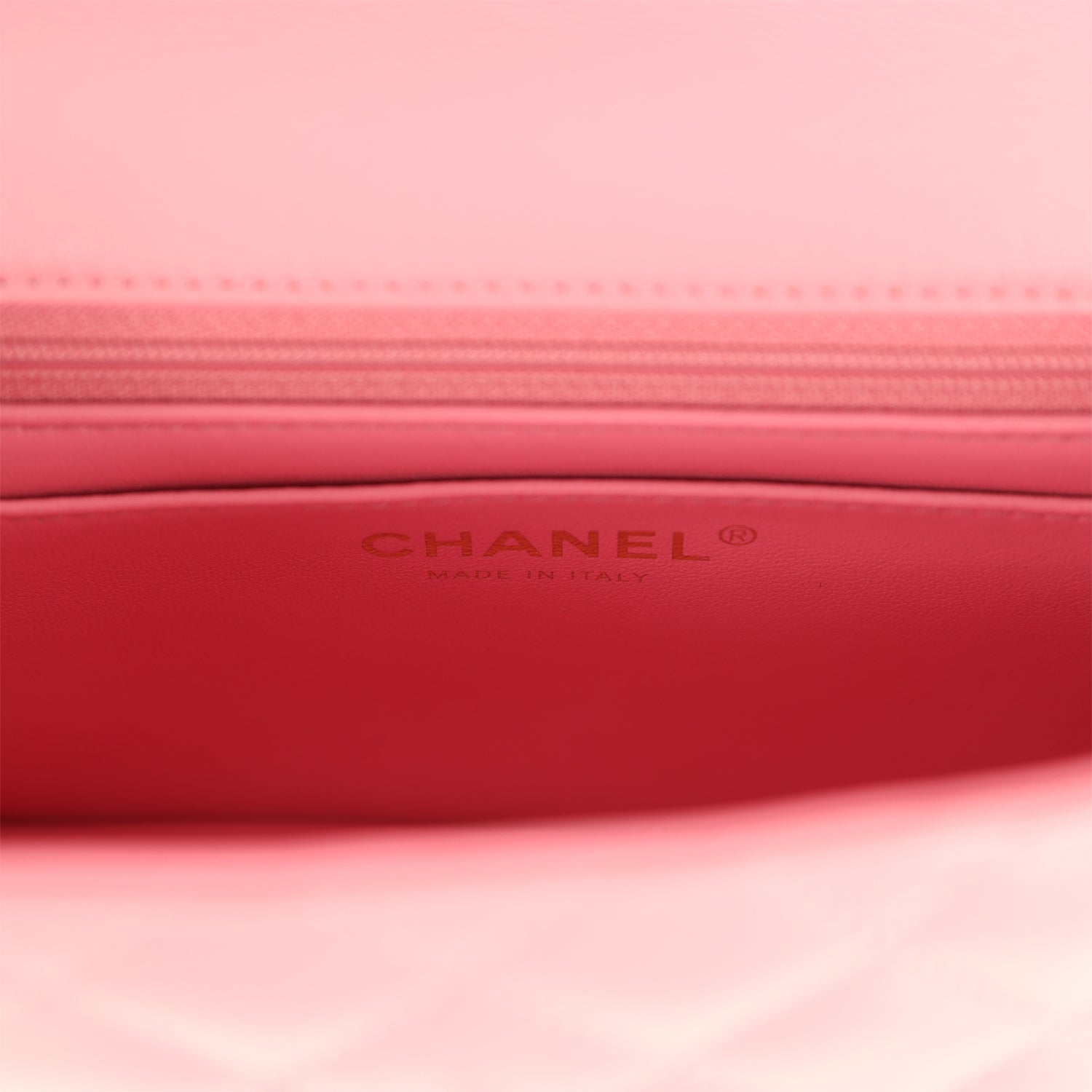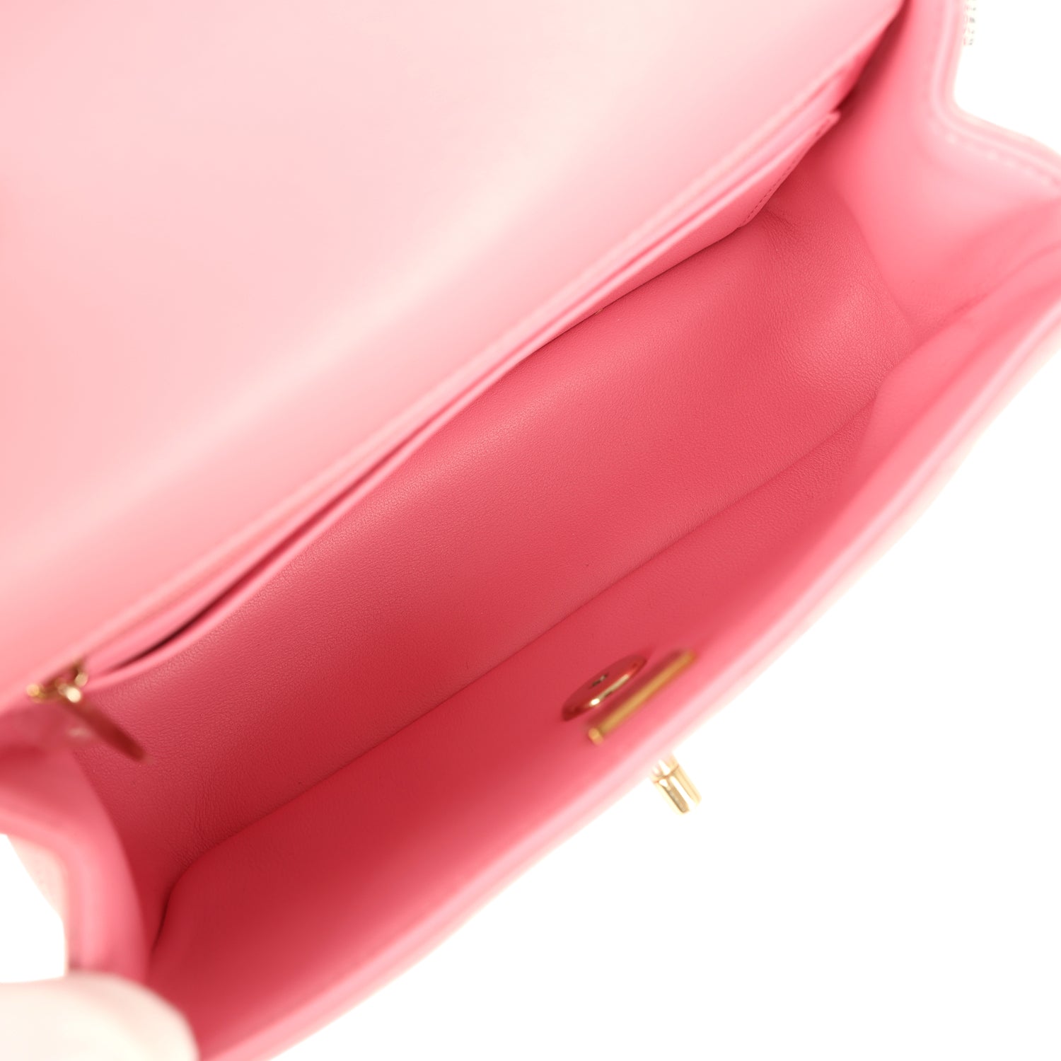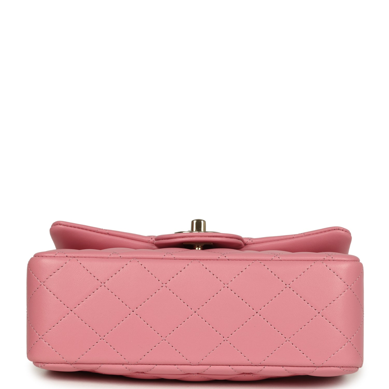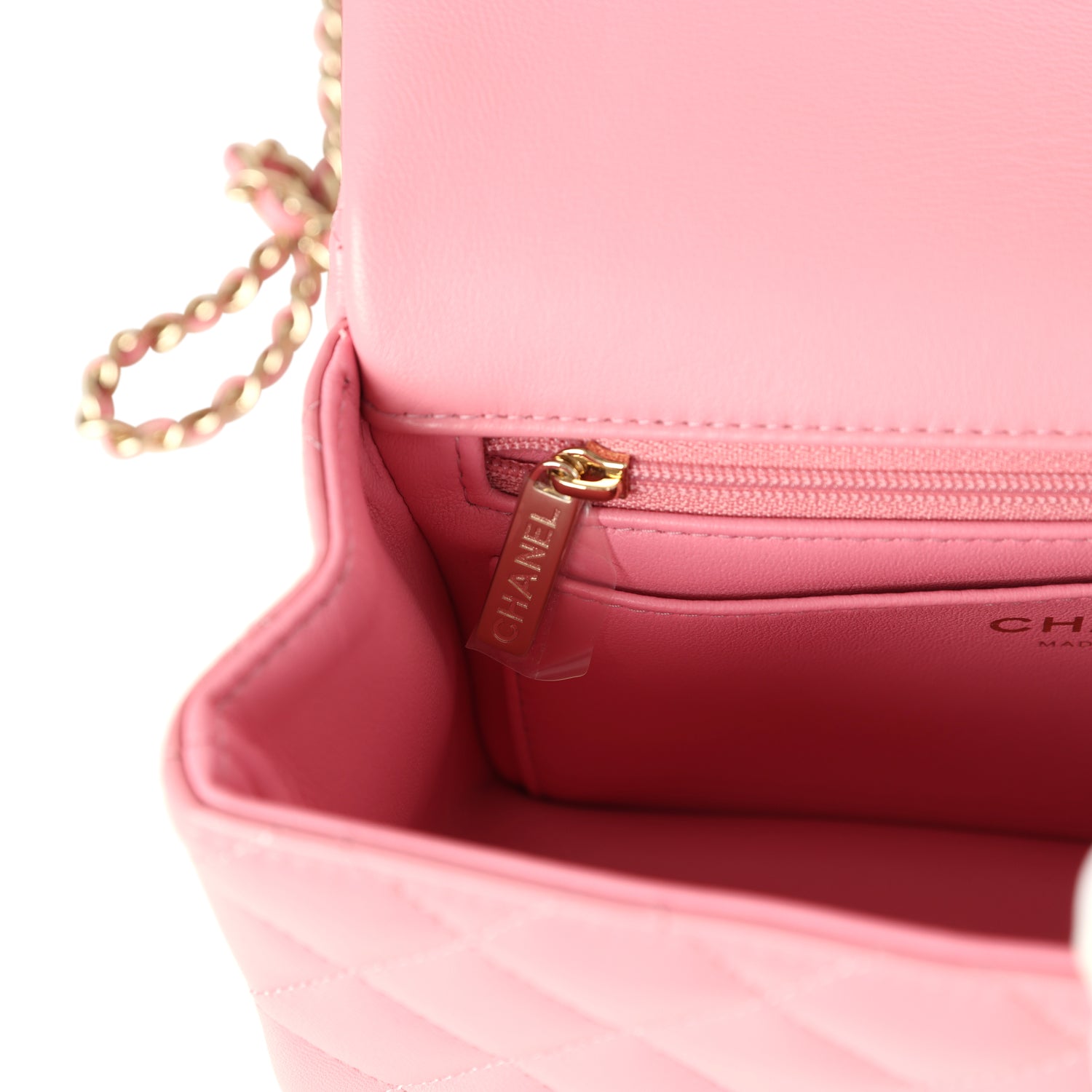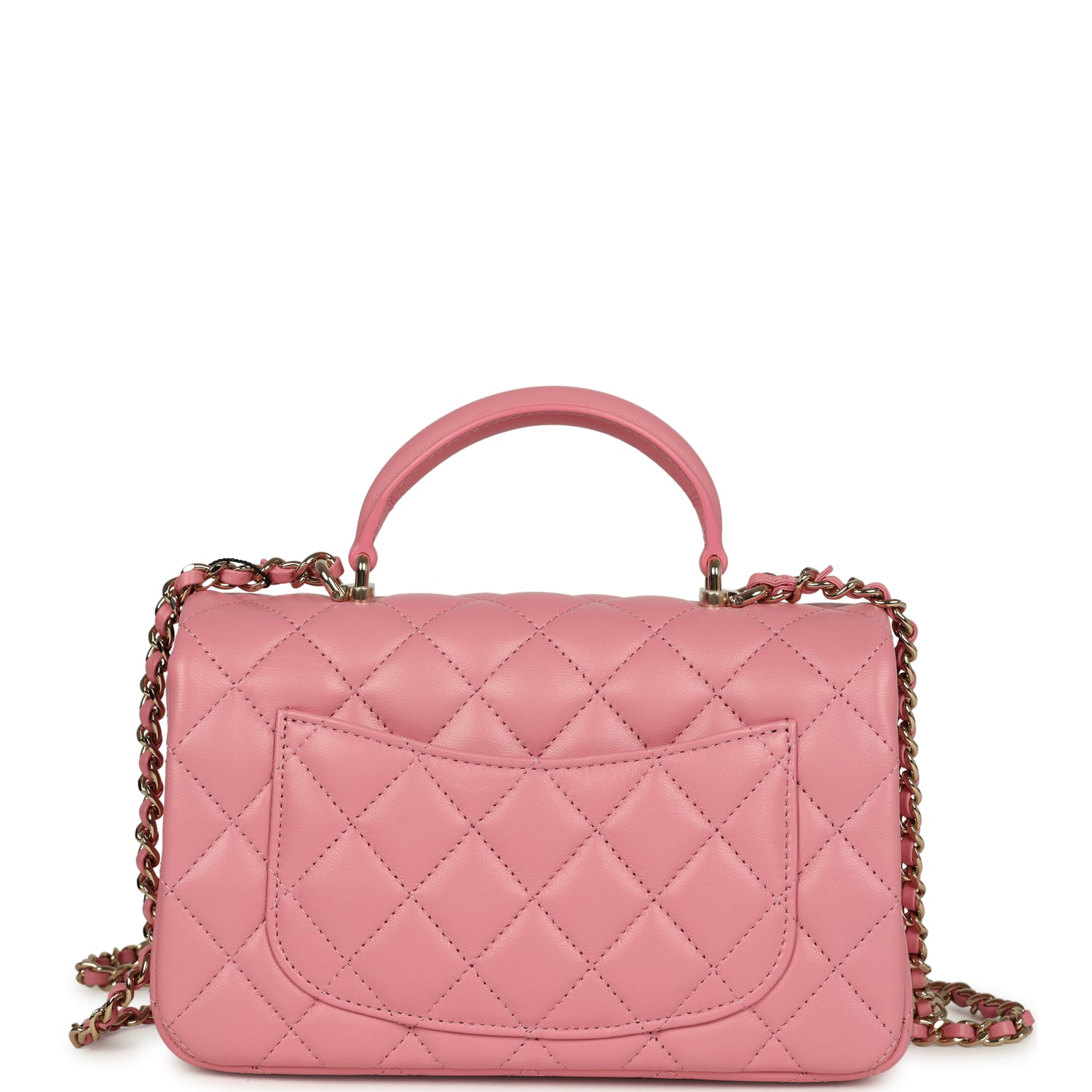 This Mini Classic Rectangular Top Handle Flap Bag is in pink Lambskin leather with light gold tone hardware and has a front flap with signature CC turnlock closure. rear half moon pocket. top handle and single interwoven pink leather and light gold tone chain link shoulder/crossbody strap.