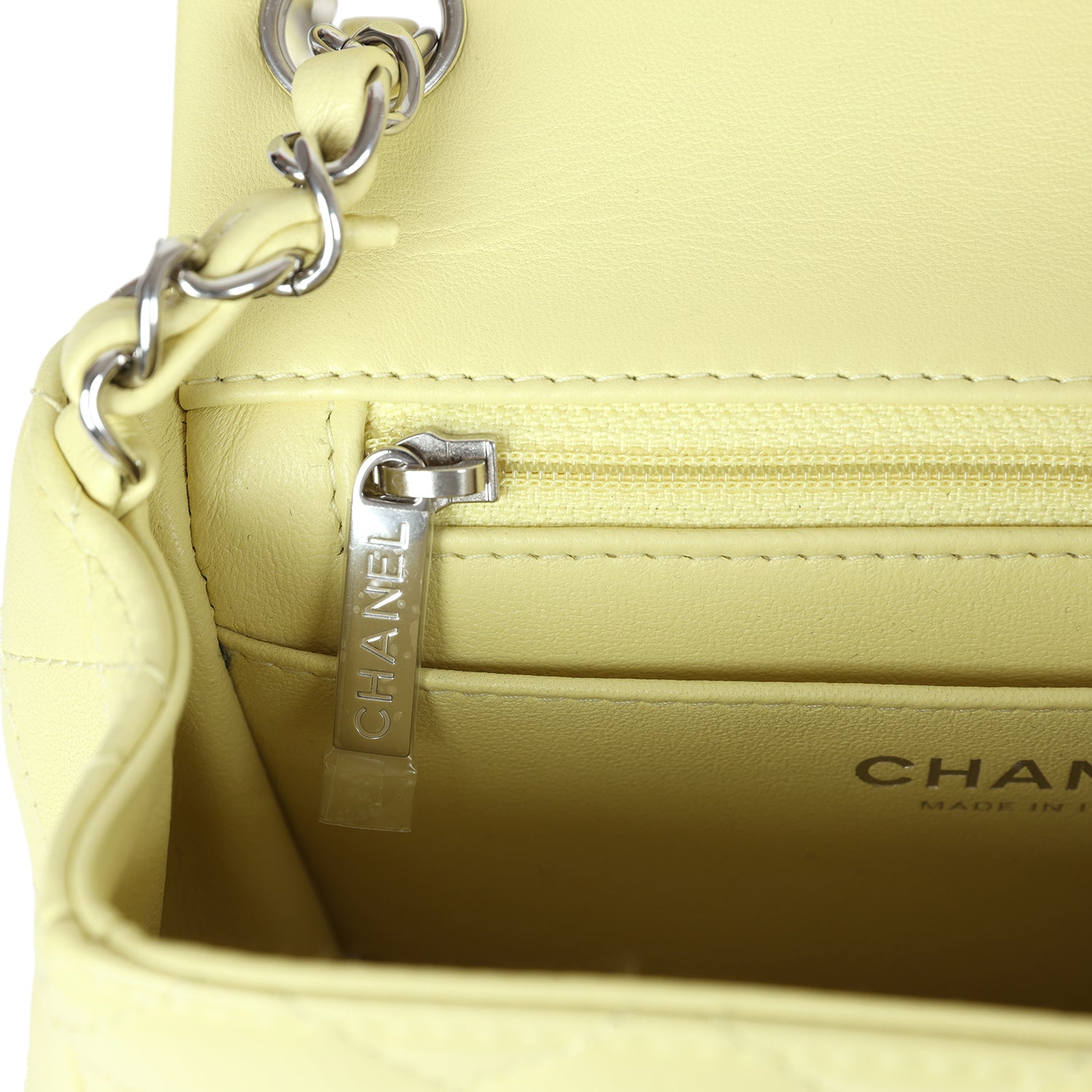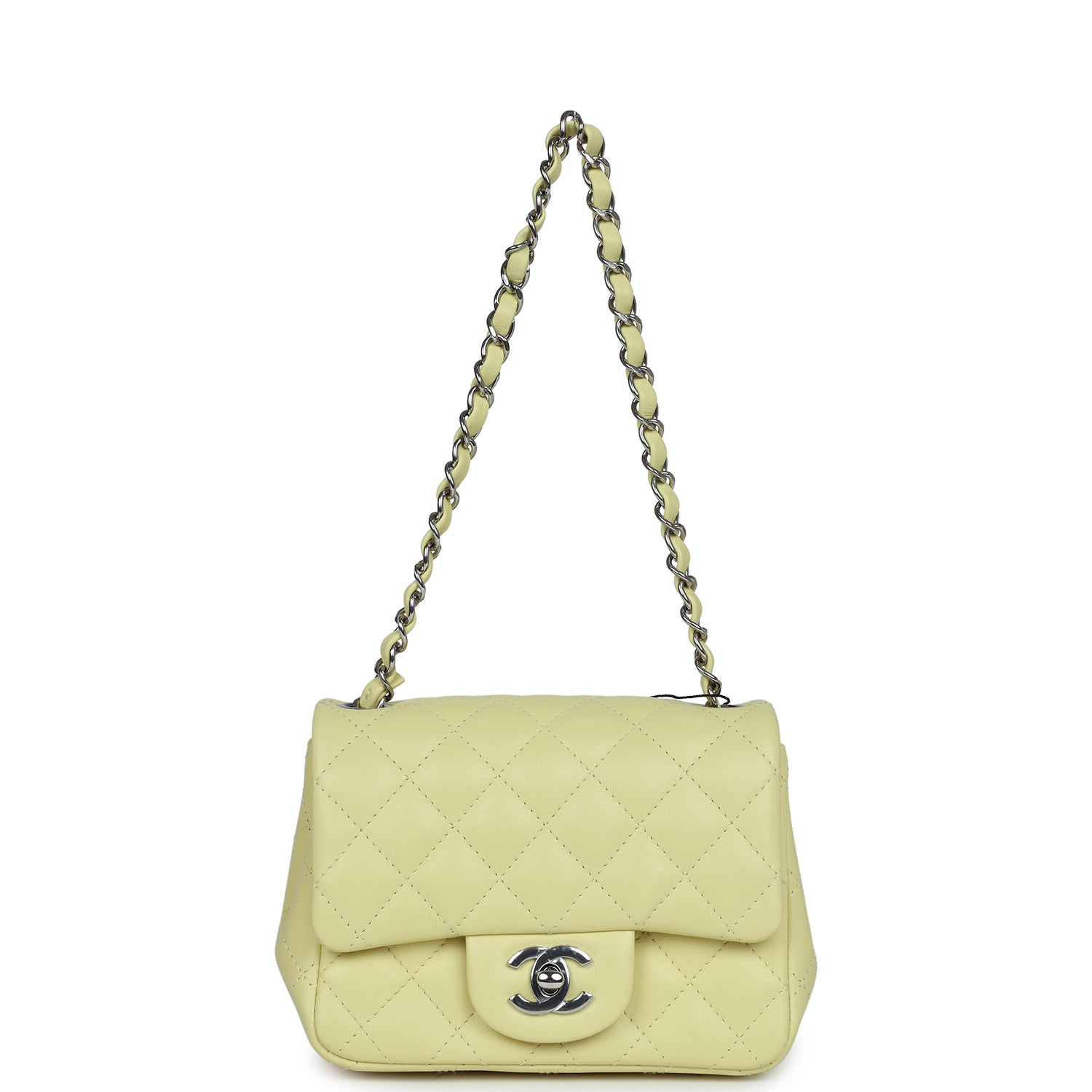 This Mini Square flap bag is in lime lambskin with silver tone hardware and has a front flap with signature CC turnlock closure. rear half moon pocket and single interwoven lime leather and silver tone chain link shoulder/crossbody strap.