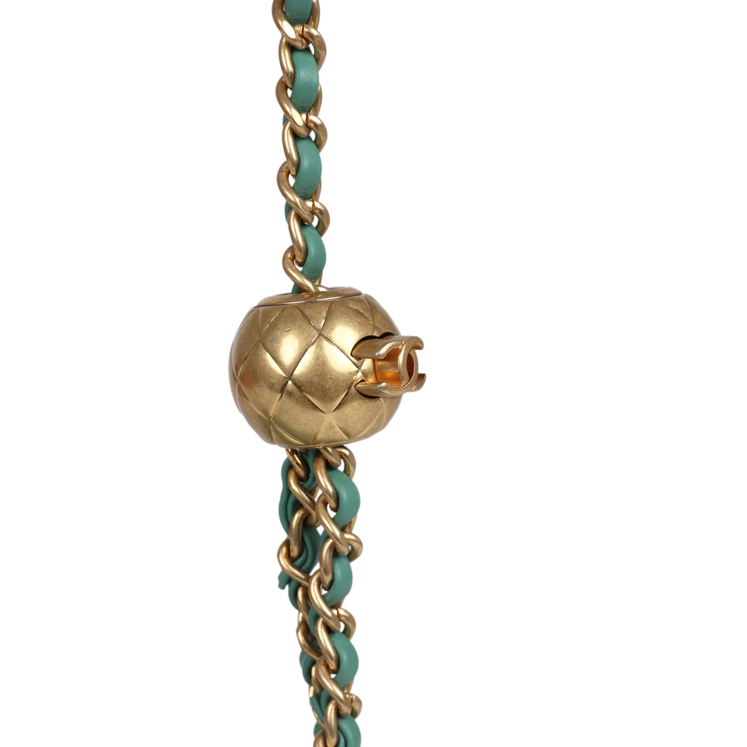 The interior is lined in green lambskin leather and features a zipper pocket with Chanel pull and an open pocket below.